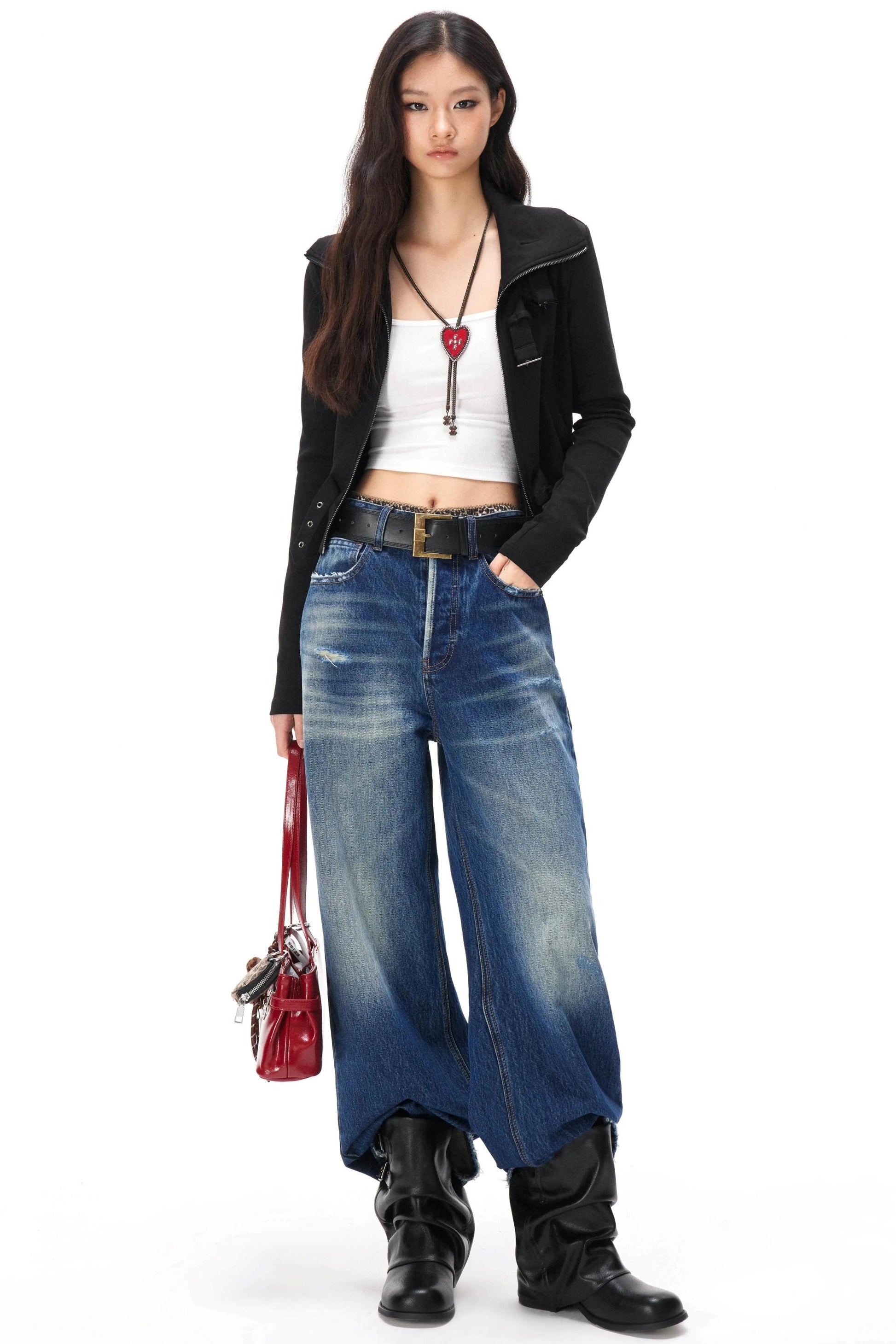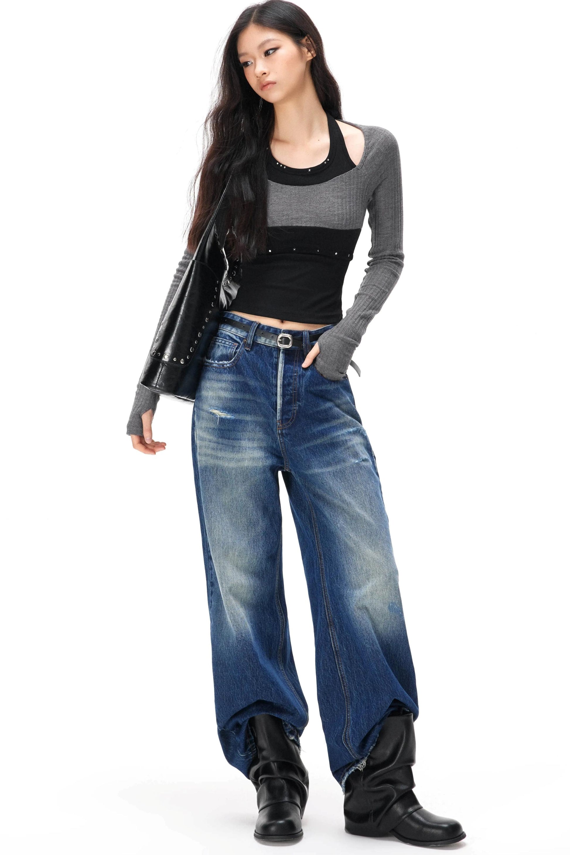 Amerikanische, locker fallende Jeanshose im Used-Look