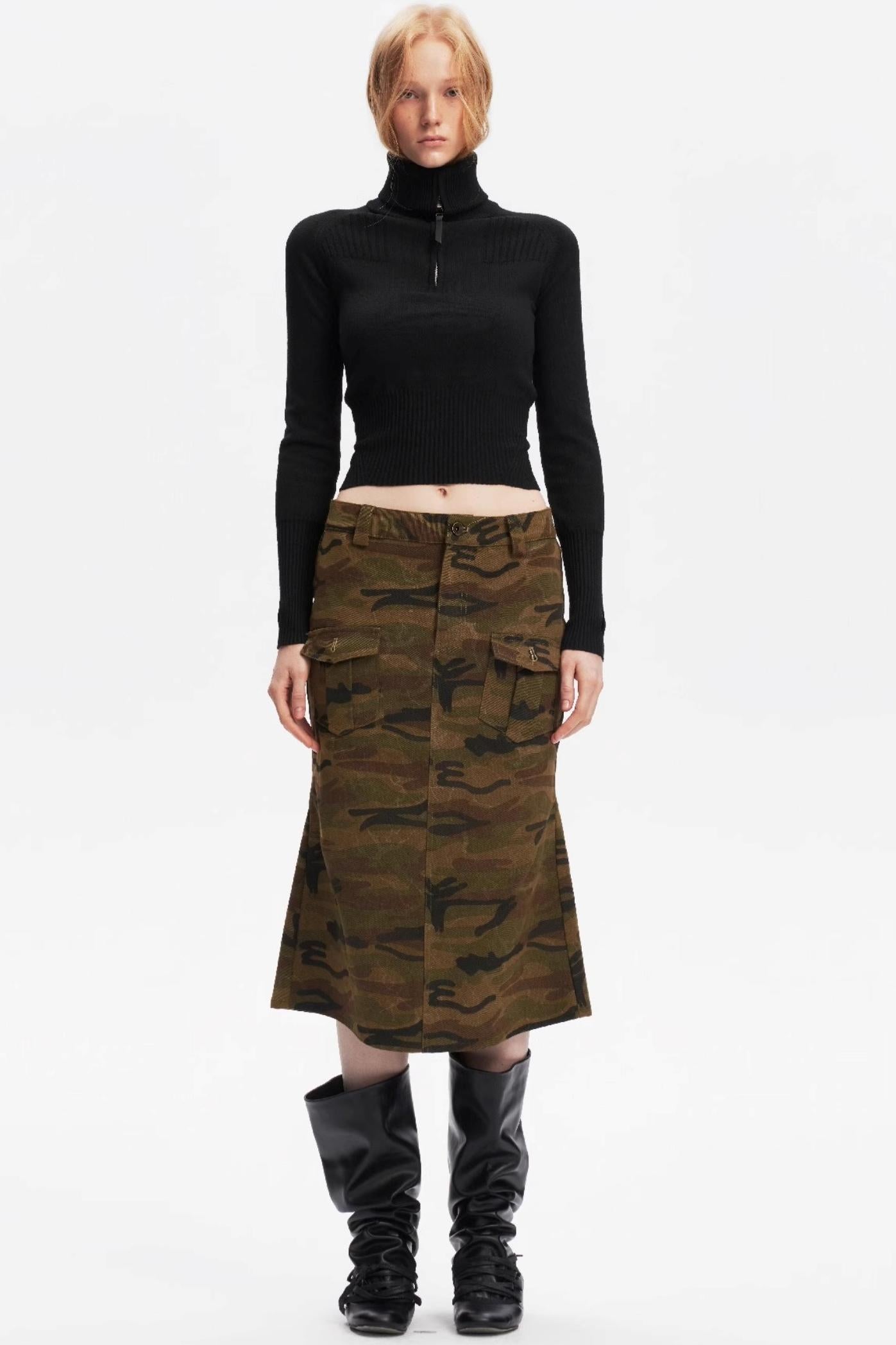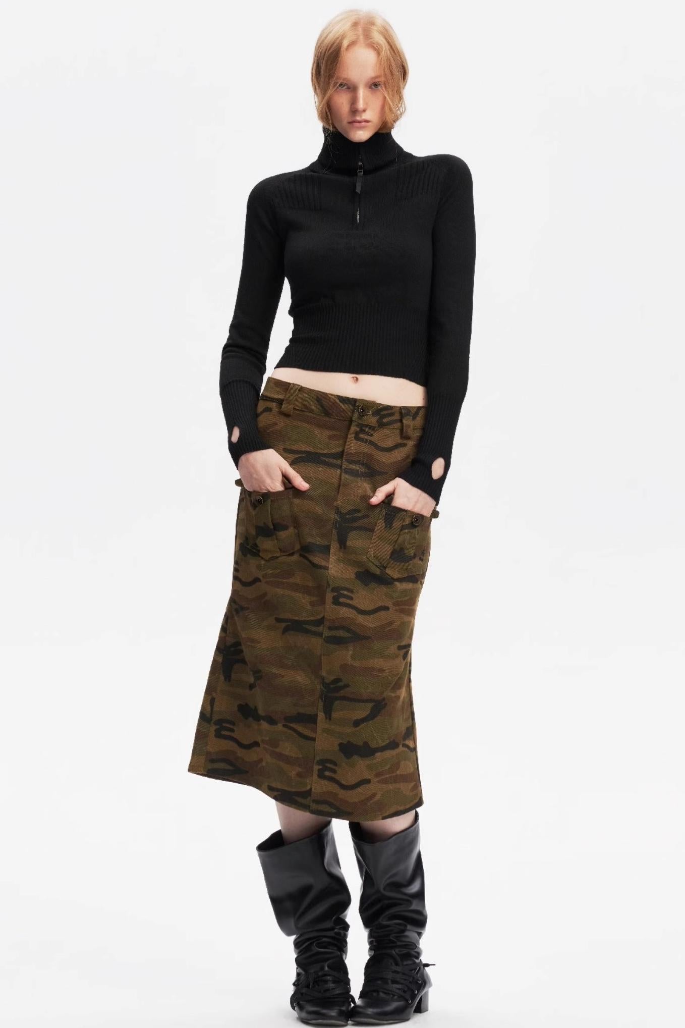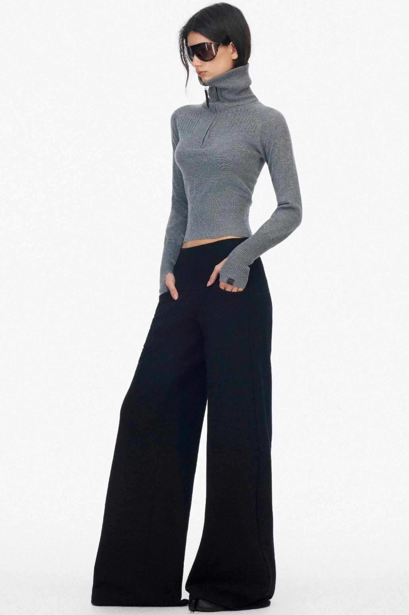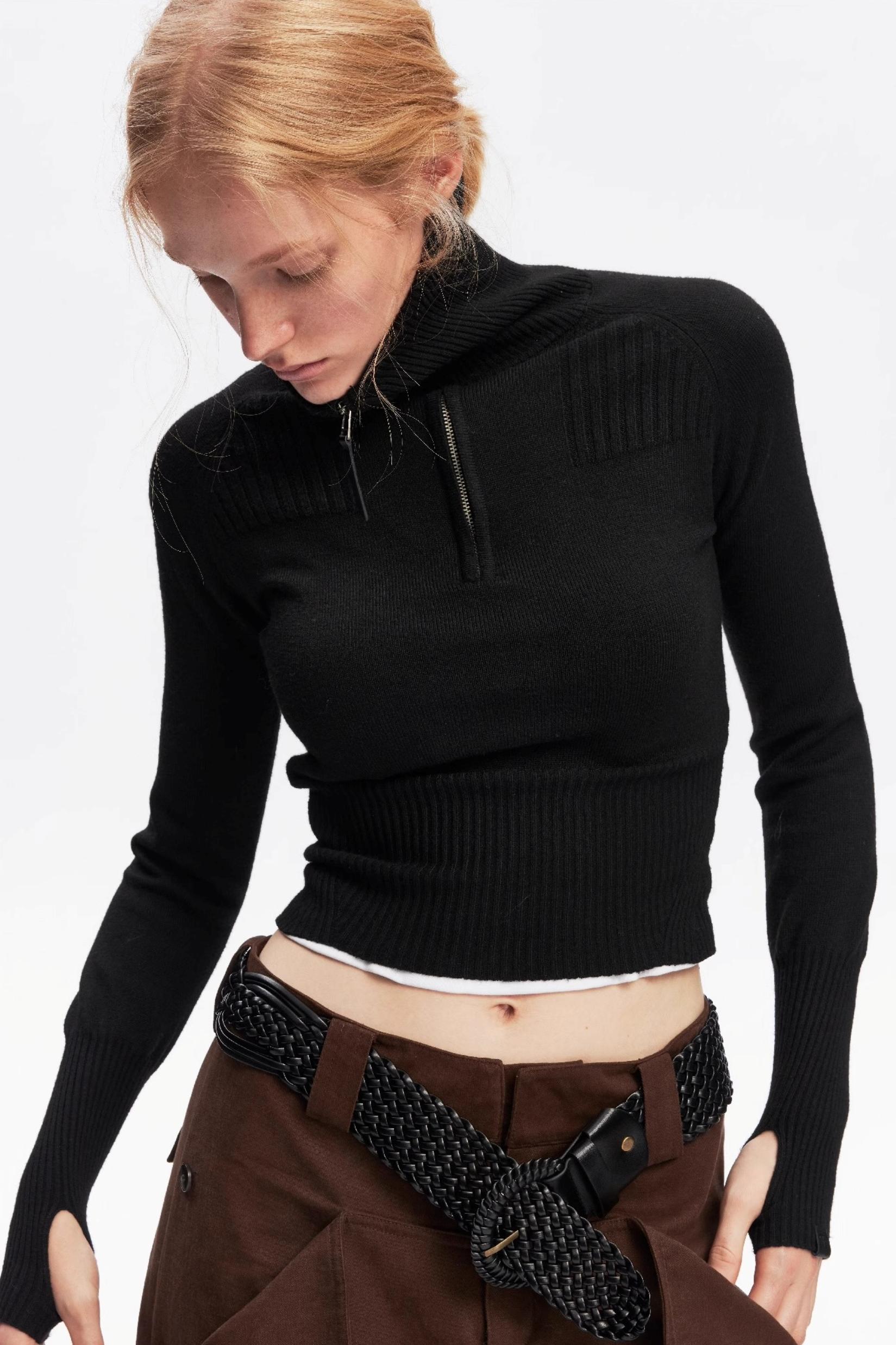 Half-Turtleneck Zip-Up Knitted Design Top