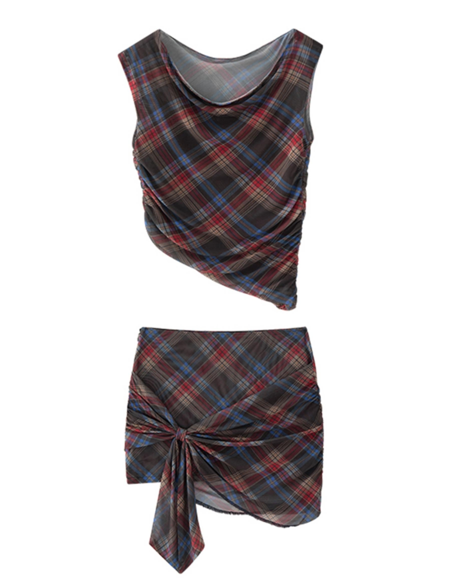 Retro Plaid Mesh Shoulder Wrap Skirt Set-Up