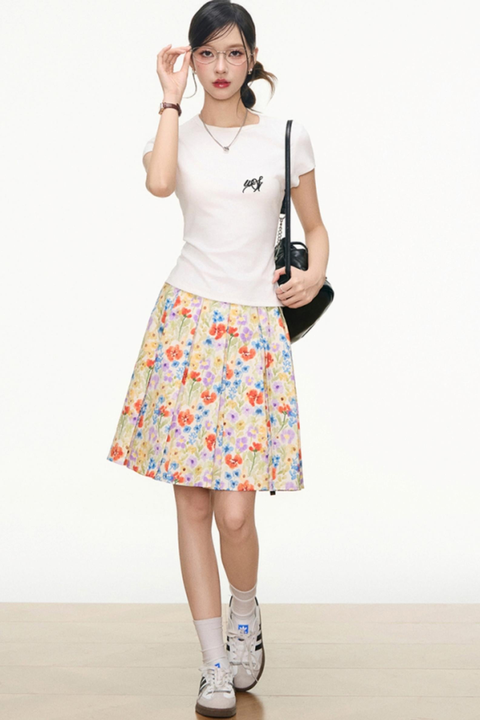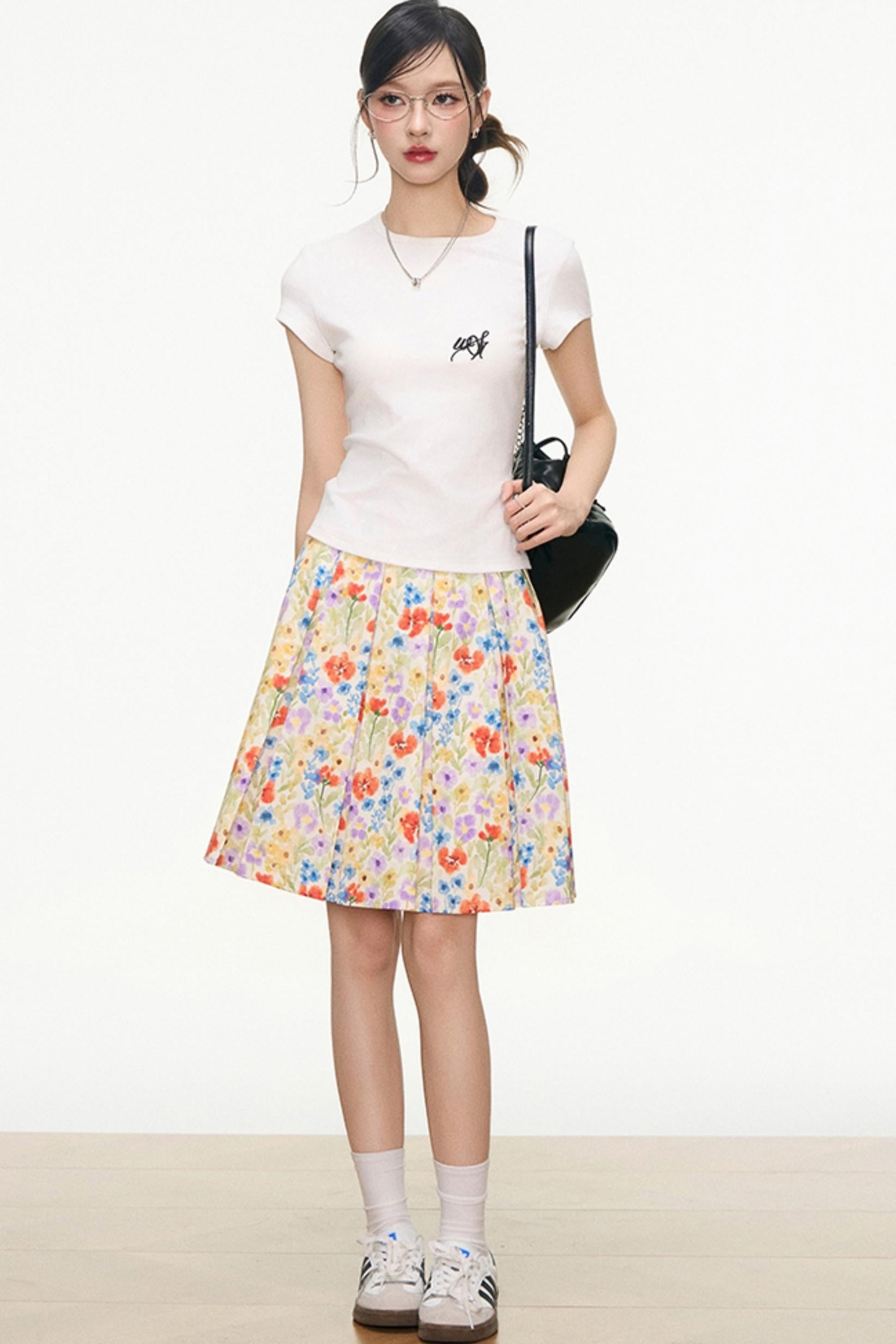 White Floral Skirt And White T-Shirt Set-Up