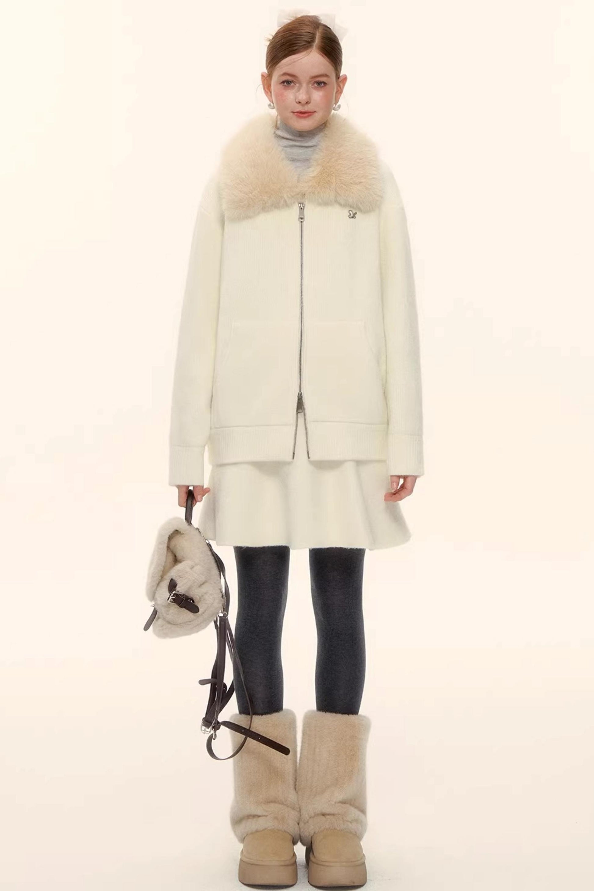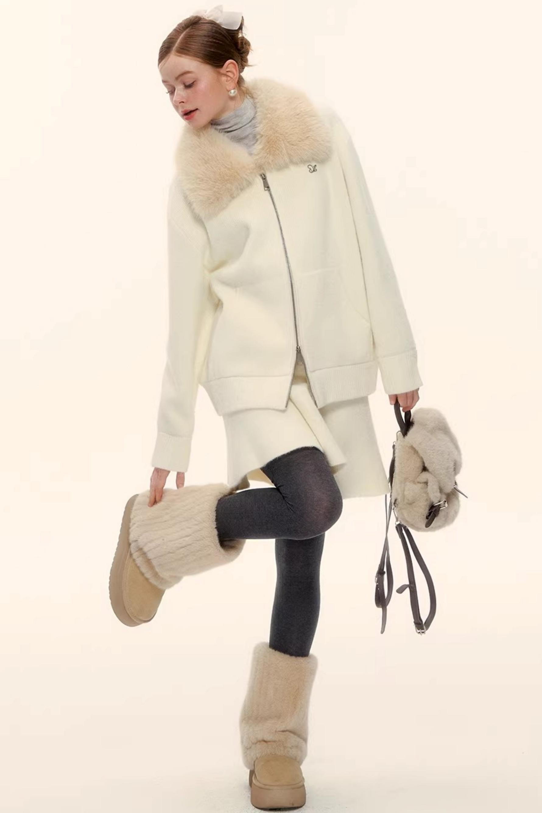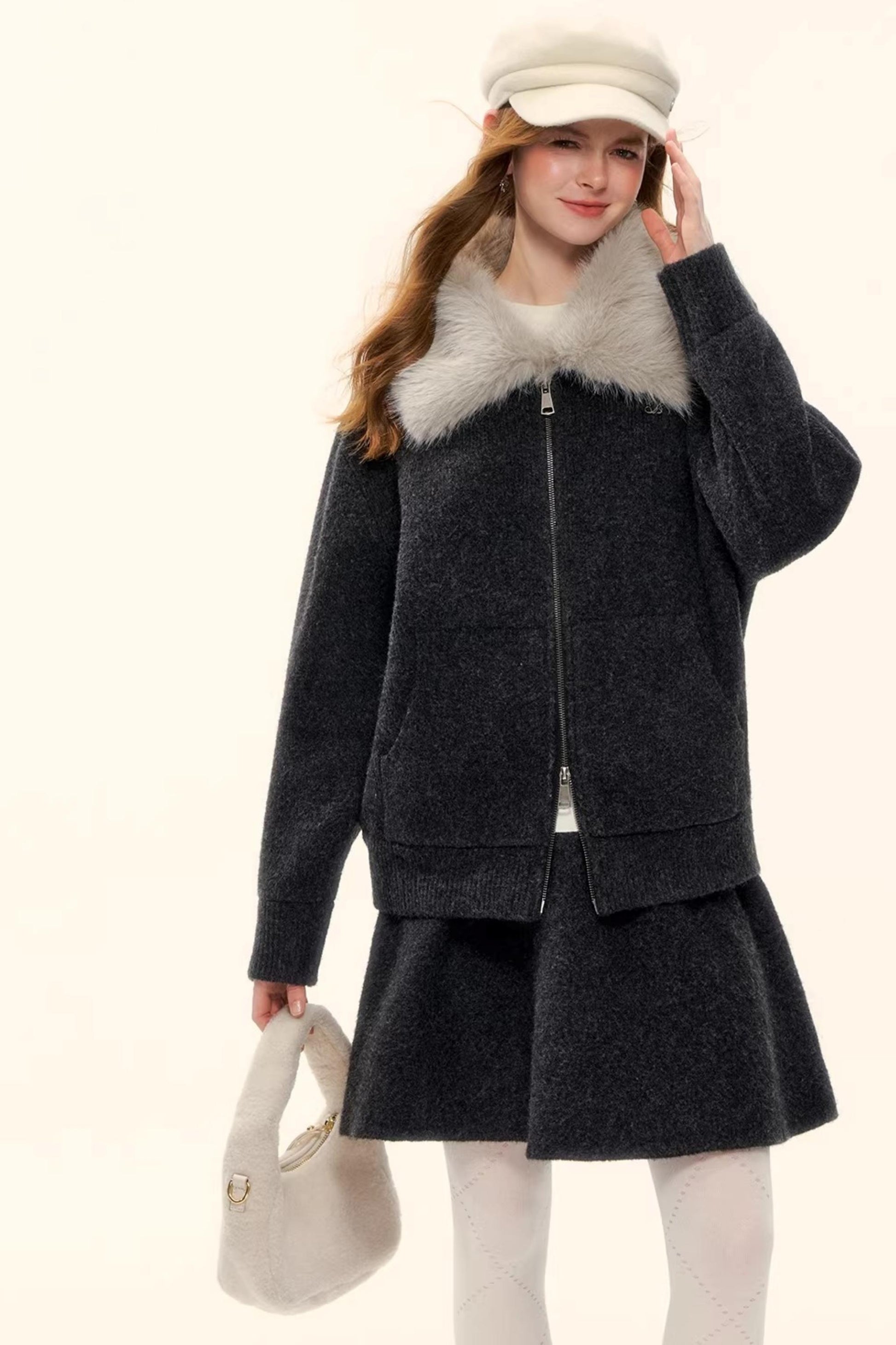 Wool Blend Lapel Fur Collar Coat Set-Up