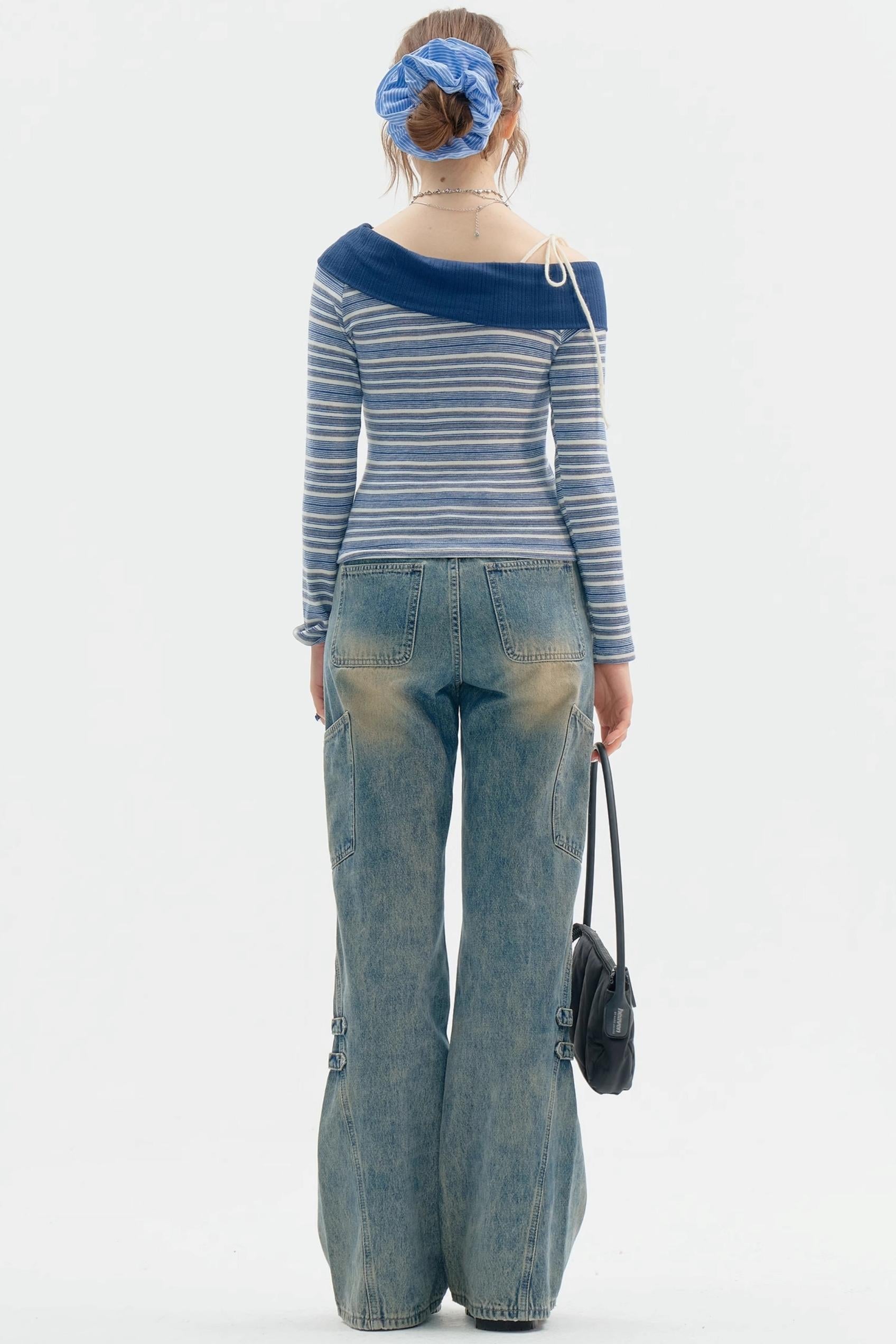 Dark Blue Stripe One-Shoulder Shirt