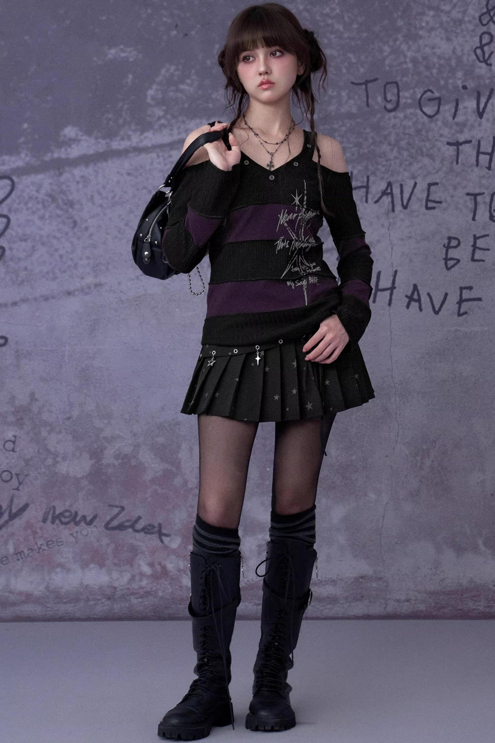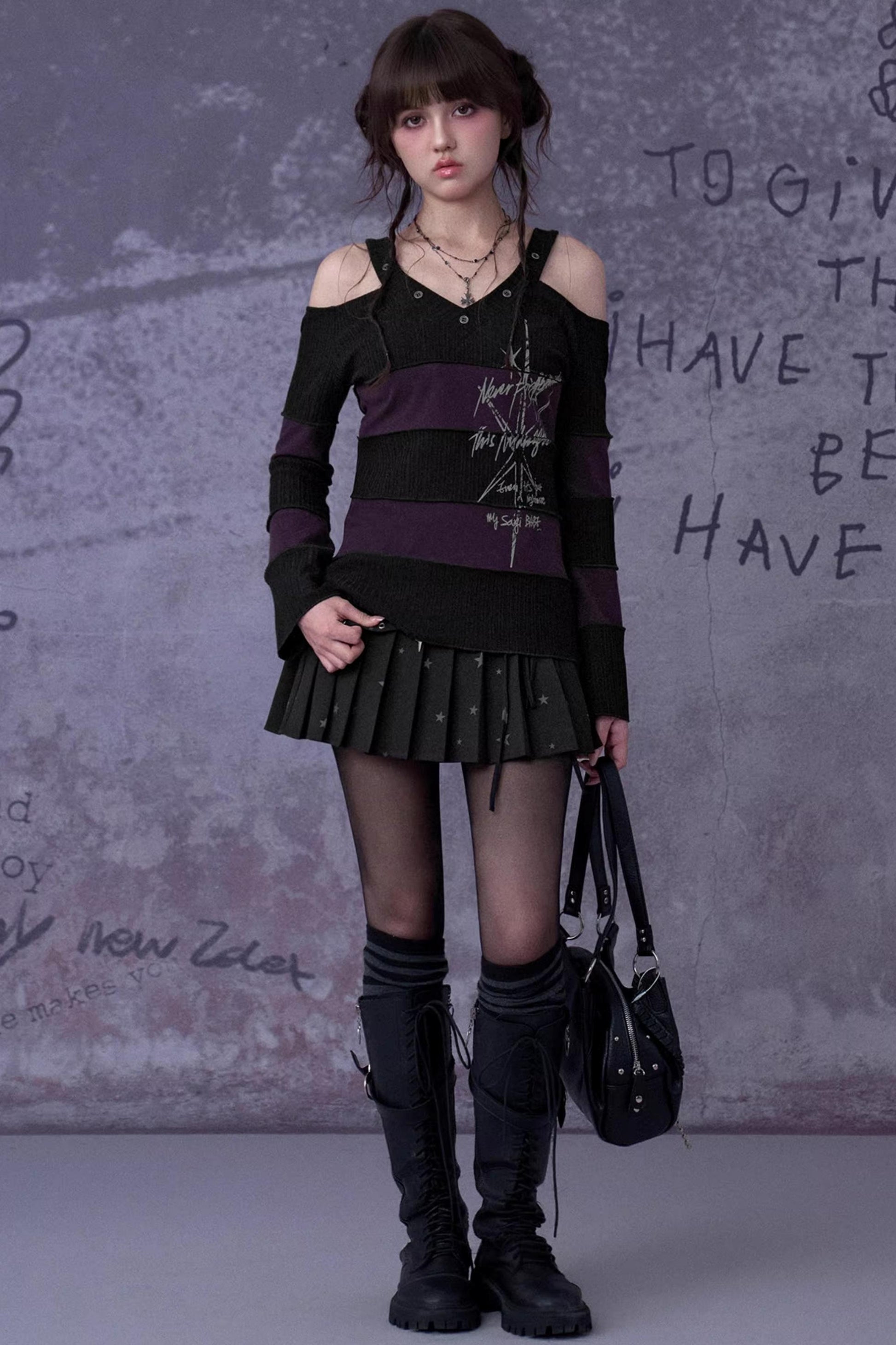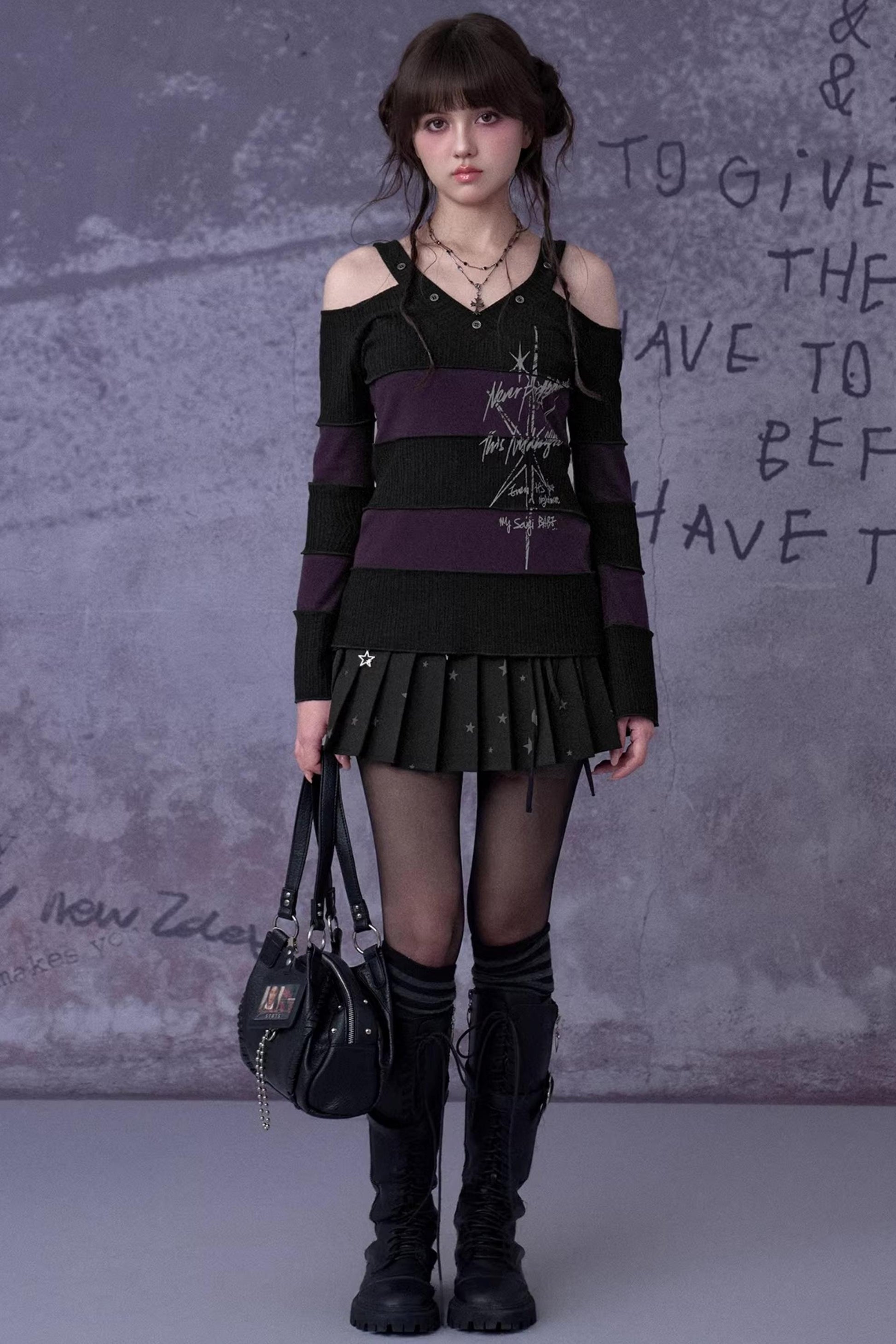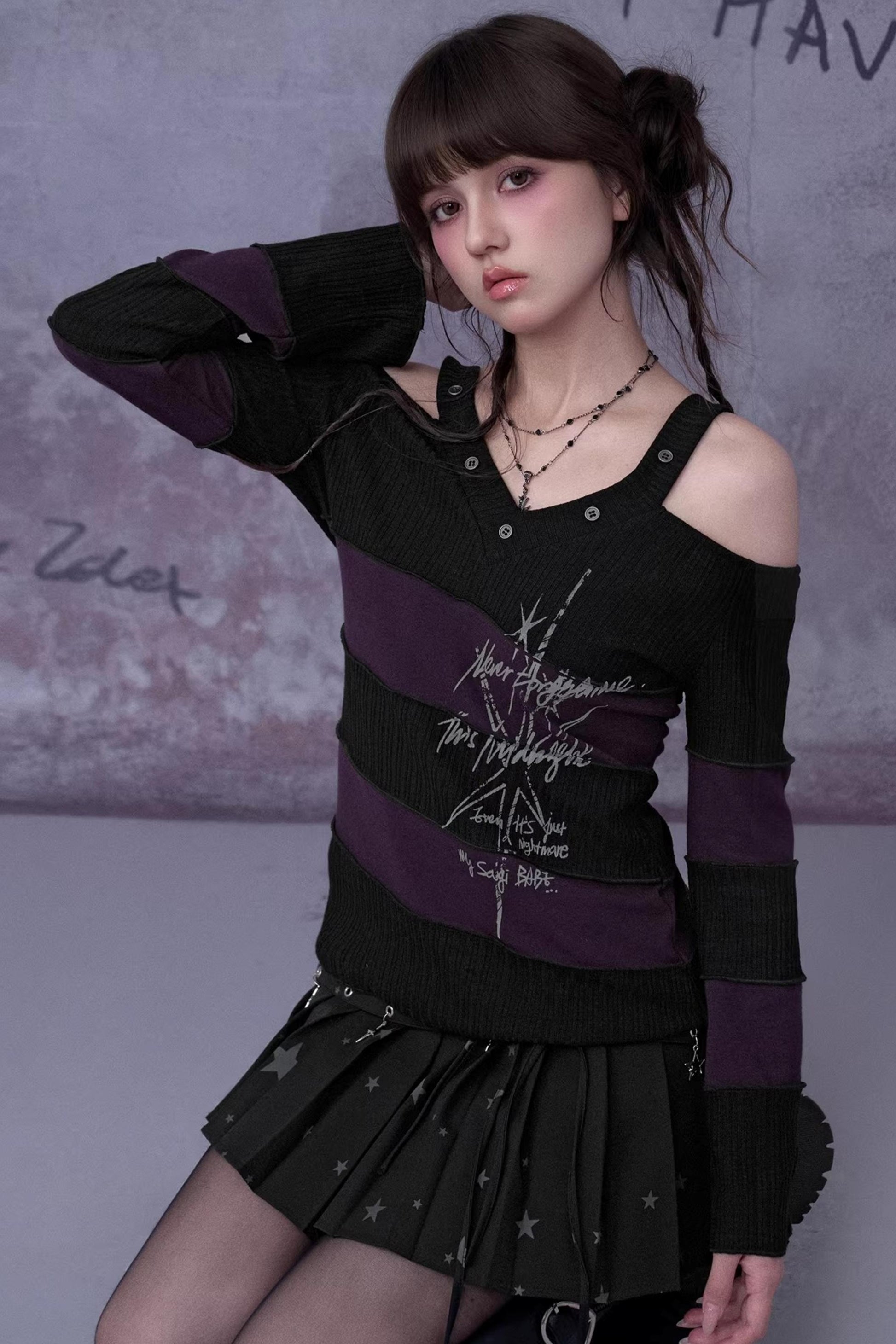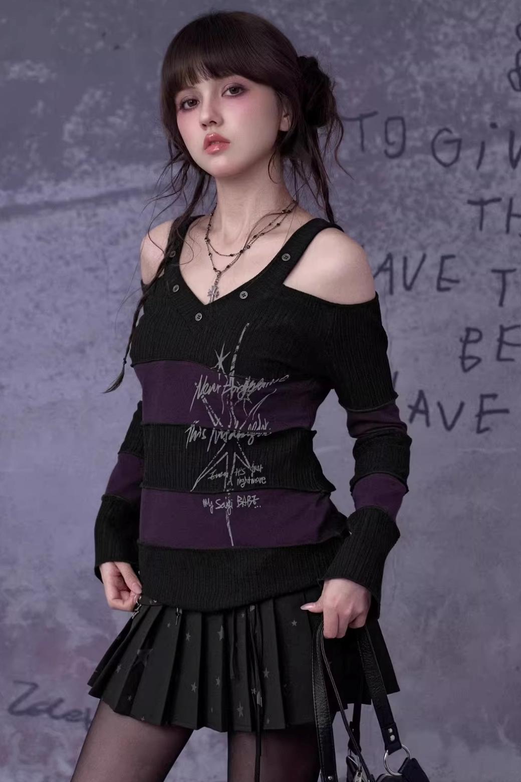 Black and Purple Off-Shoulder Knit Top