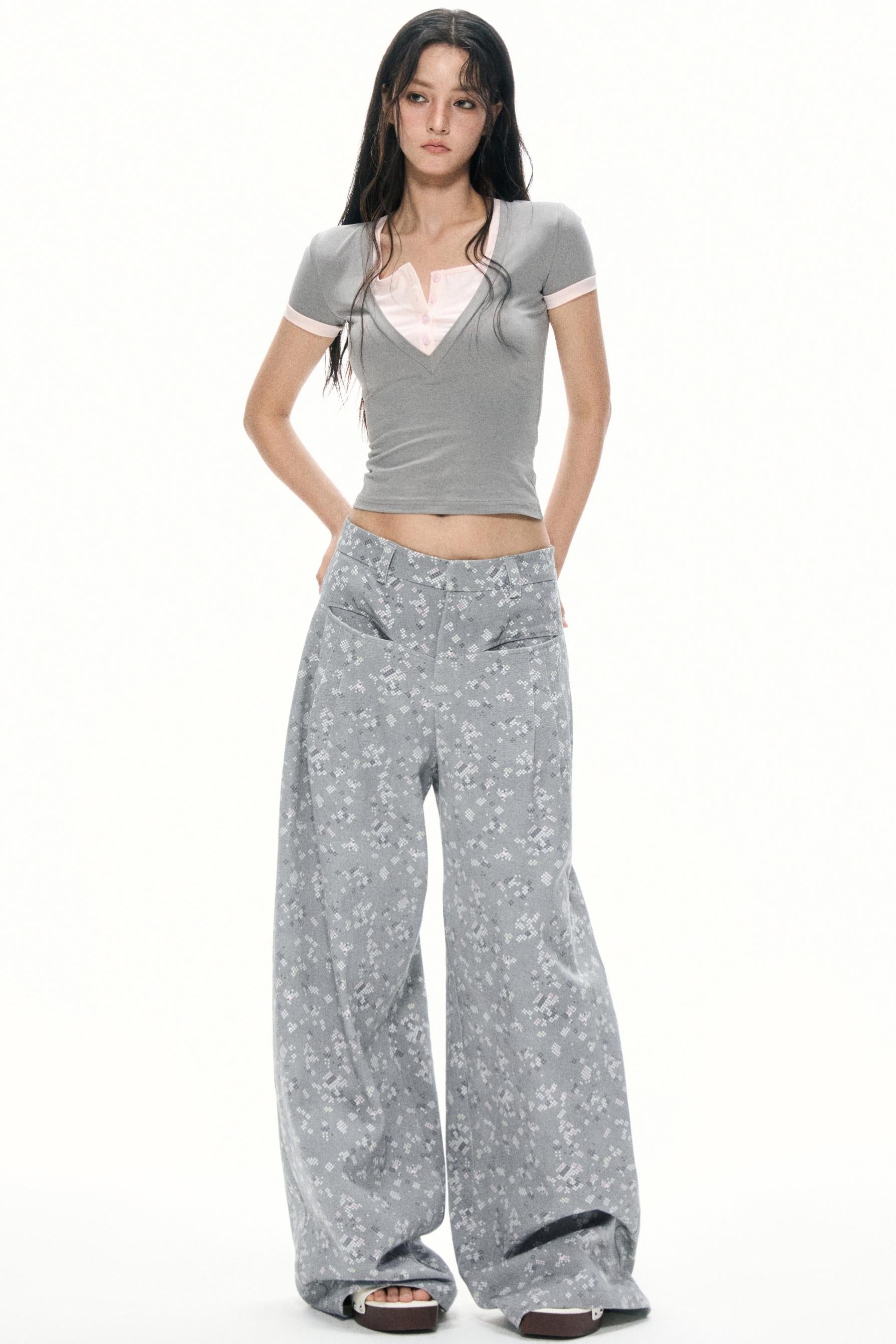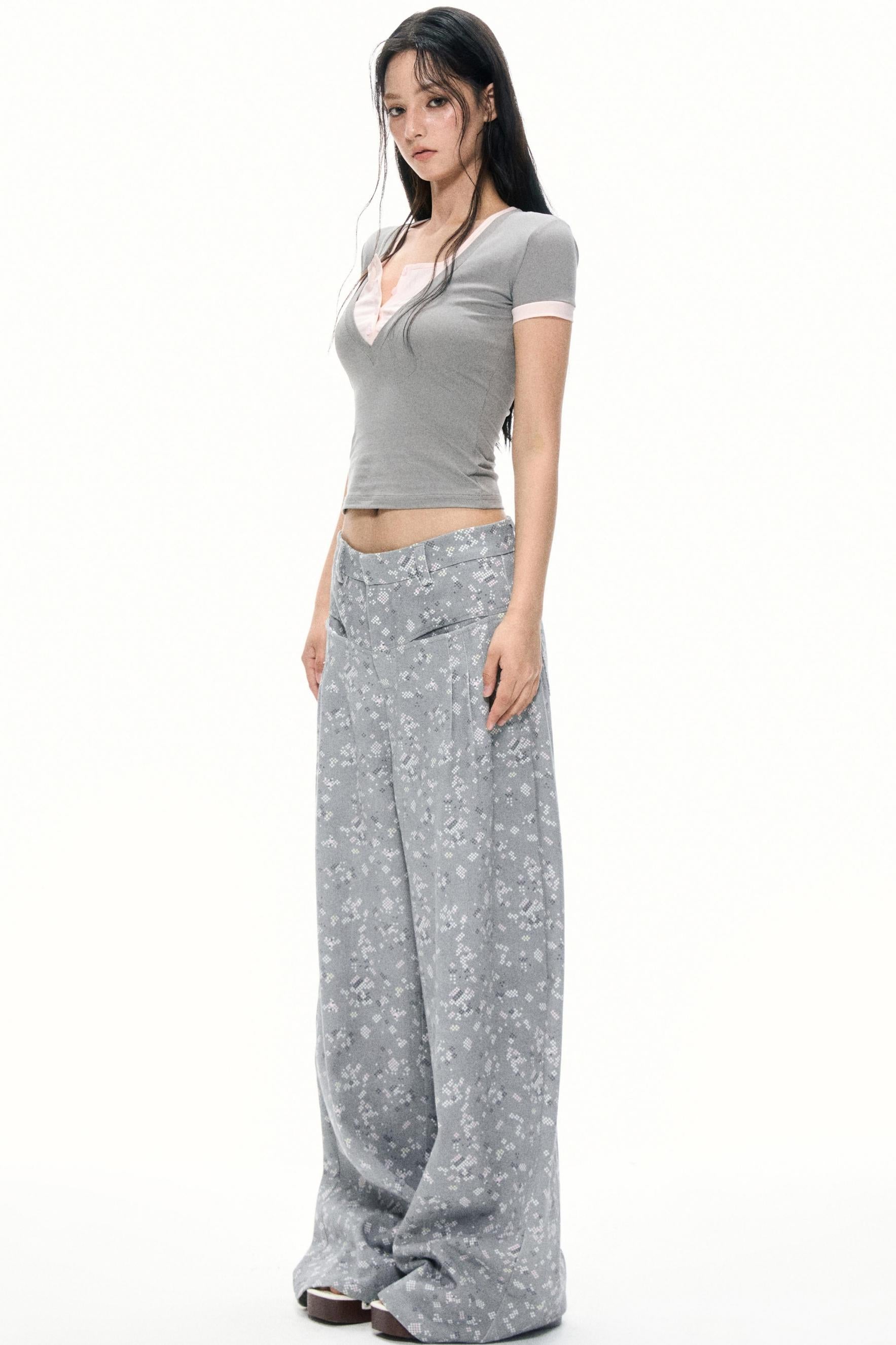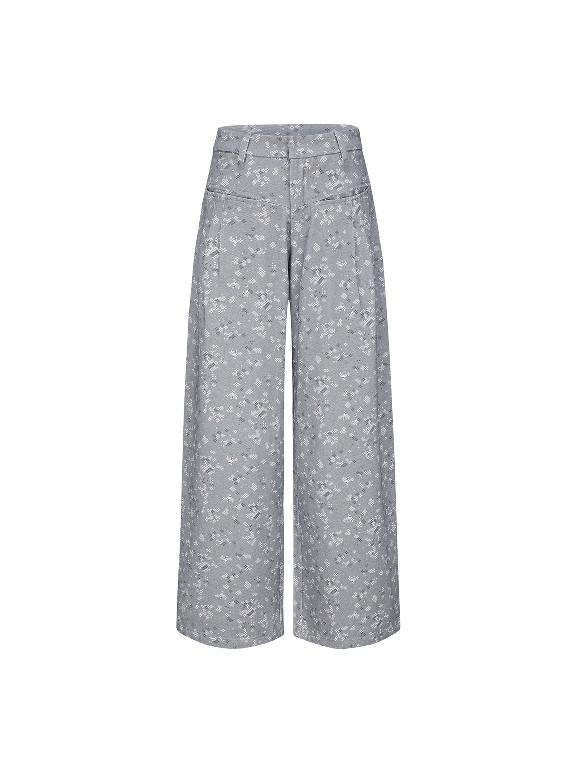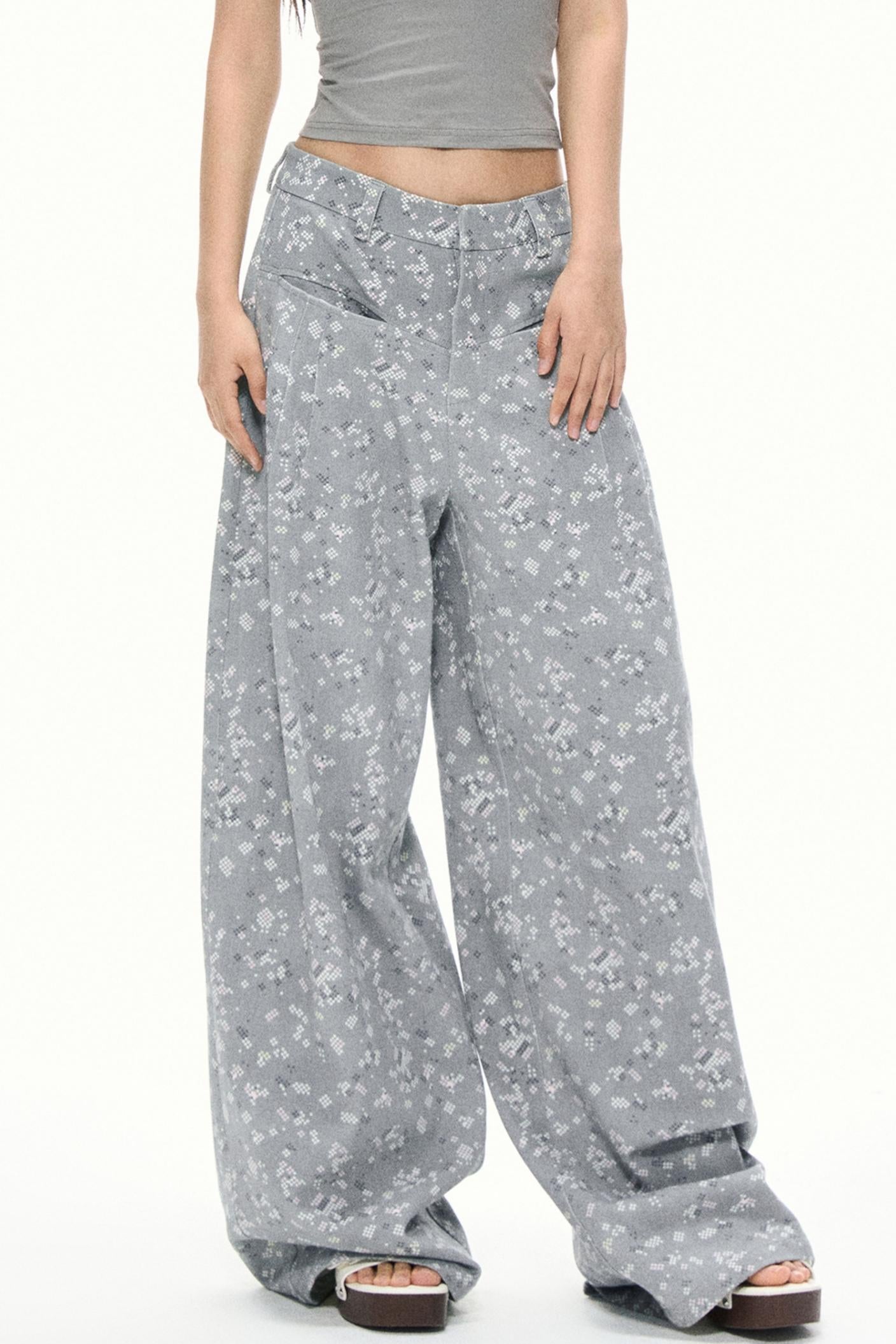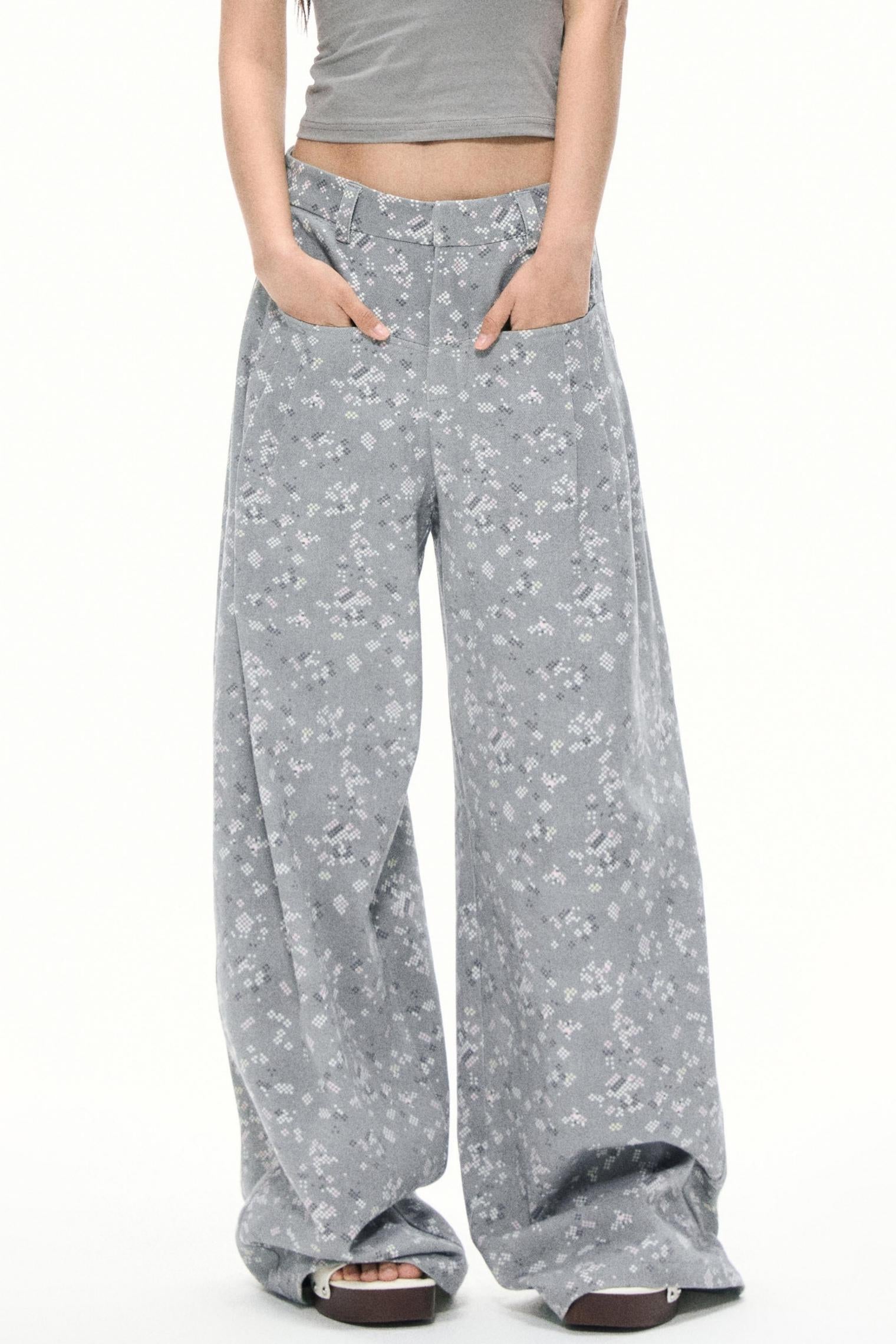 Gray Floral Wide-Leg Pants