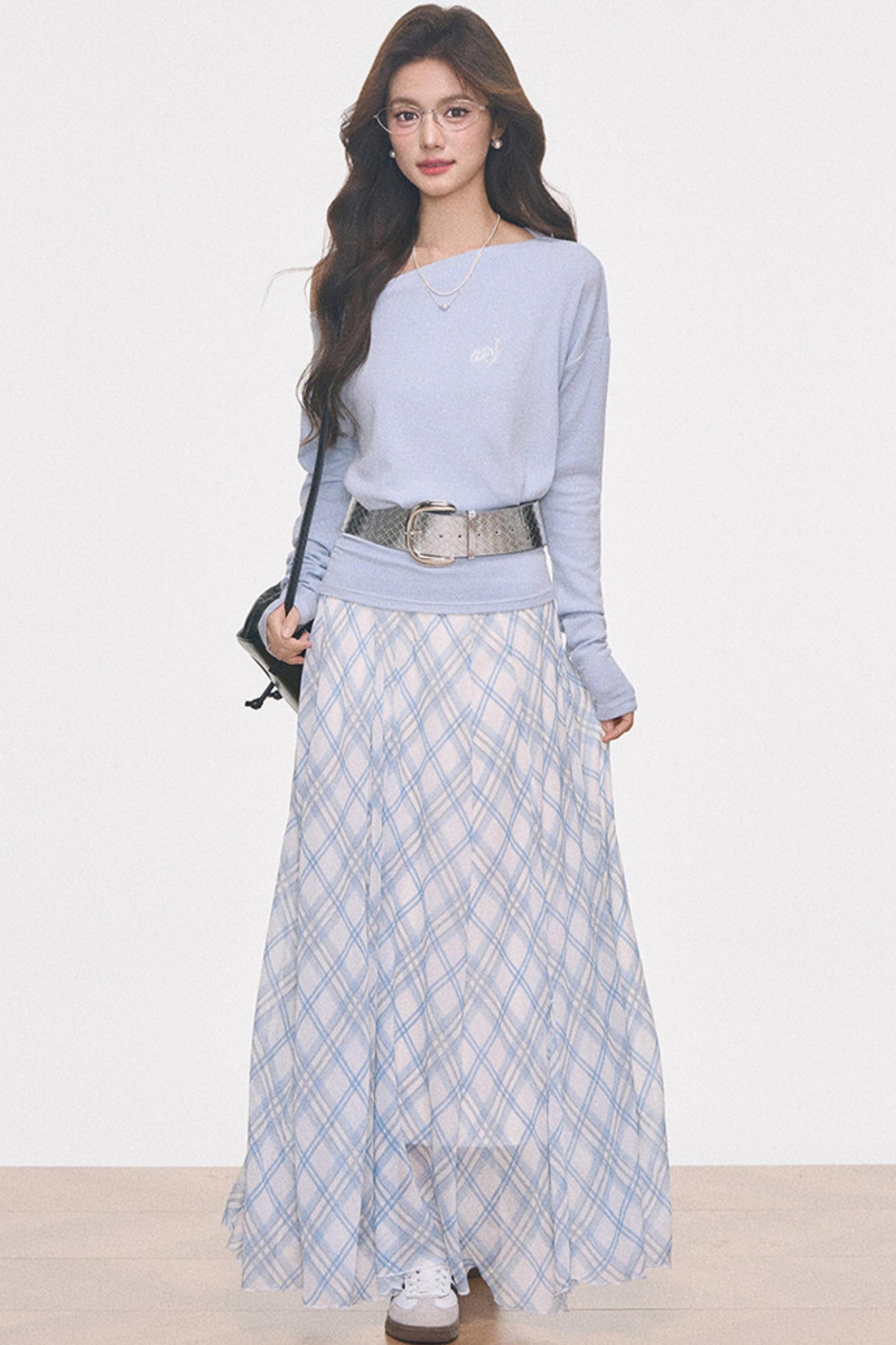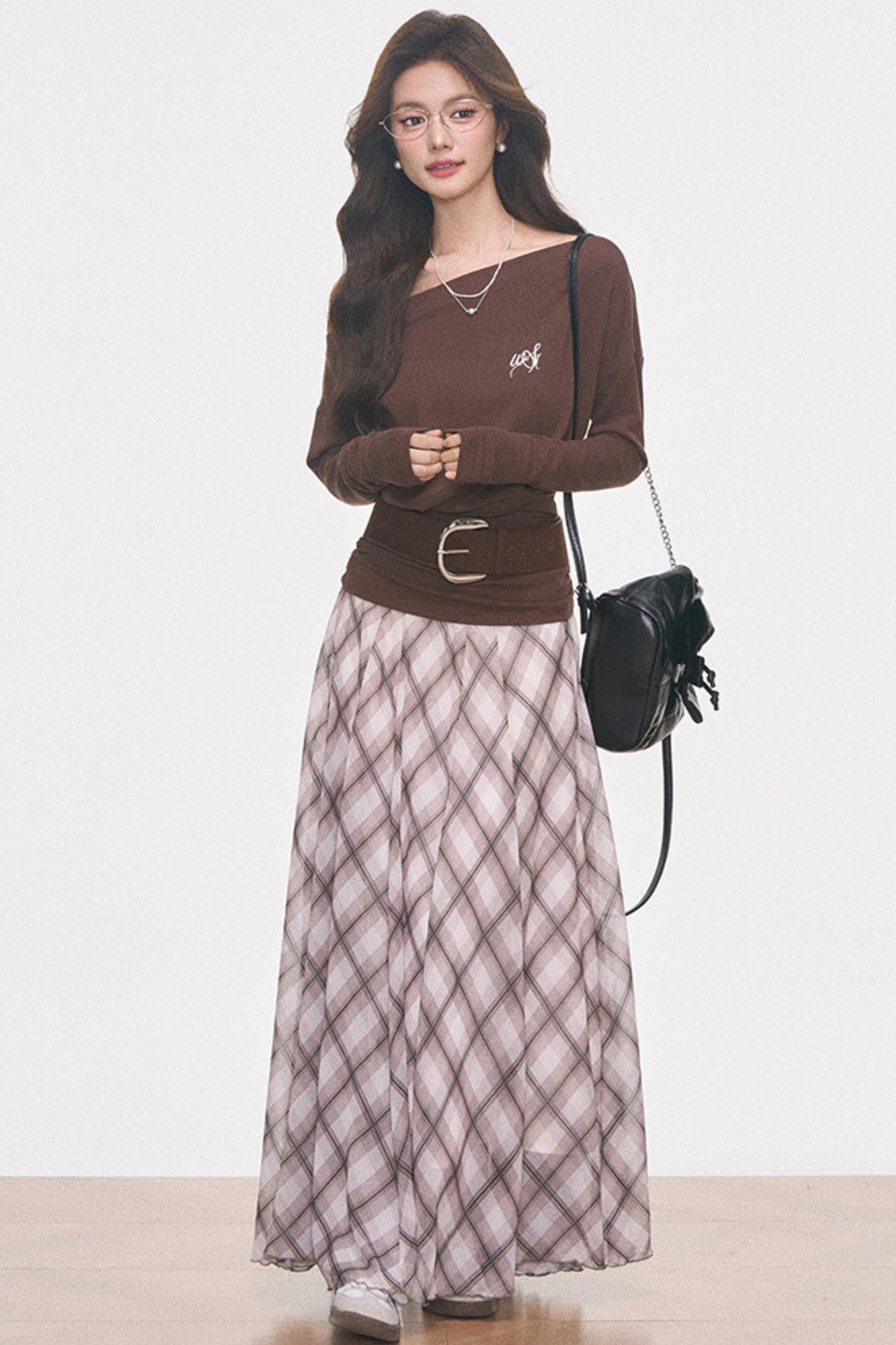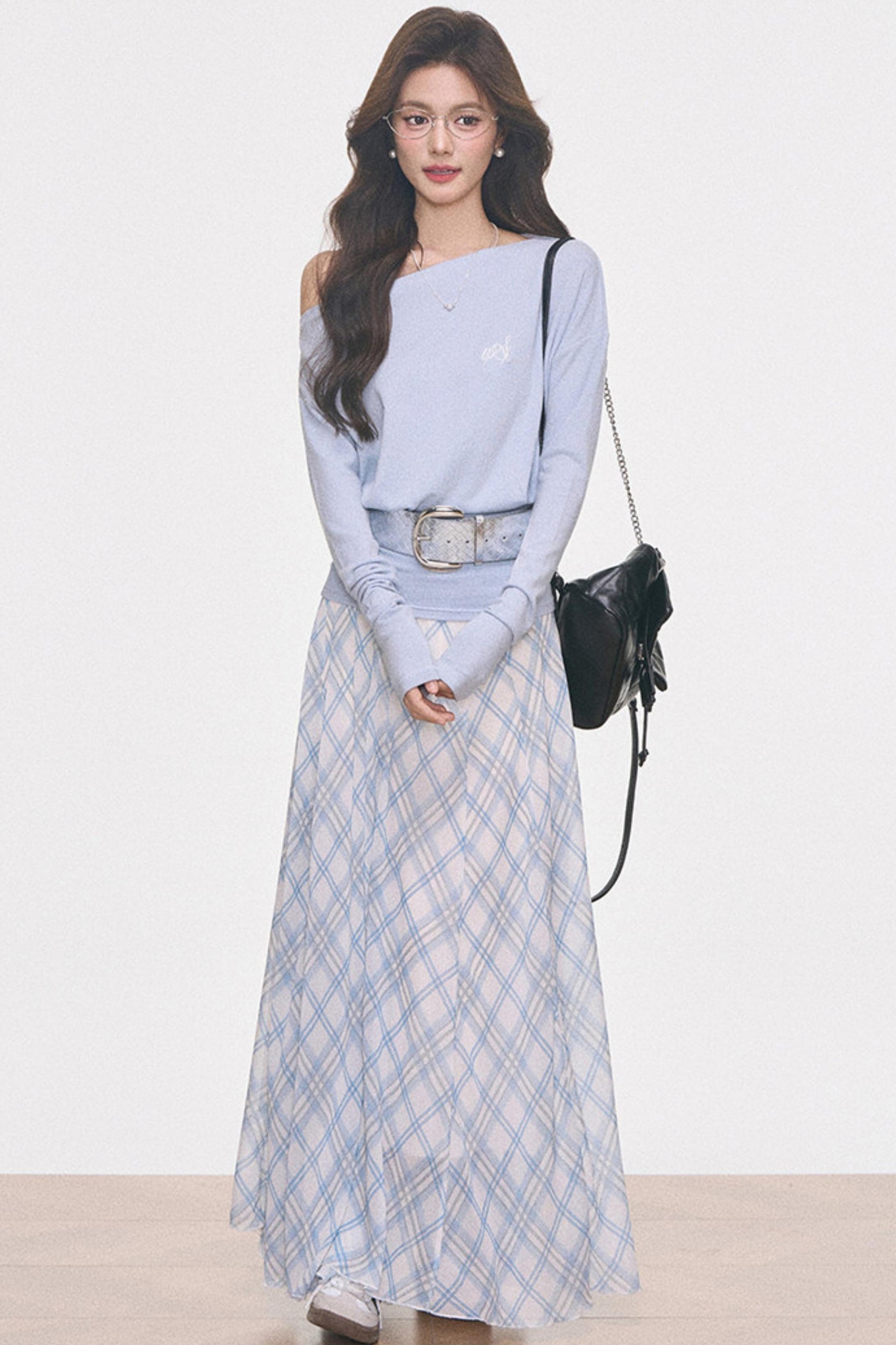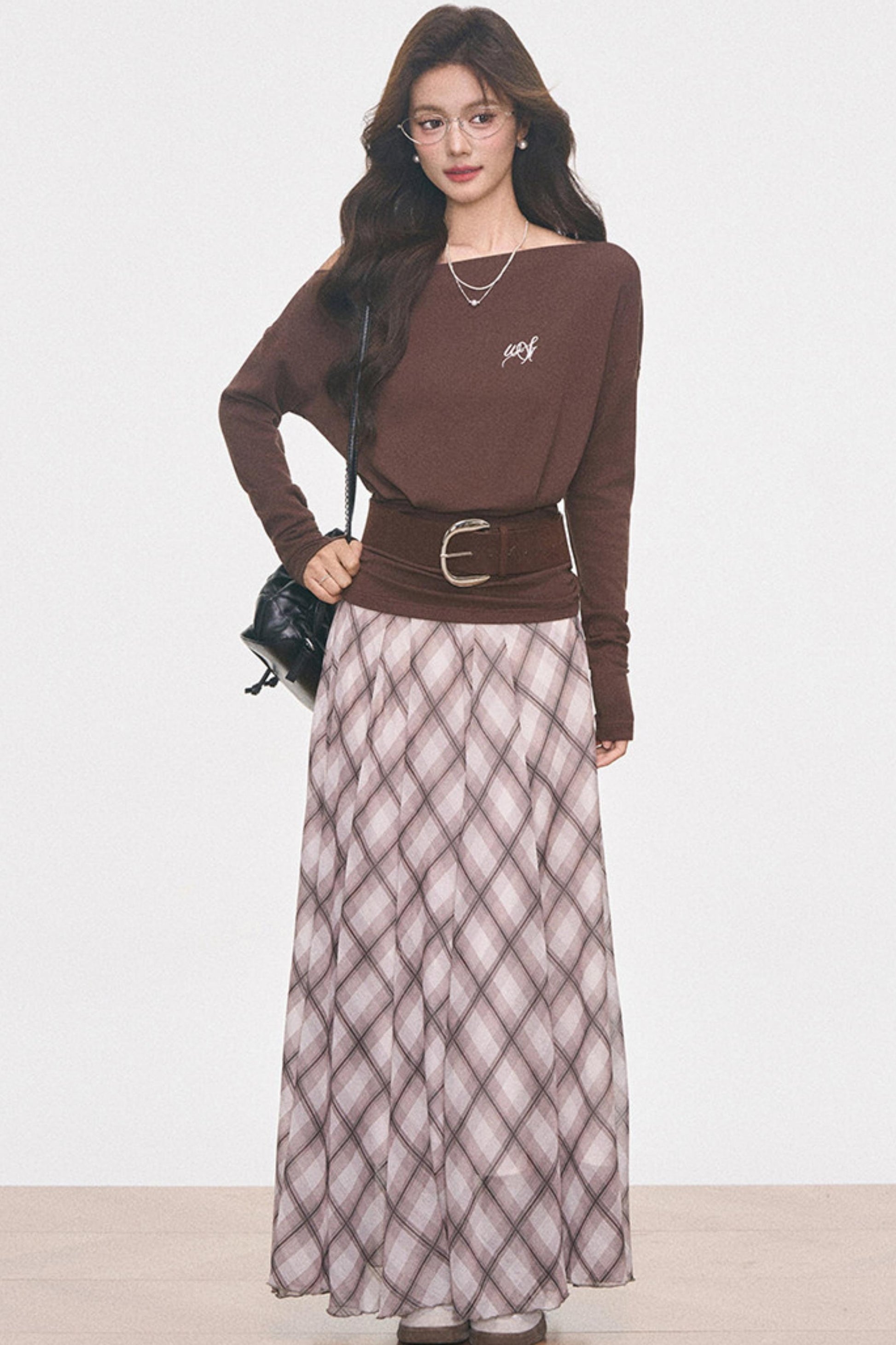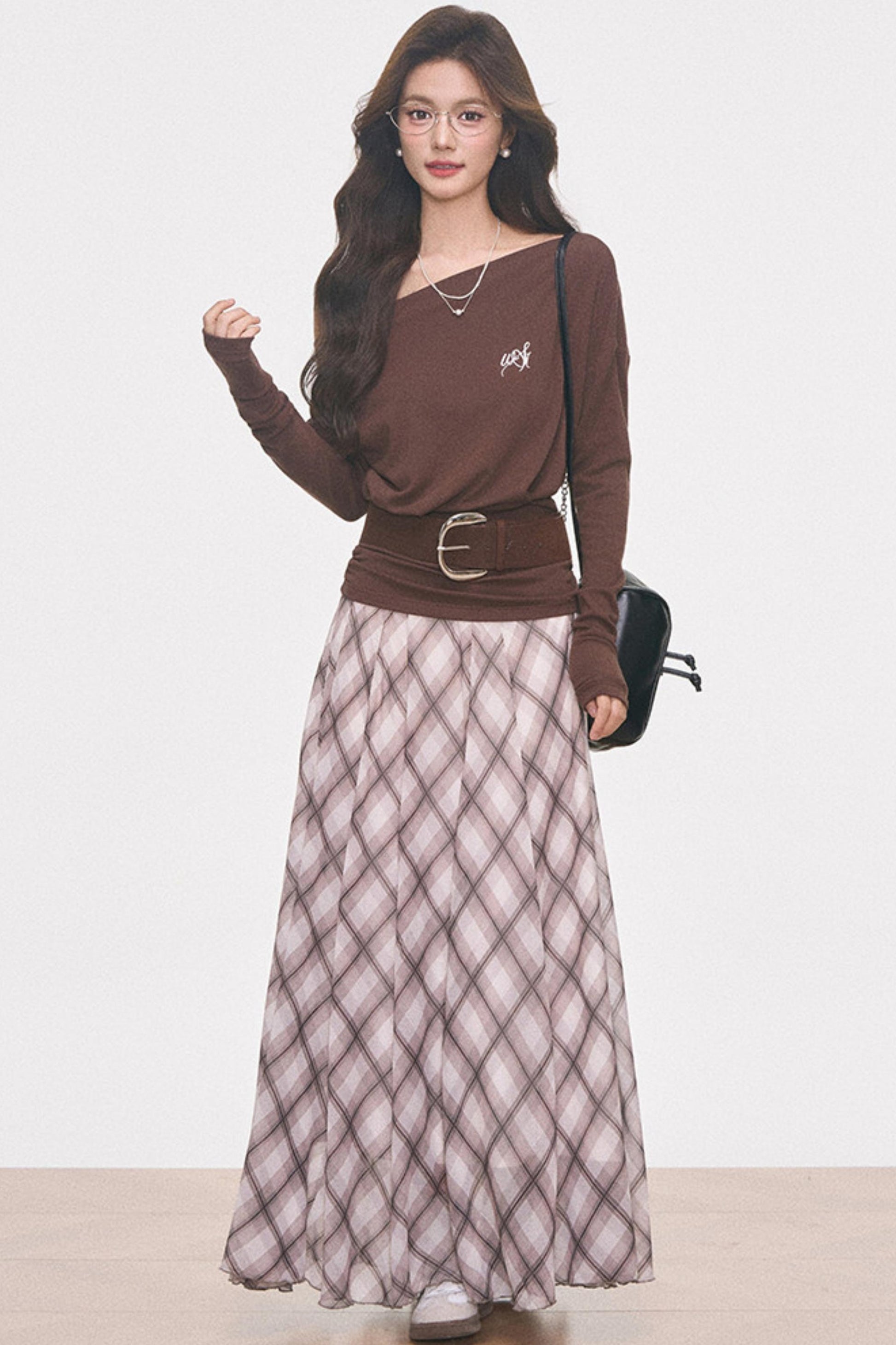 Knitted Off-Shoulder Top and Plaid Skirt Set-Up