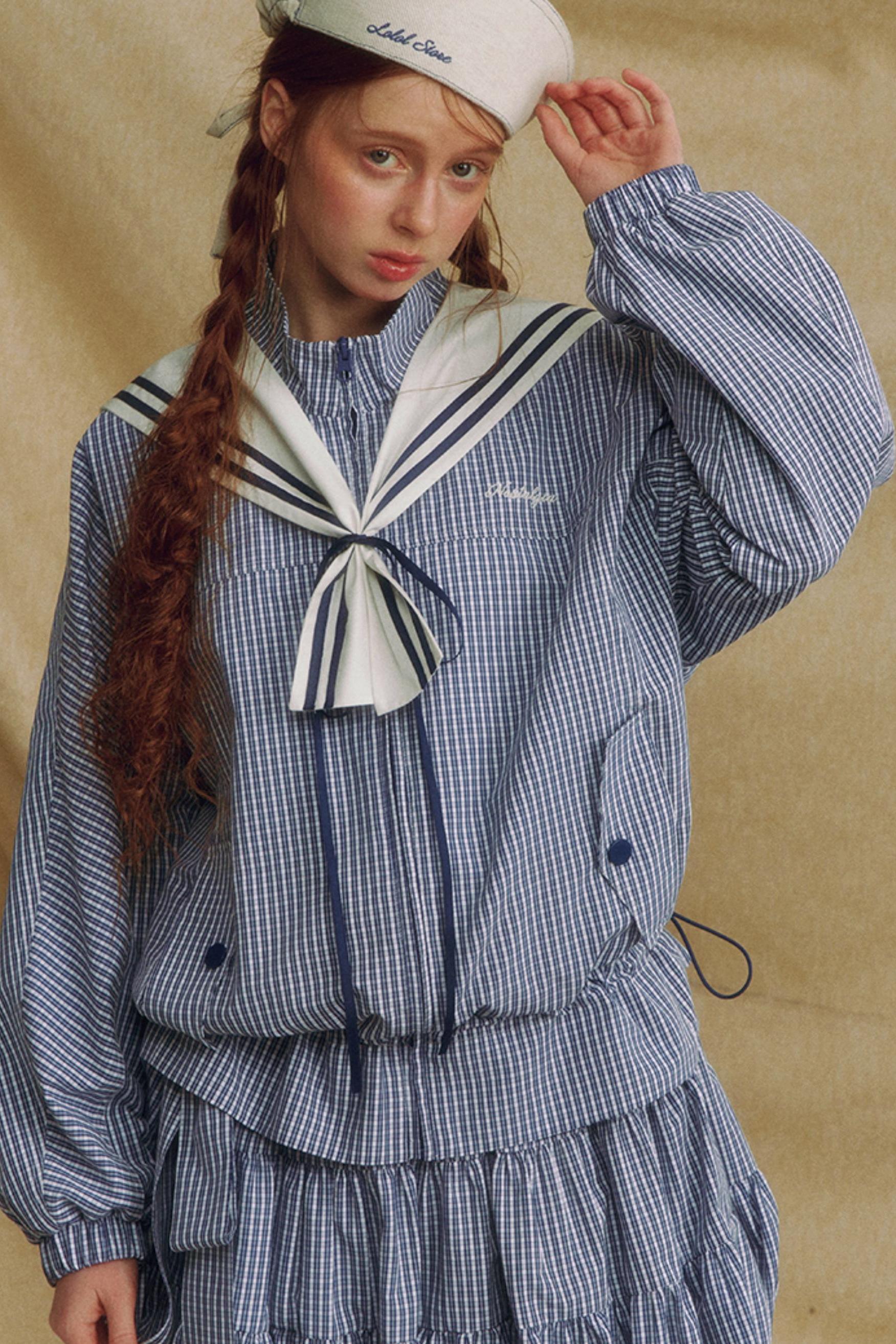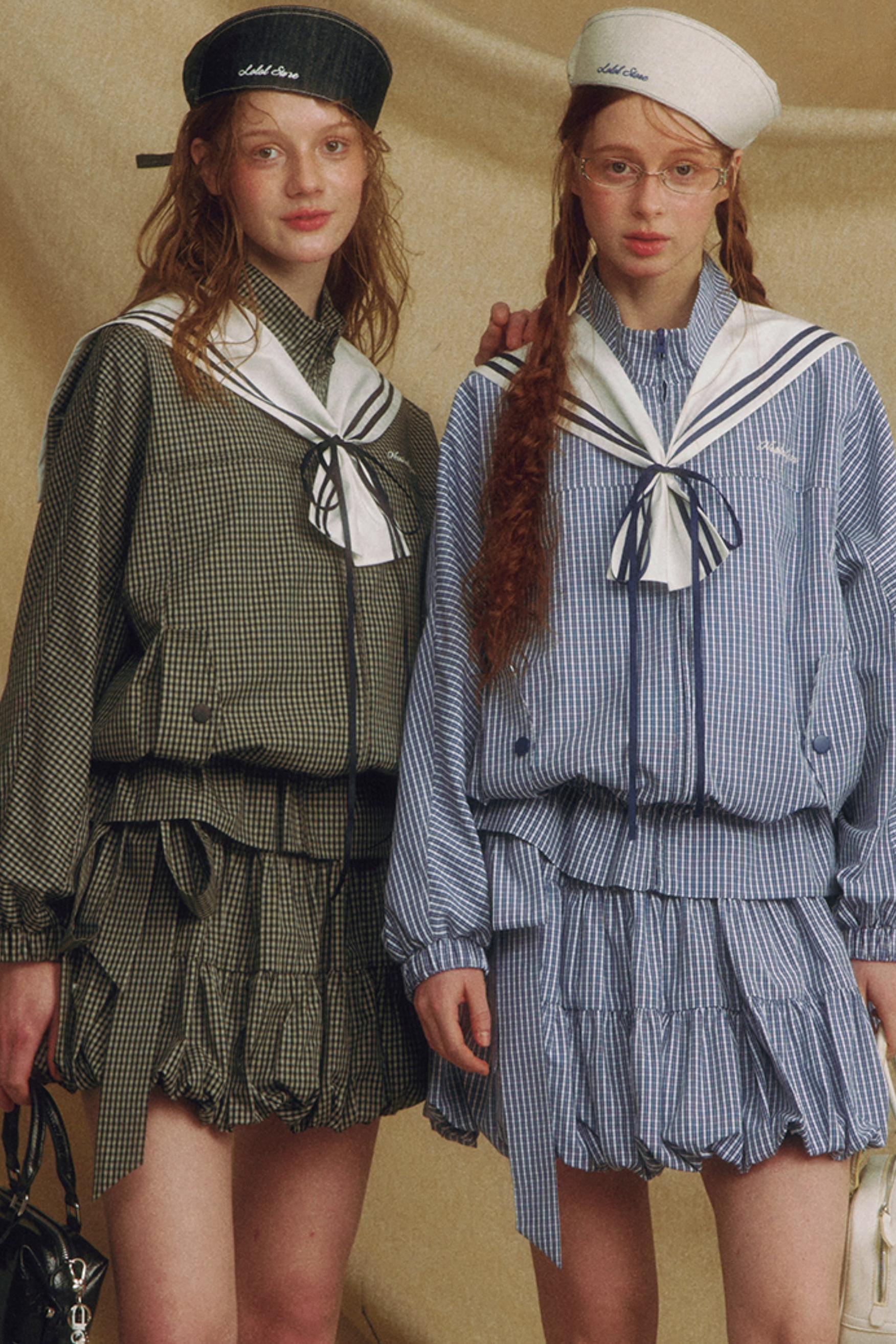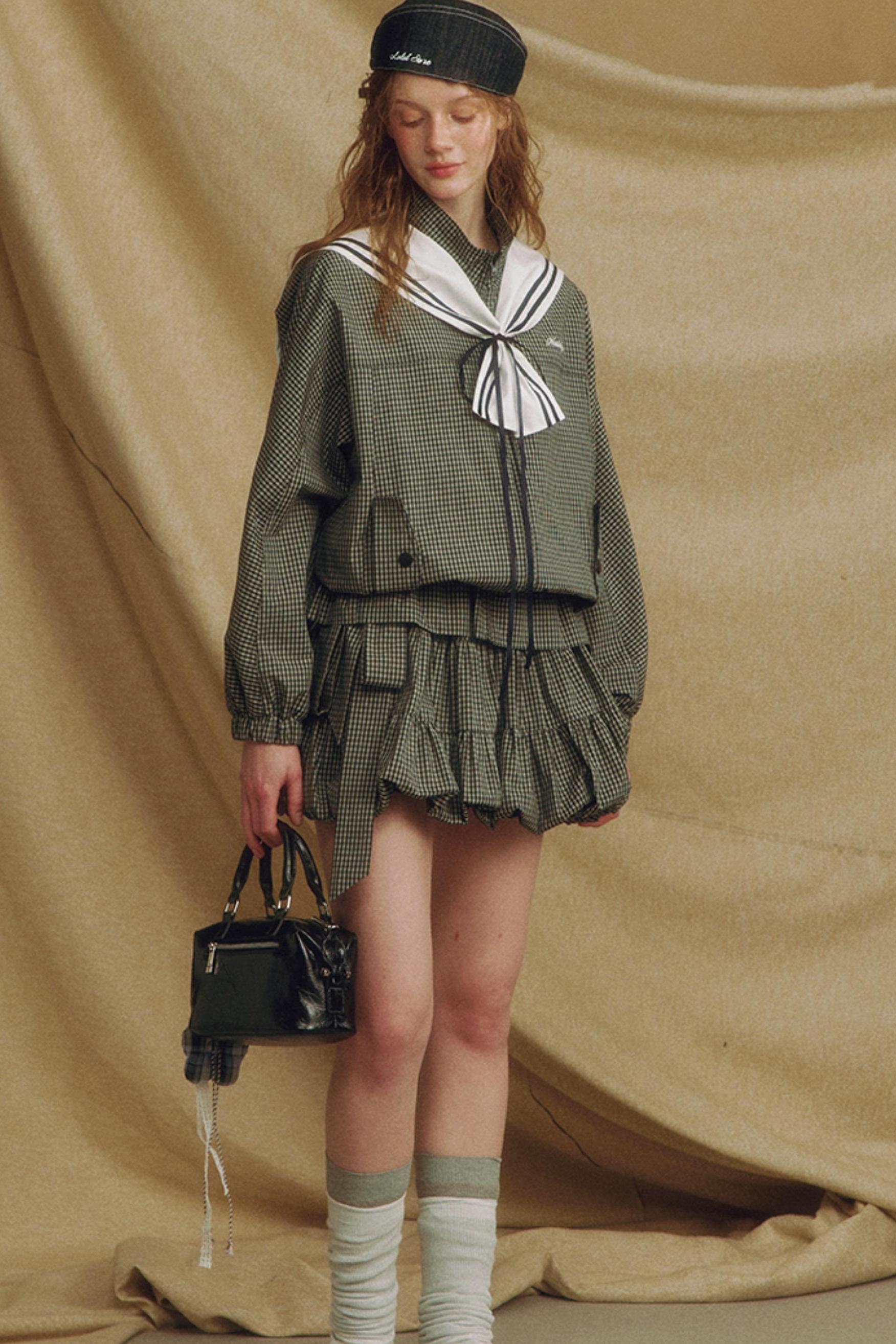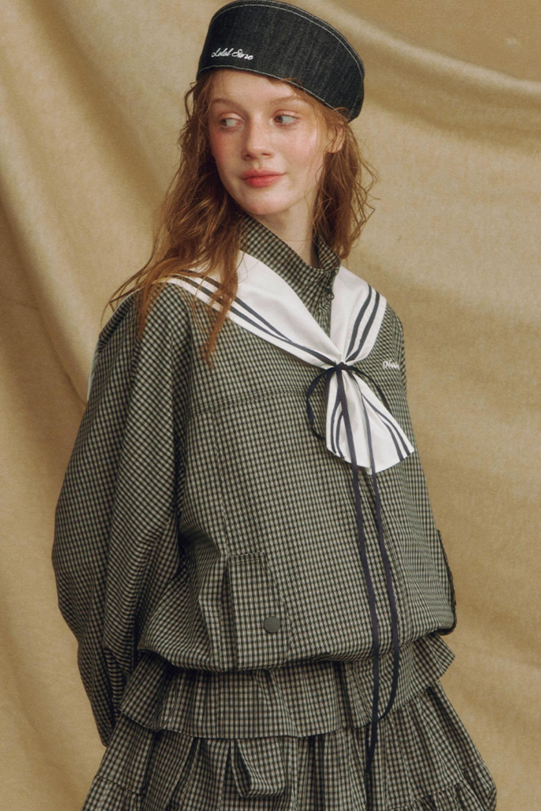 Navy Collar Plaid Jacket Set-Up