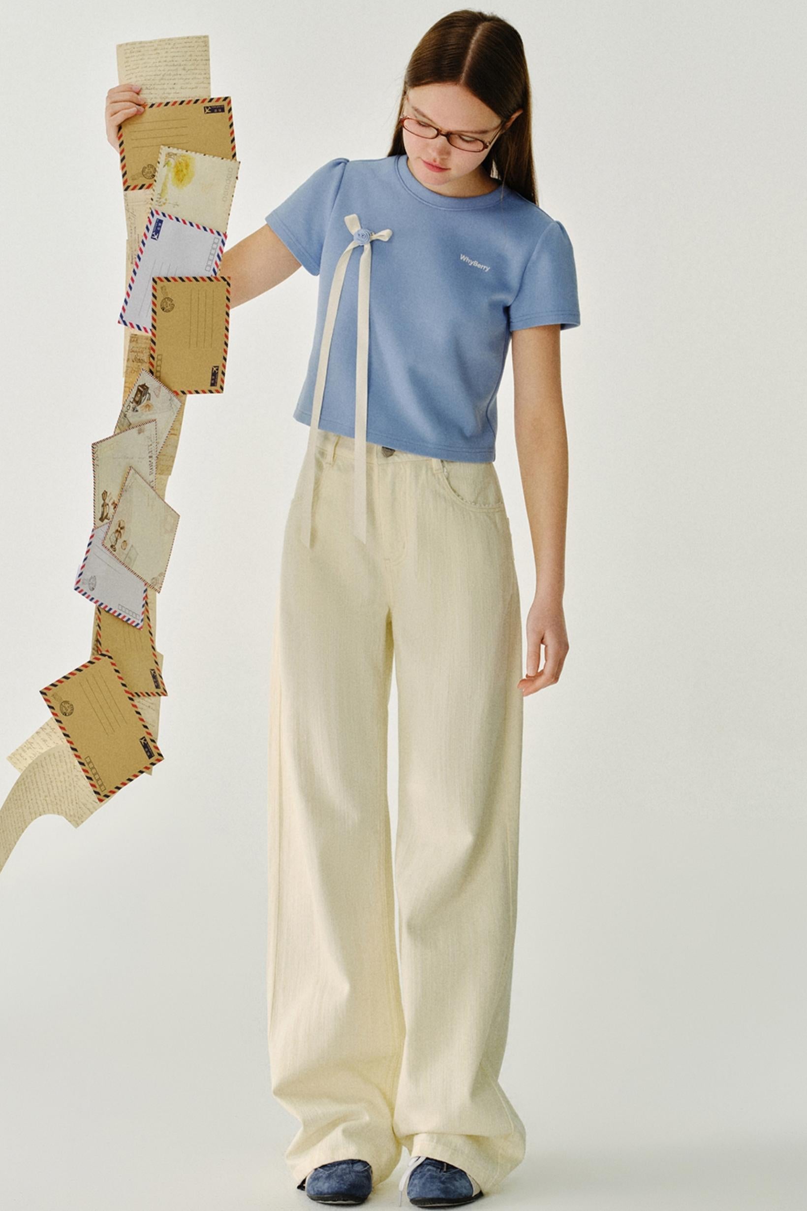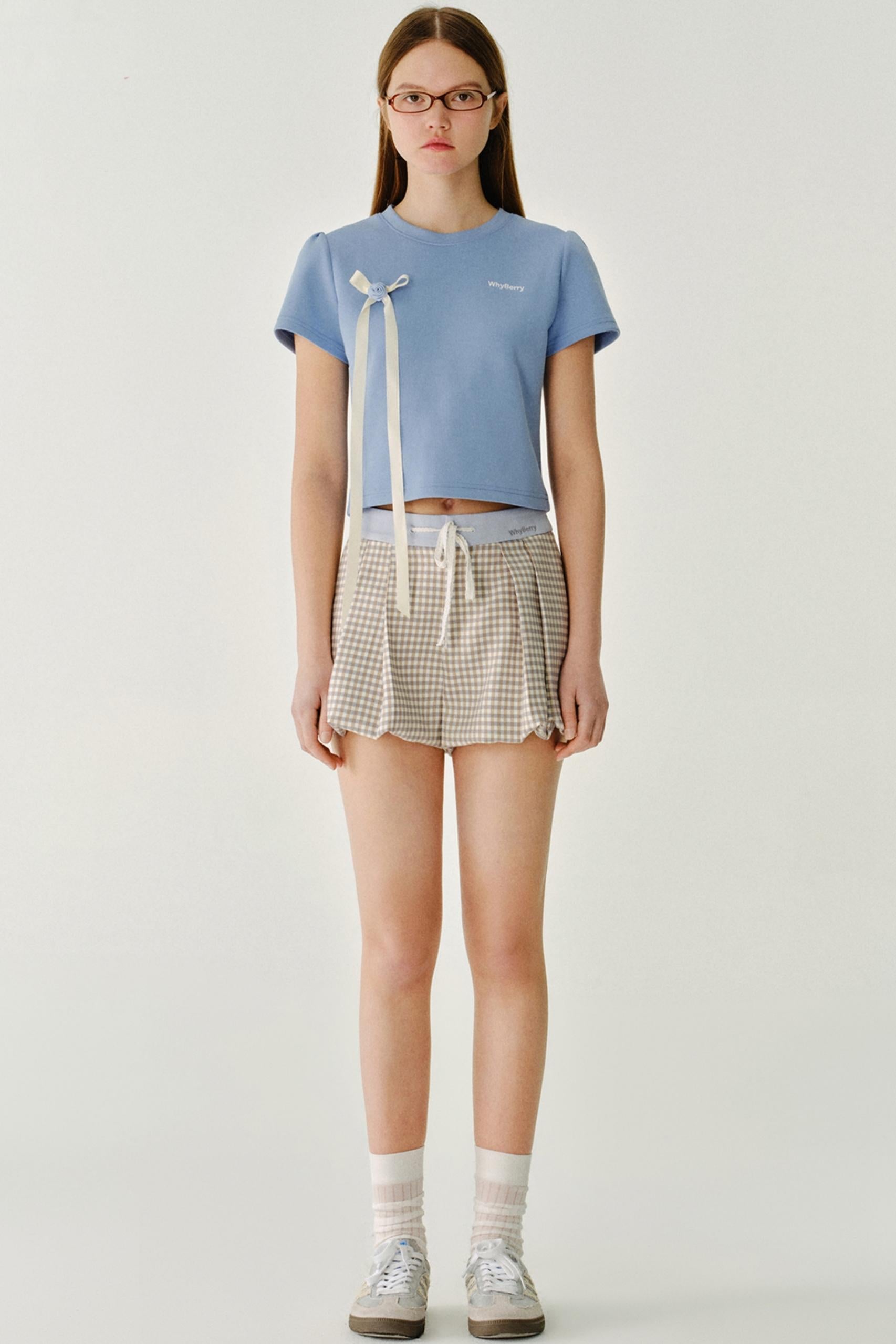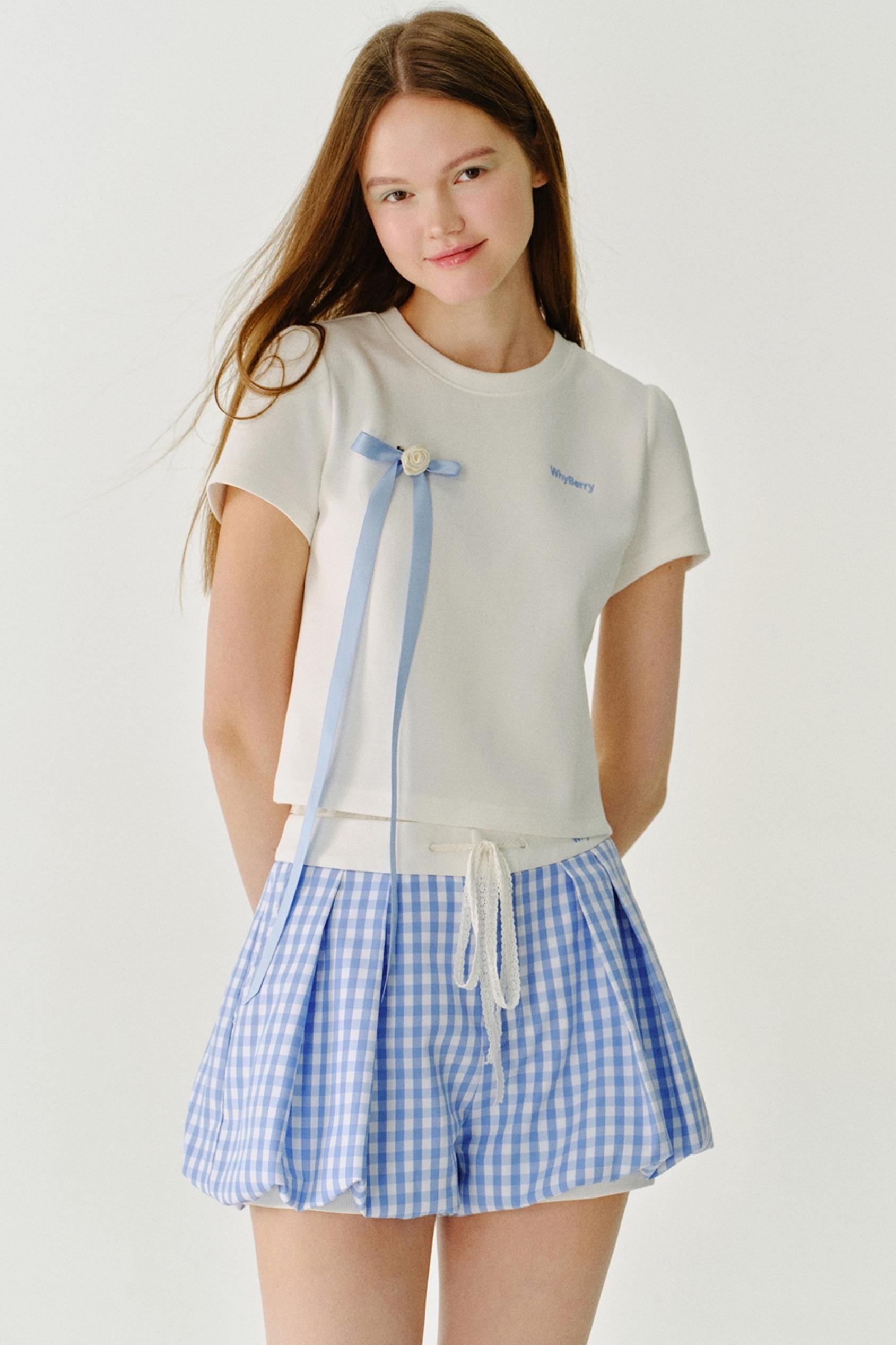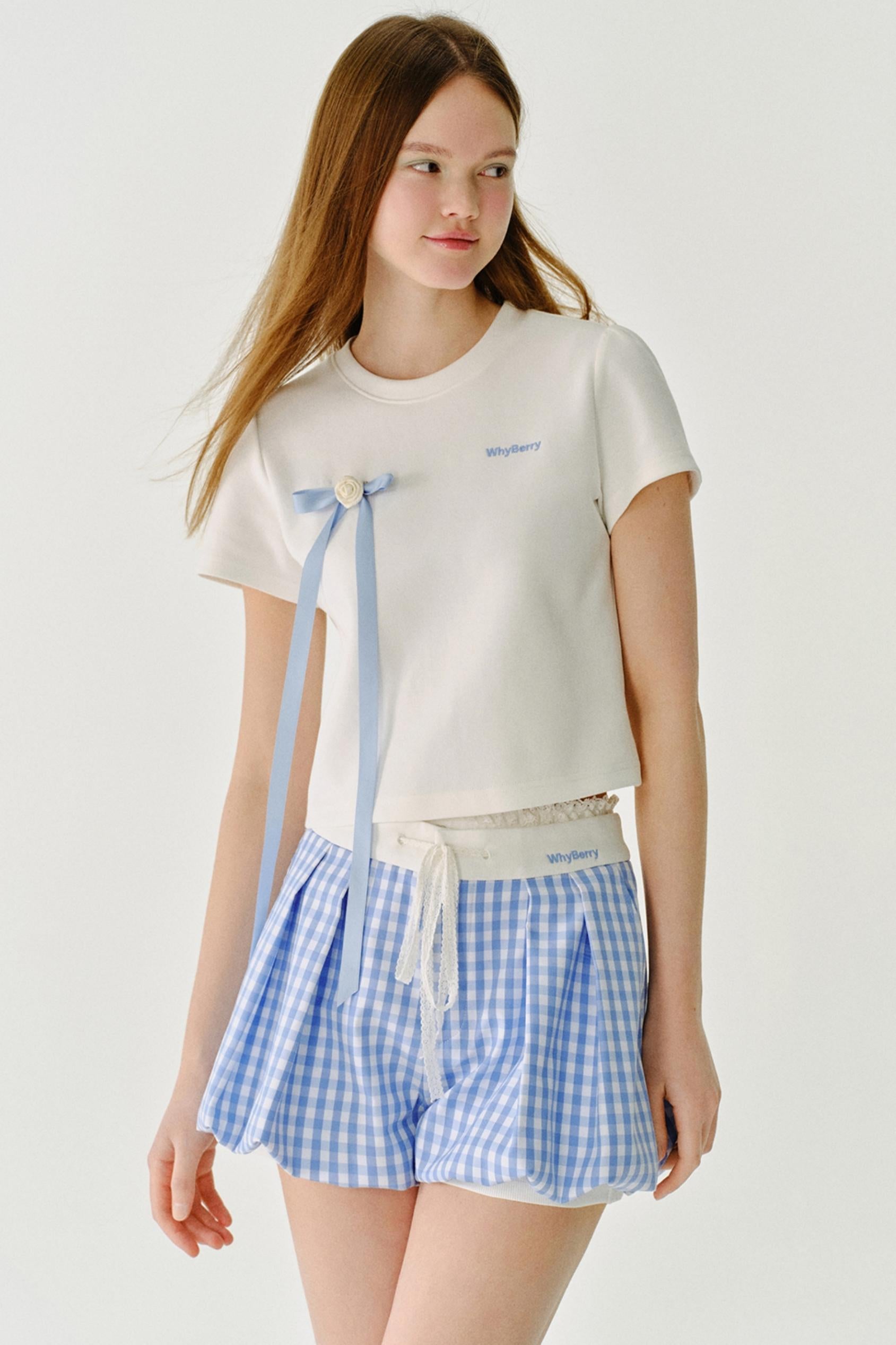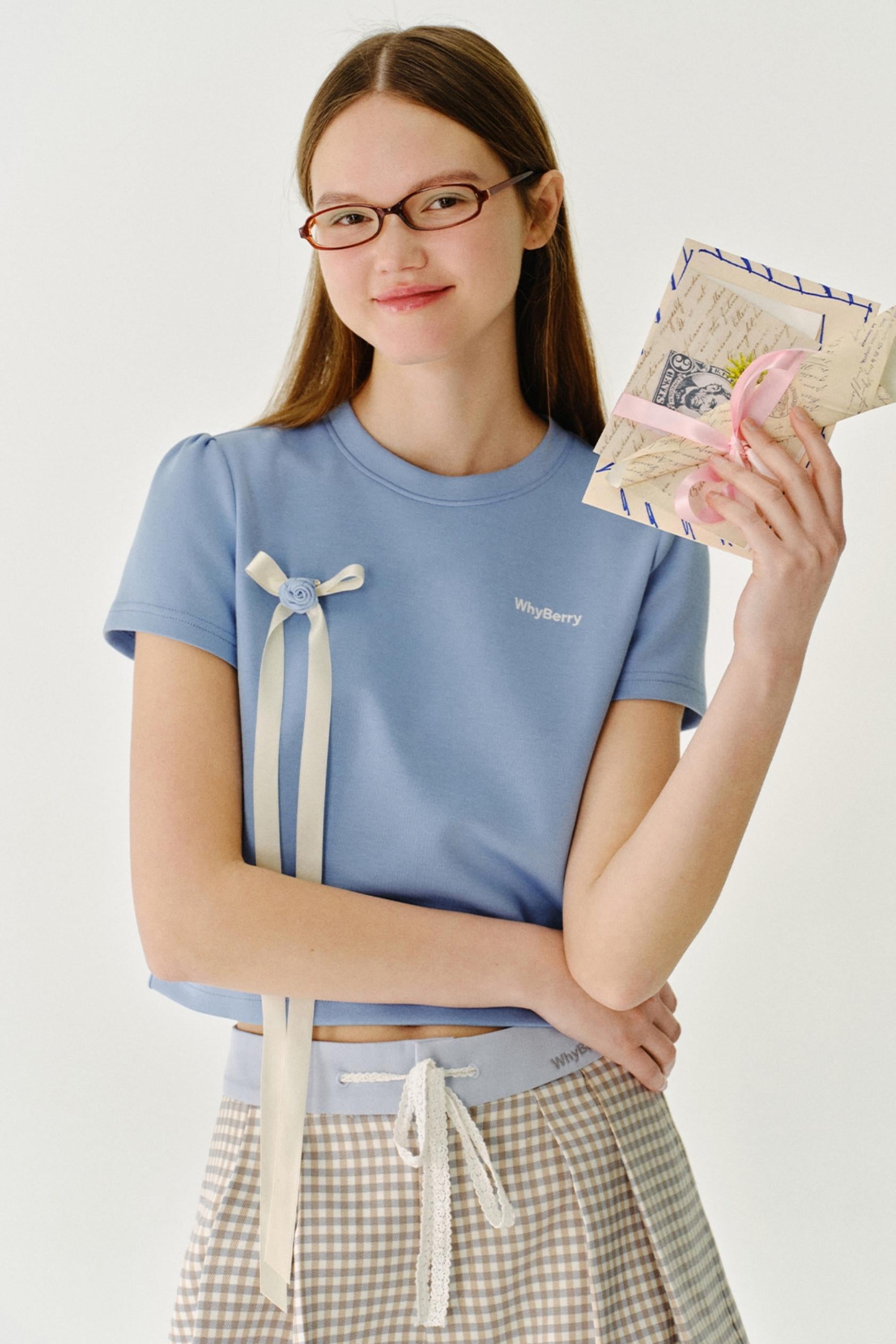 리본 디테일 레터 프린트 티셔츠