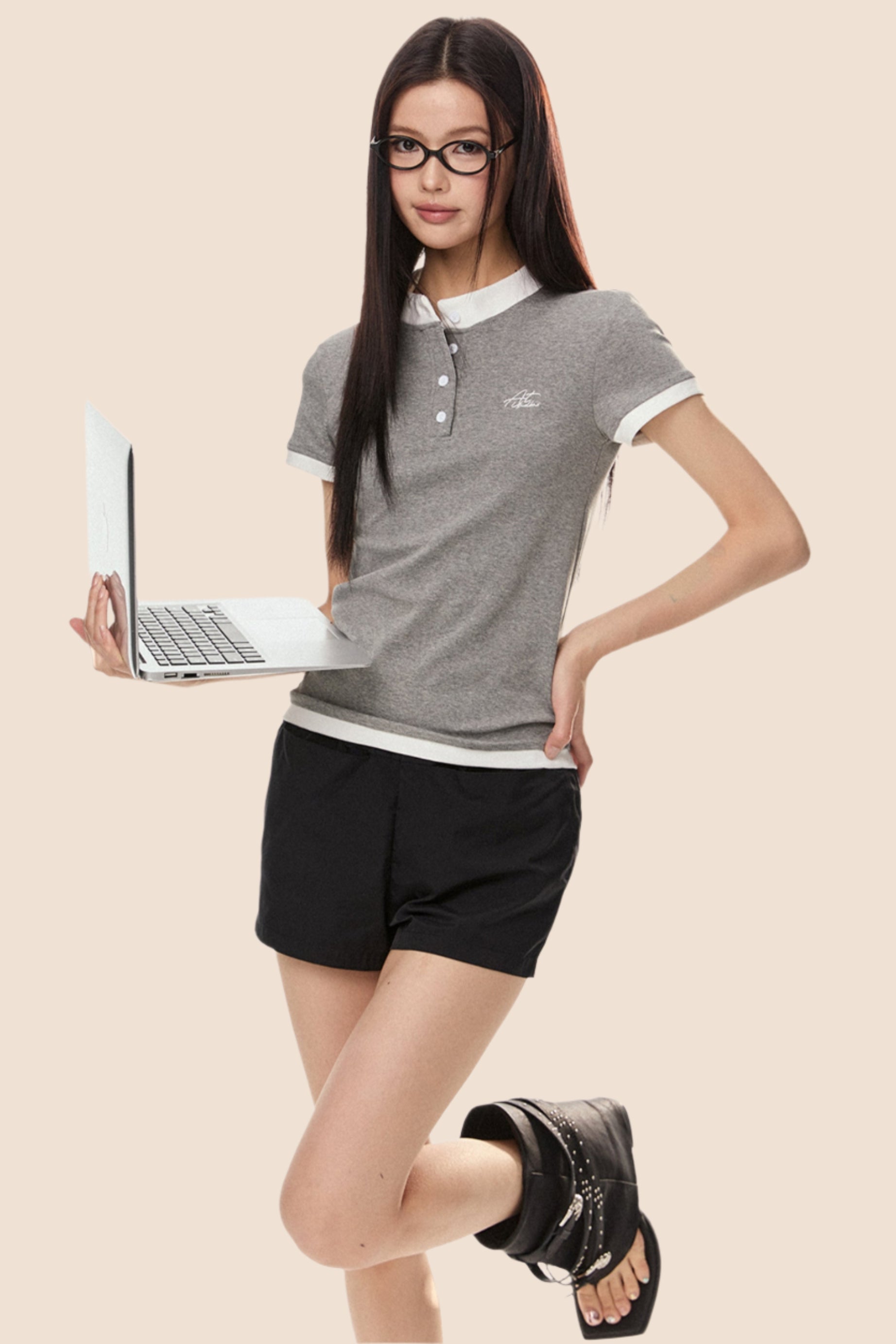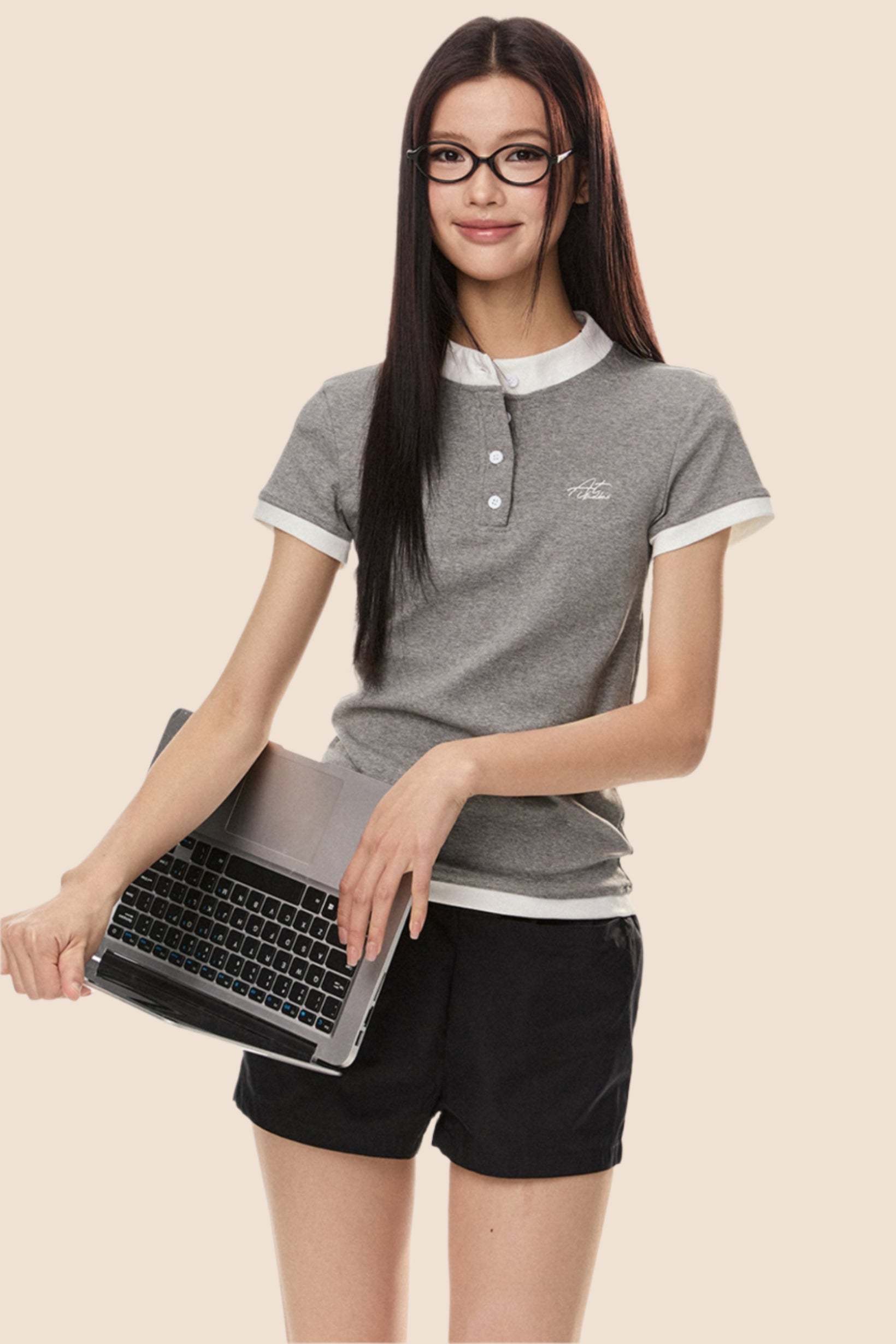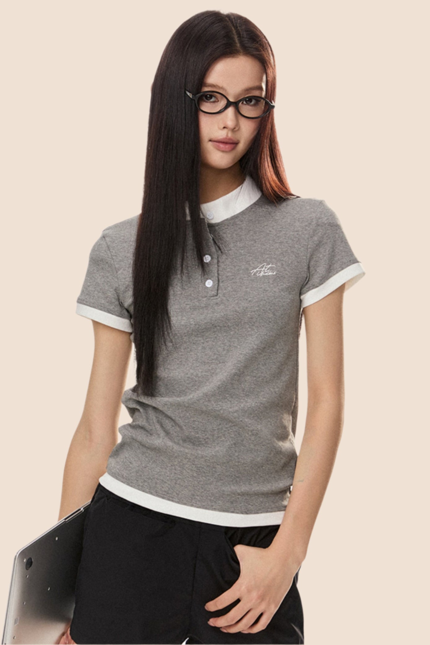 EZEK 아메리칸 레트로 페이크 투피스 그레이 반팔 티셔츠 여성 여름 신상 슬림 심플하고 다재다능한 대비 톱
