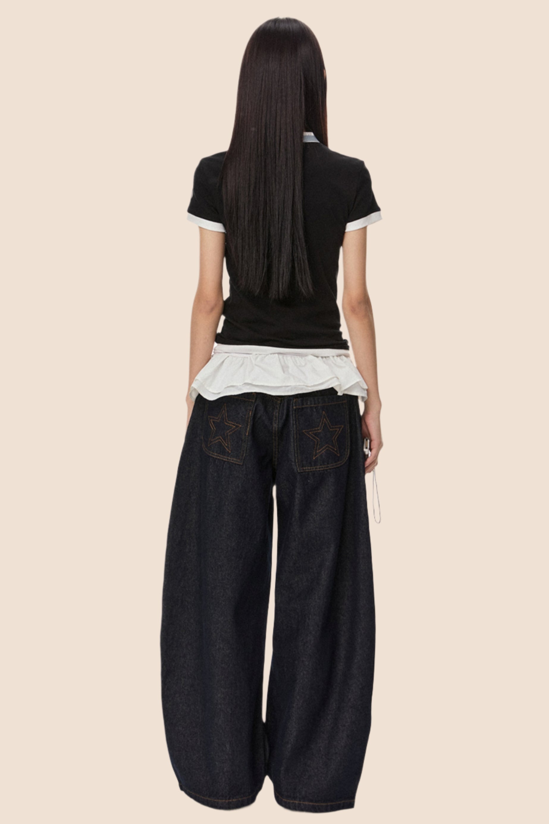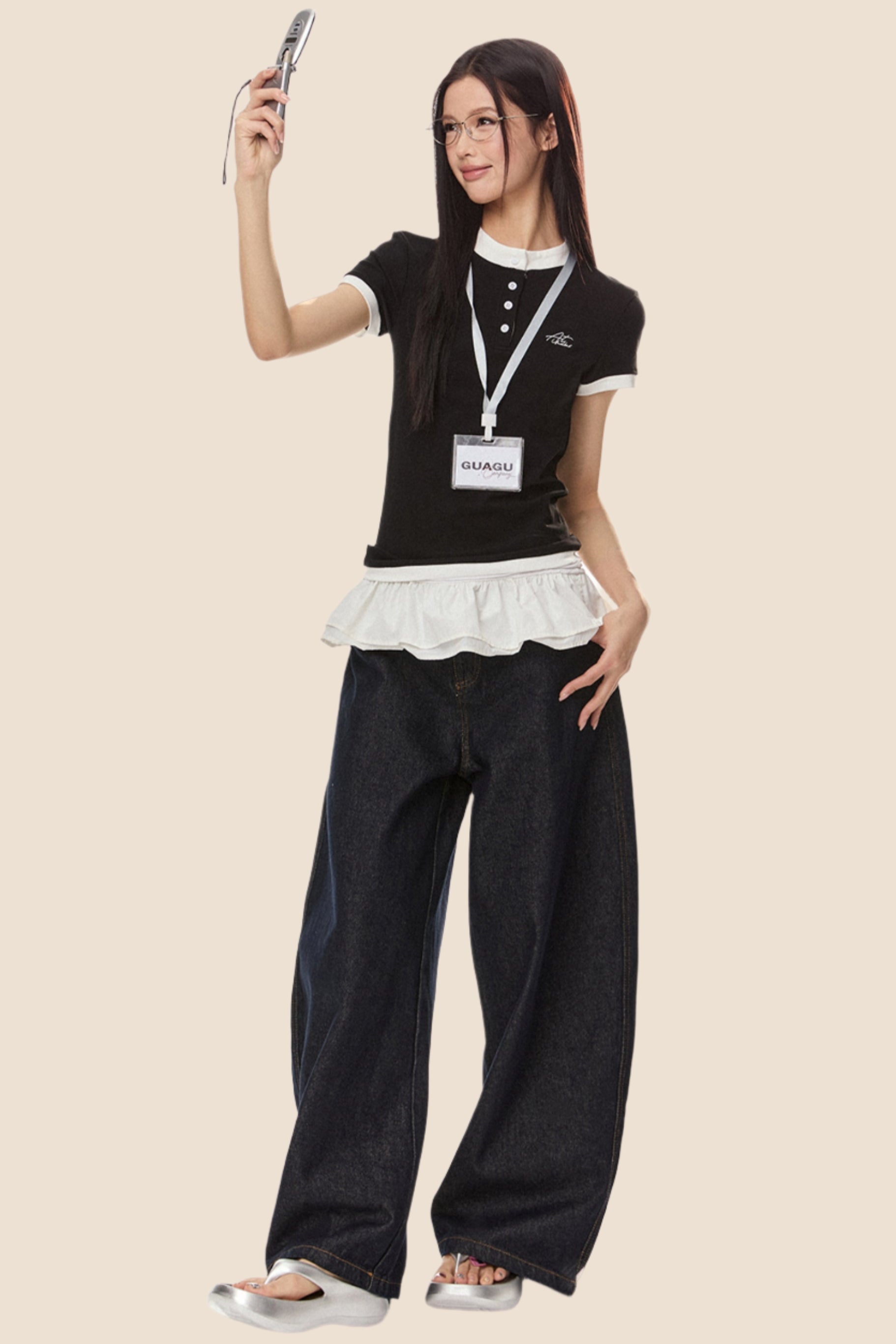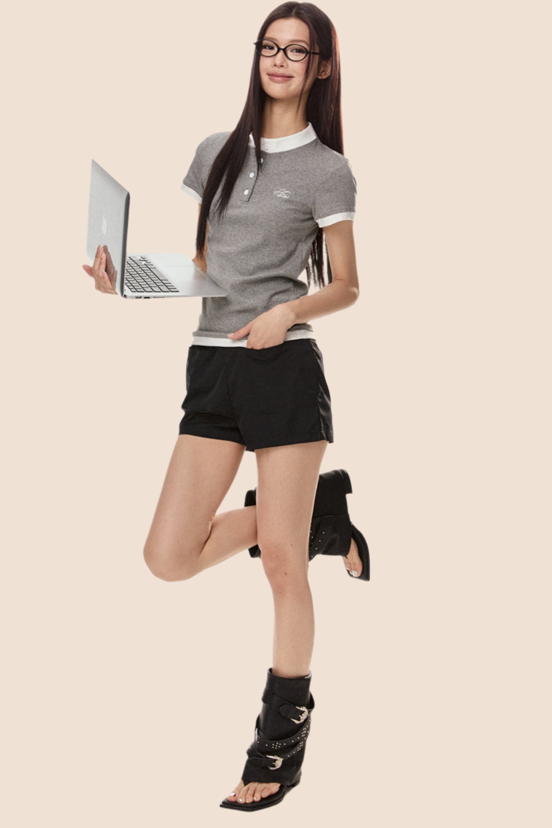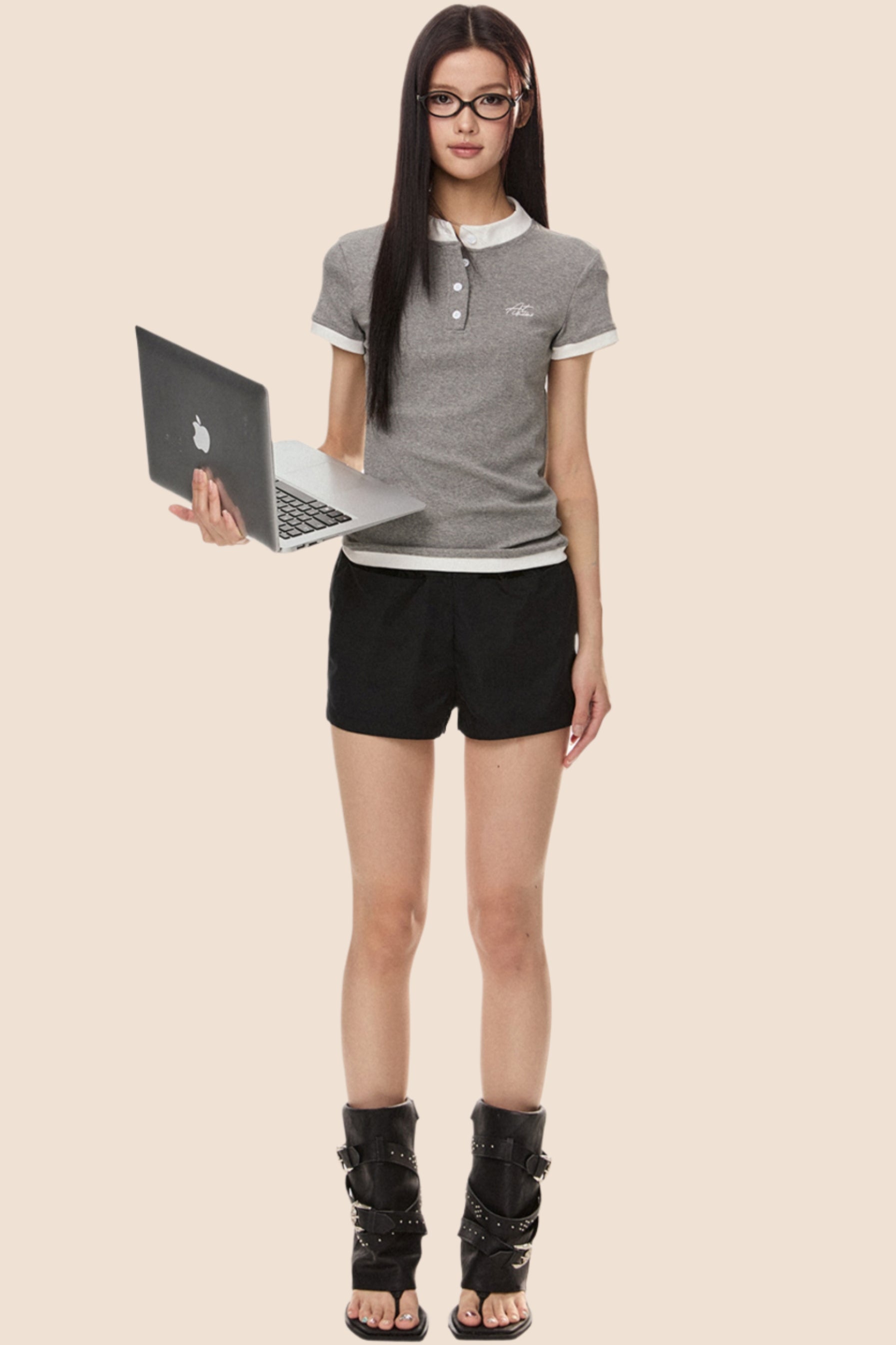 EZEK 아메리칸 레트로 페이크 투피스 그레이 반팔 티셔츠 여성 여름 신상 슬림 심플하고 다재다능한 대비 톱