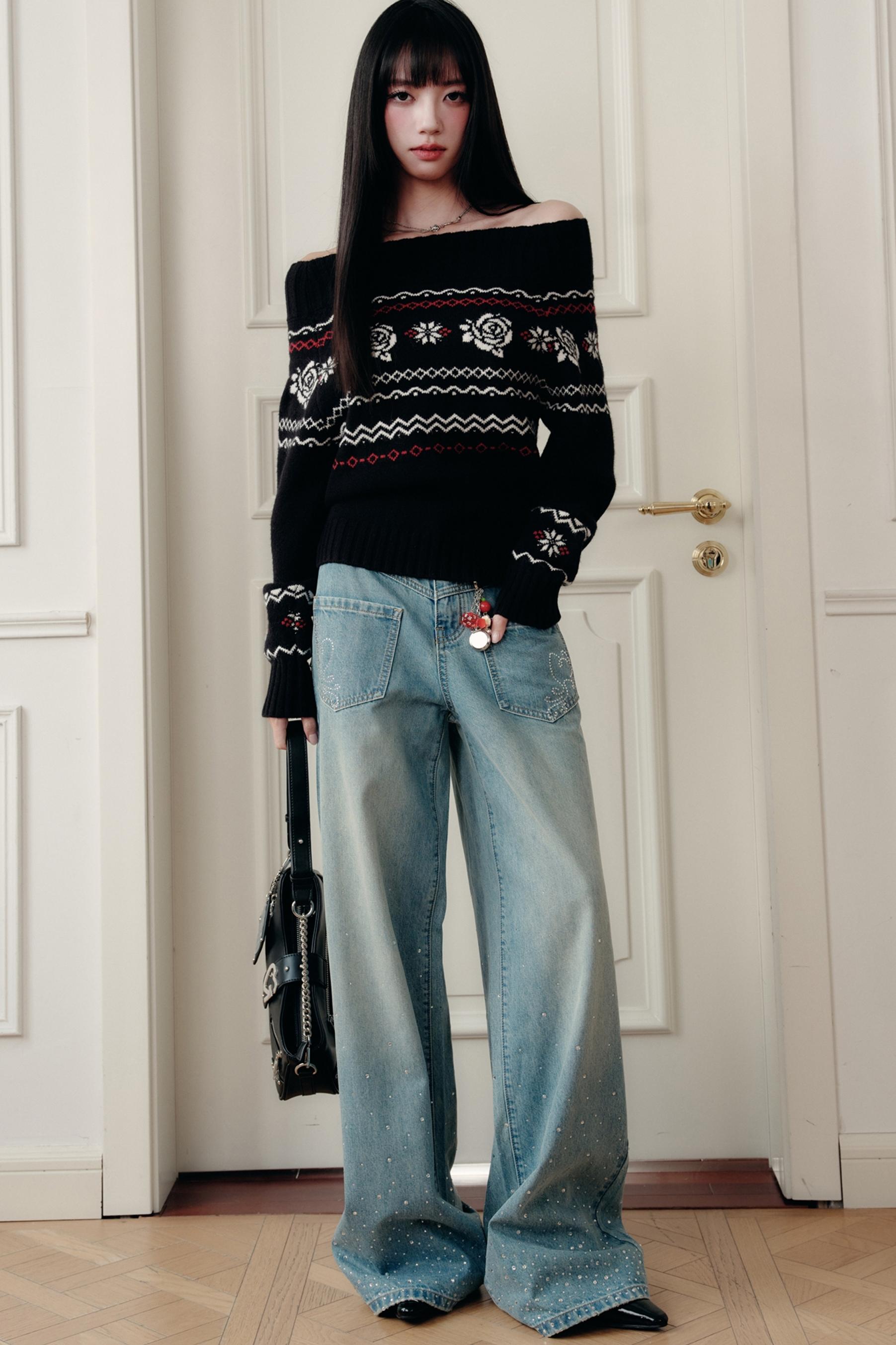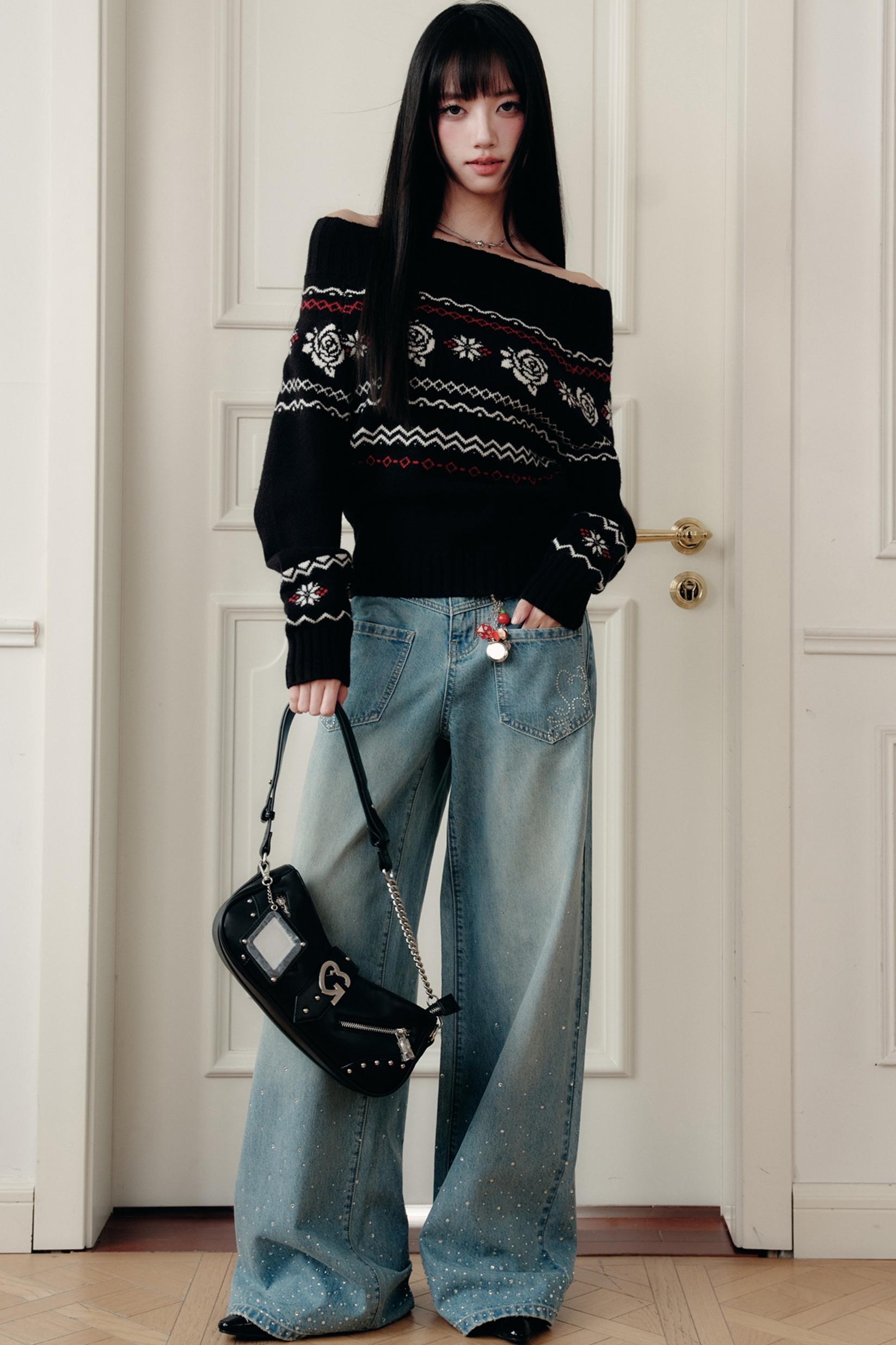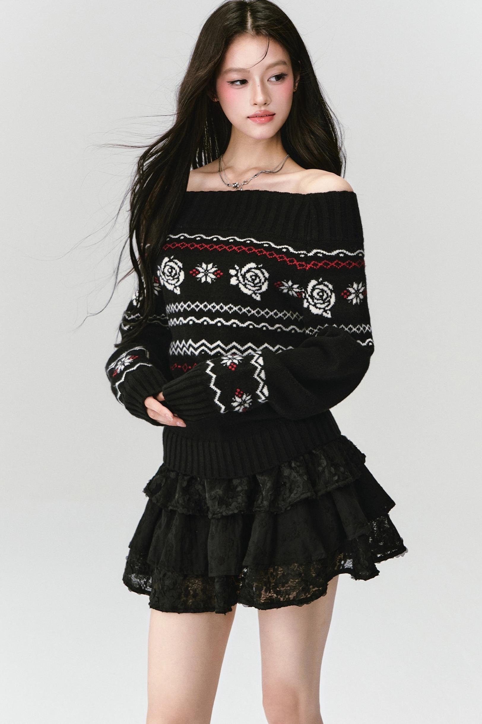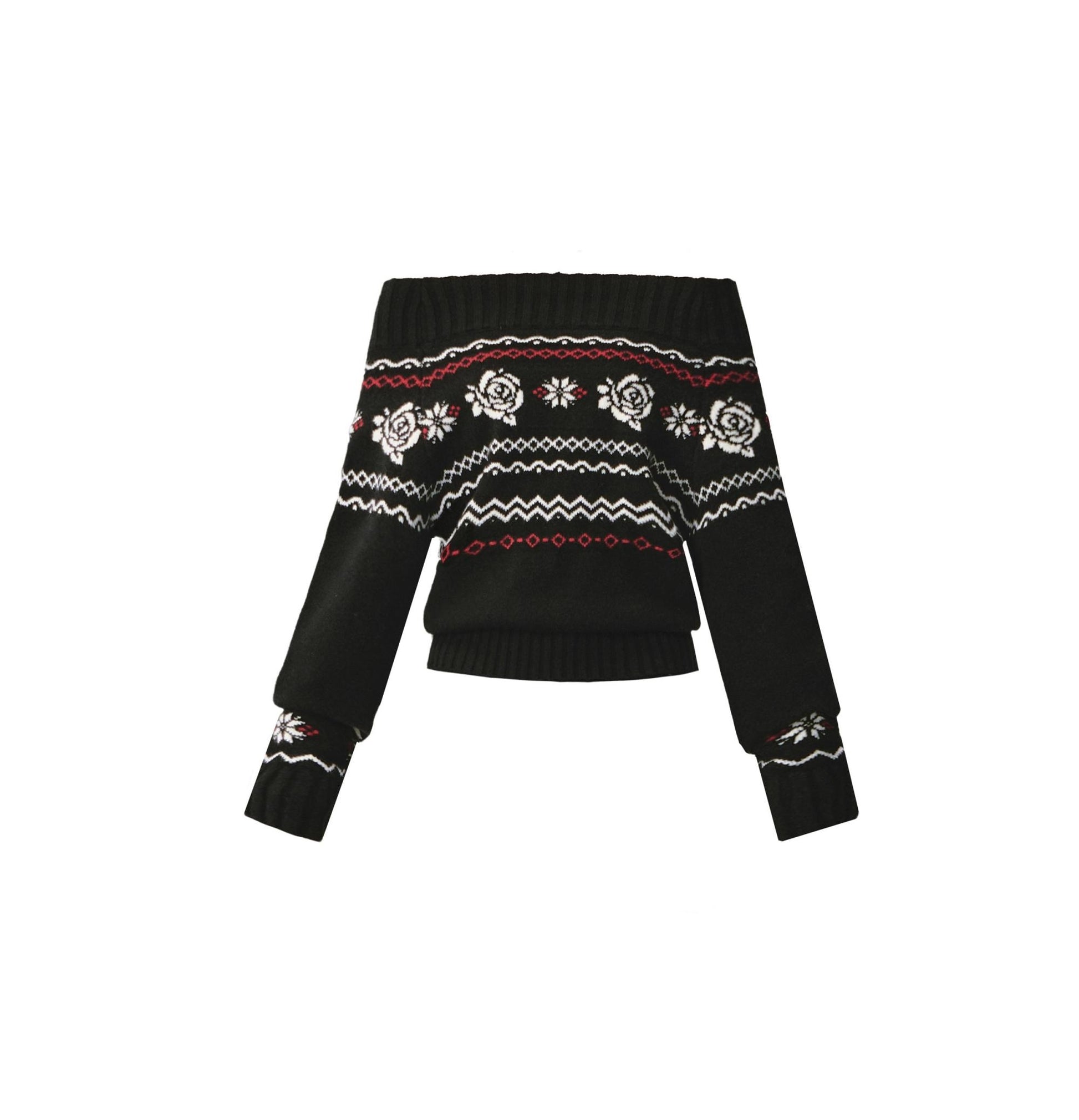 Fair Rose Jacquard One-Shoulder Sweater