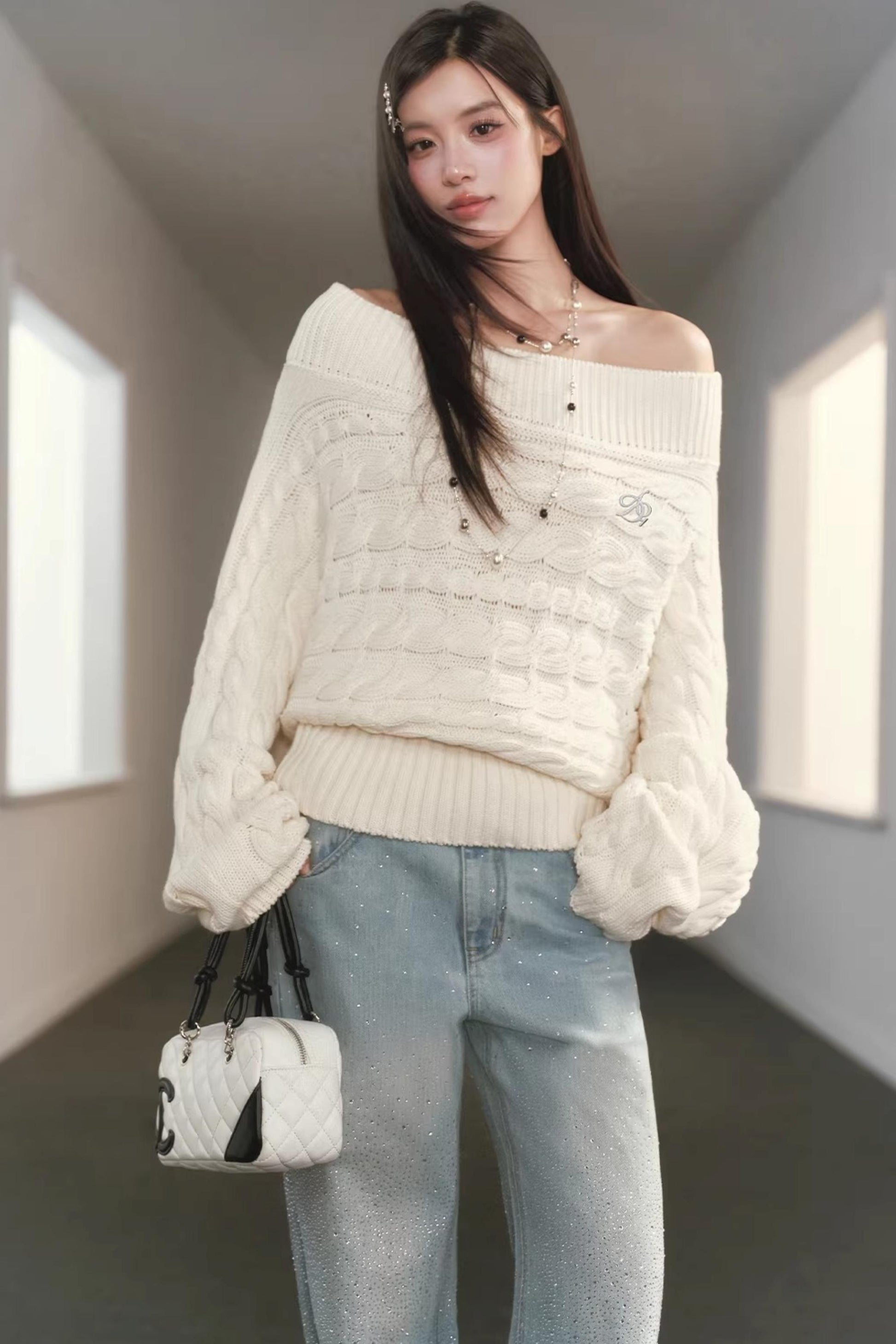 Slanted Shoulder Knit Sweater Set-Up
