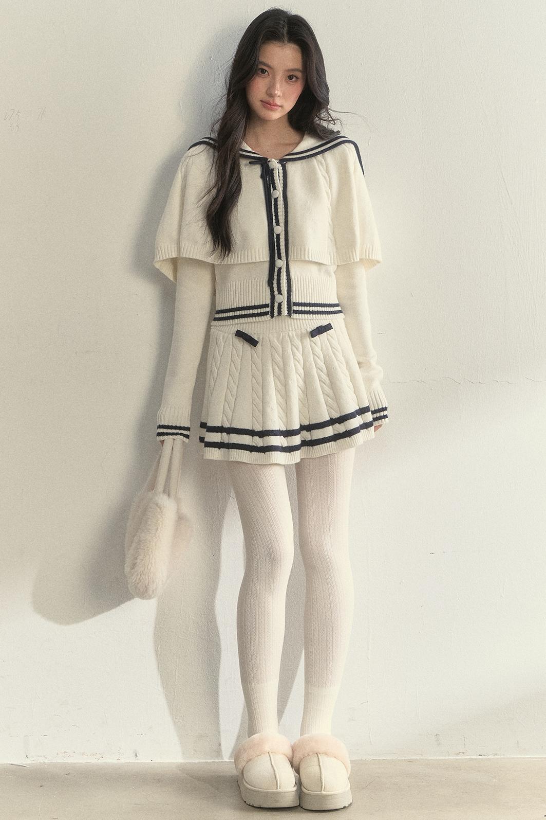 Vintage Navy Twist-Knit Cape Sweater Skirt Set-Up