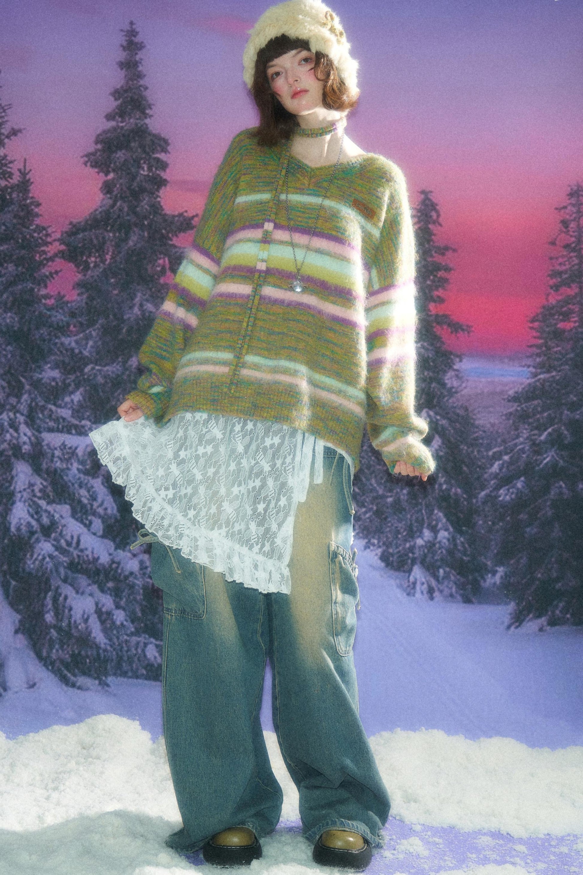 Autumn Winter Color-Blocking Striped V-Neck Sweater