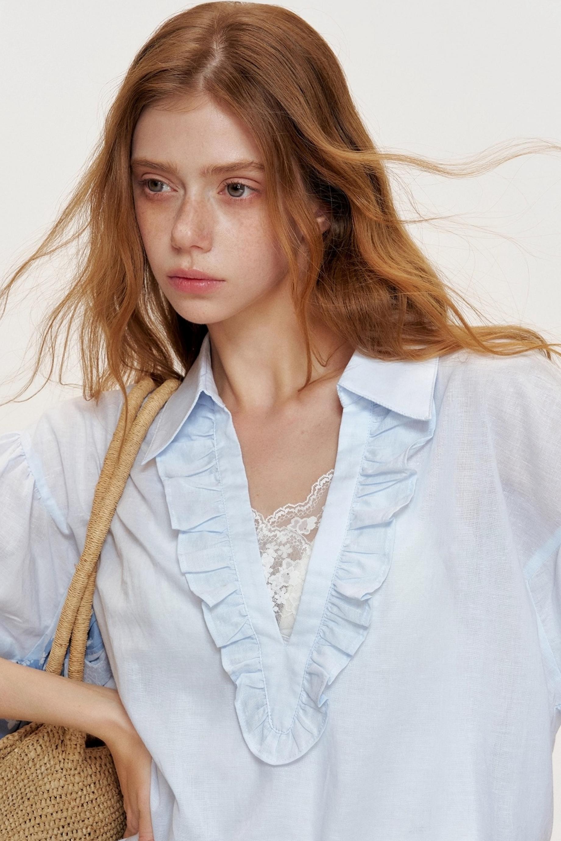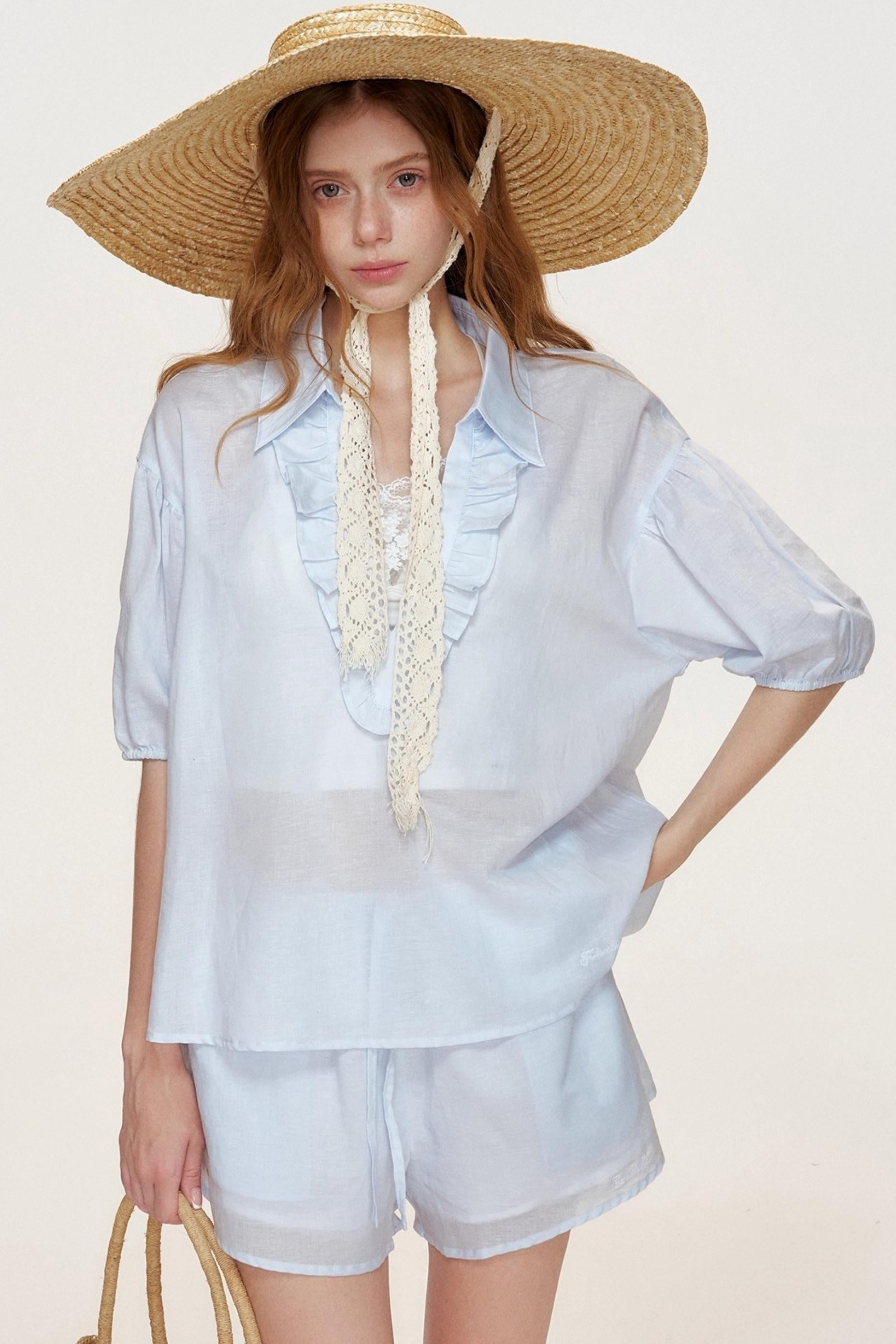 Blue Ocean Linen Cotton V-Neck Stitched Shorts Set-Up