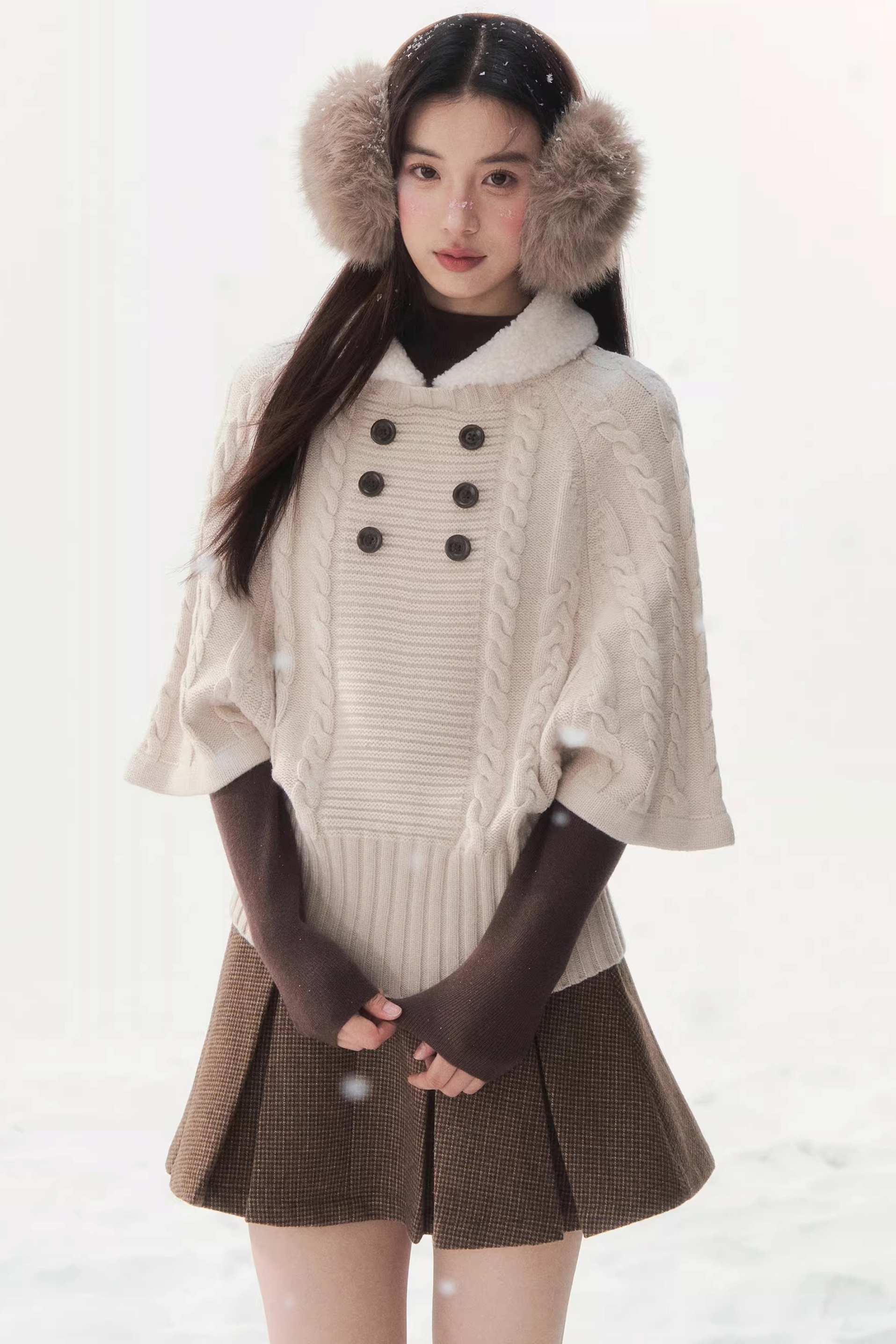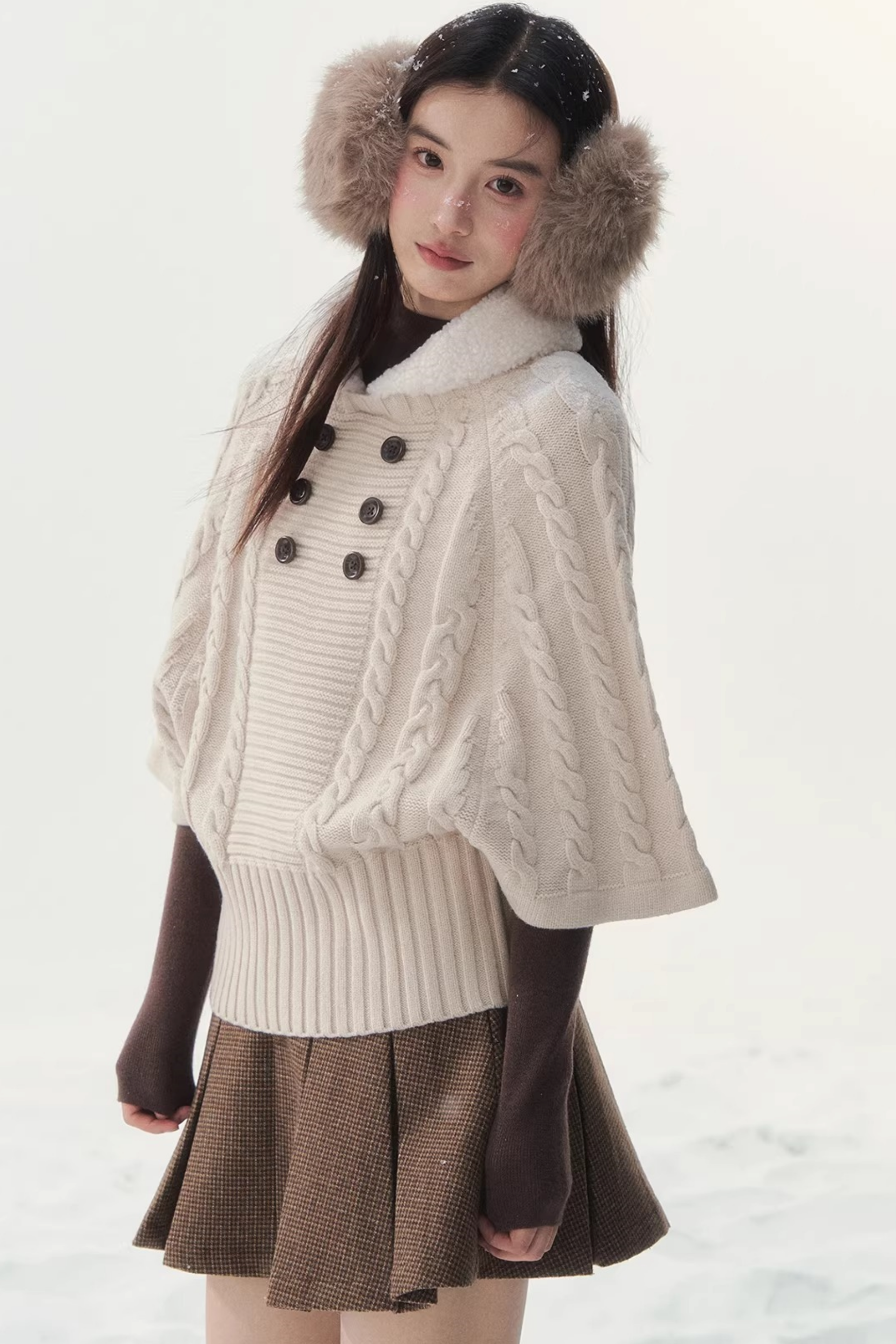 Coffee-Colored Fur Collar Cape Sweater