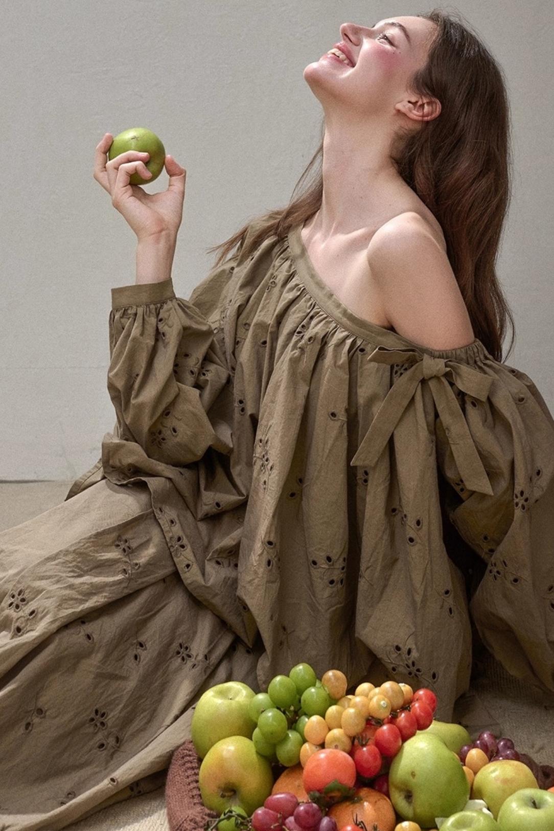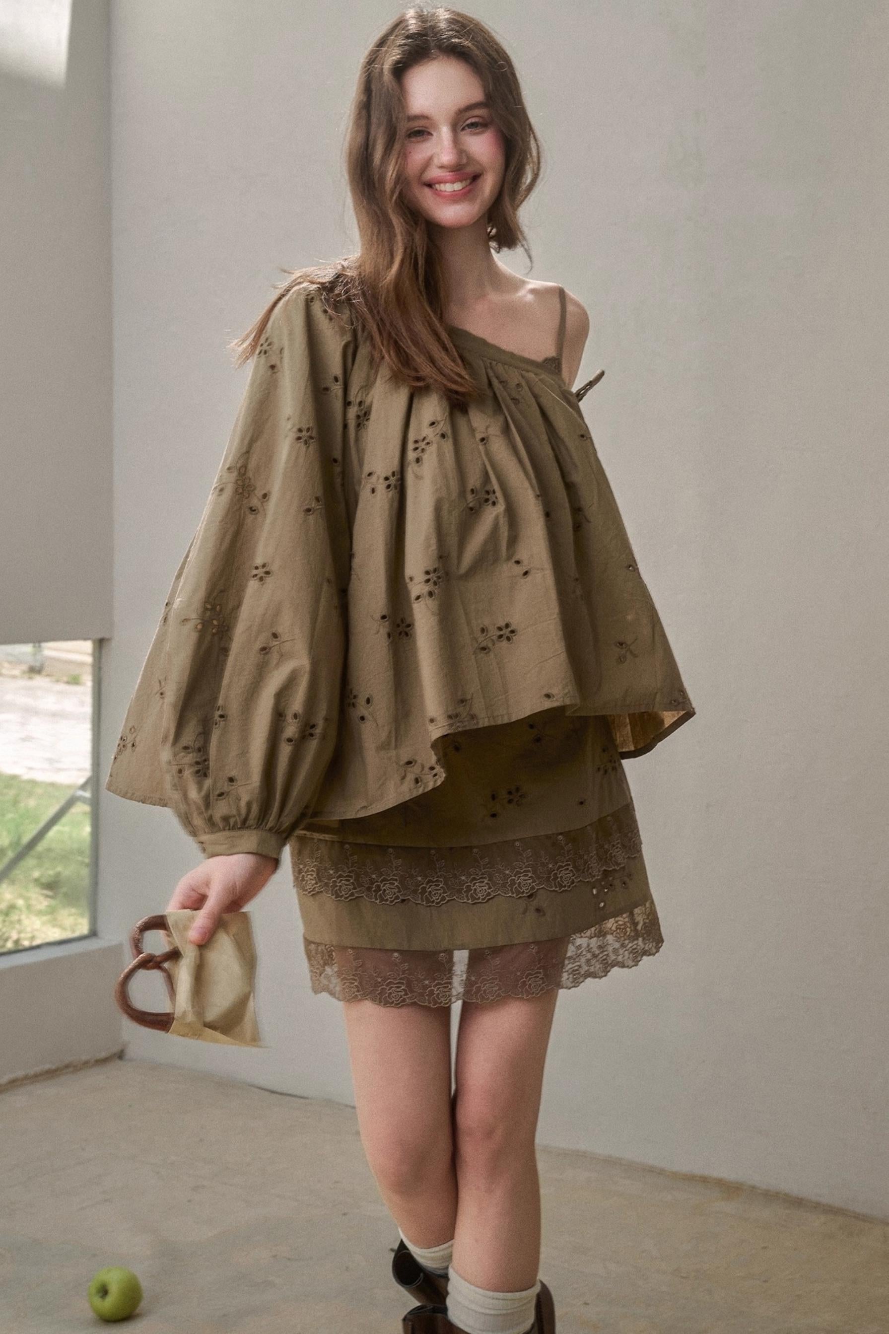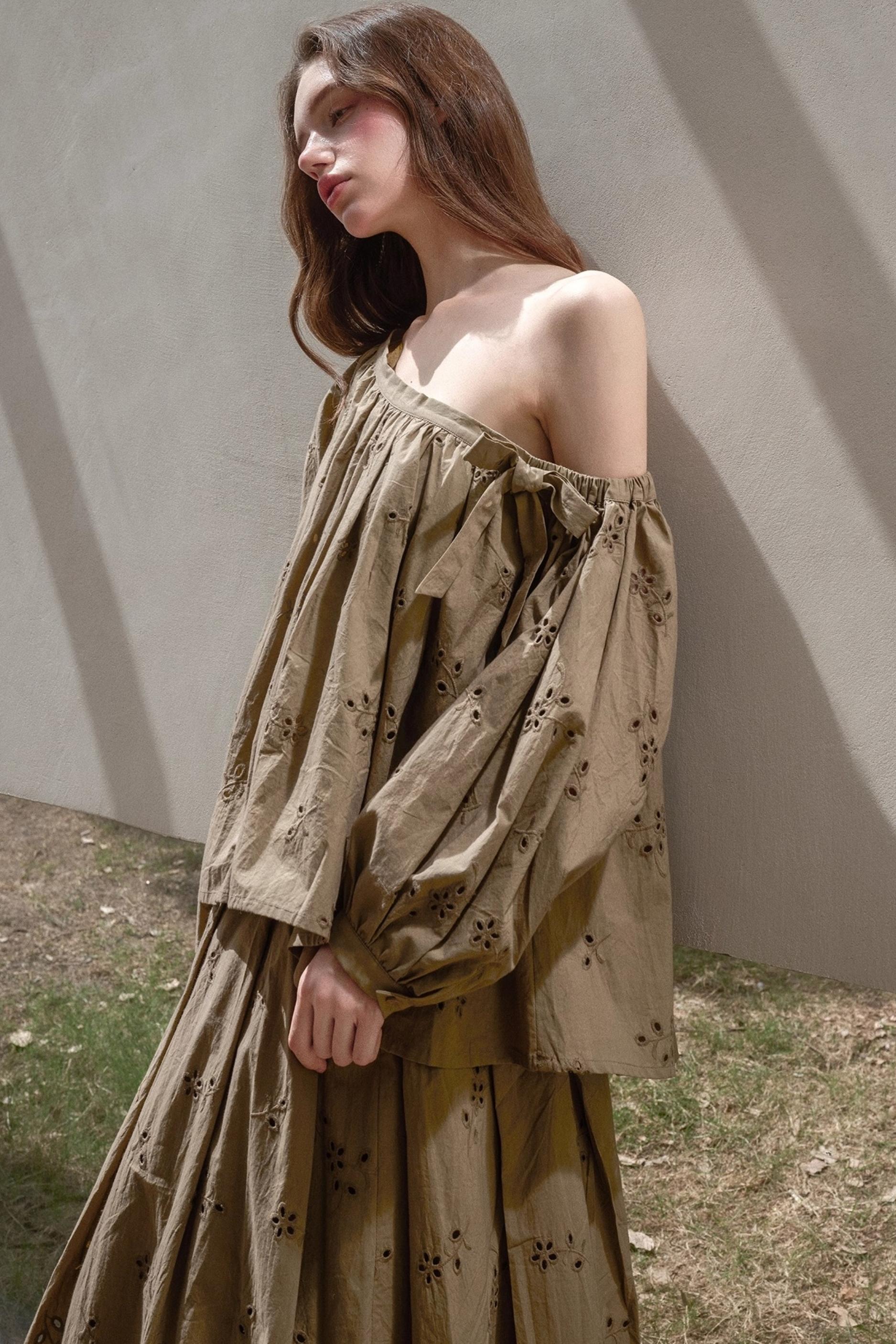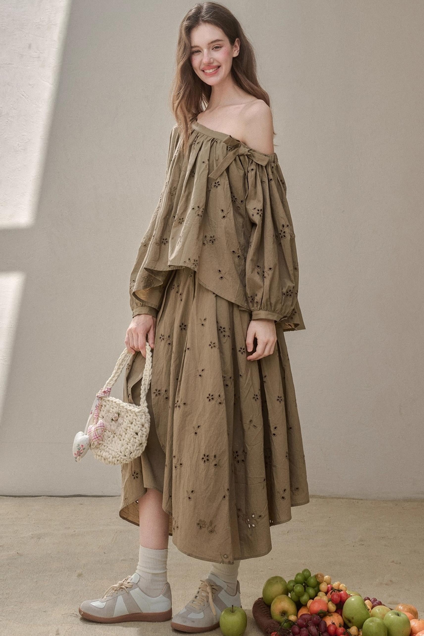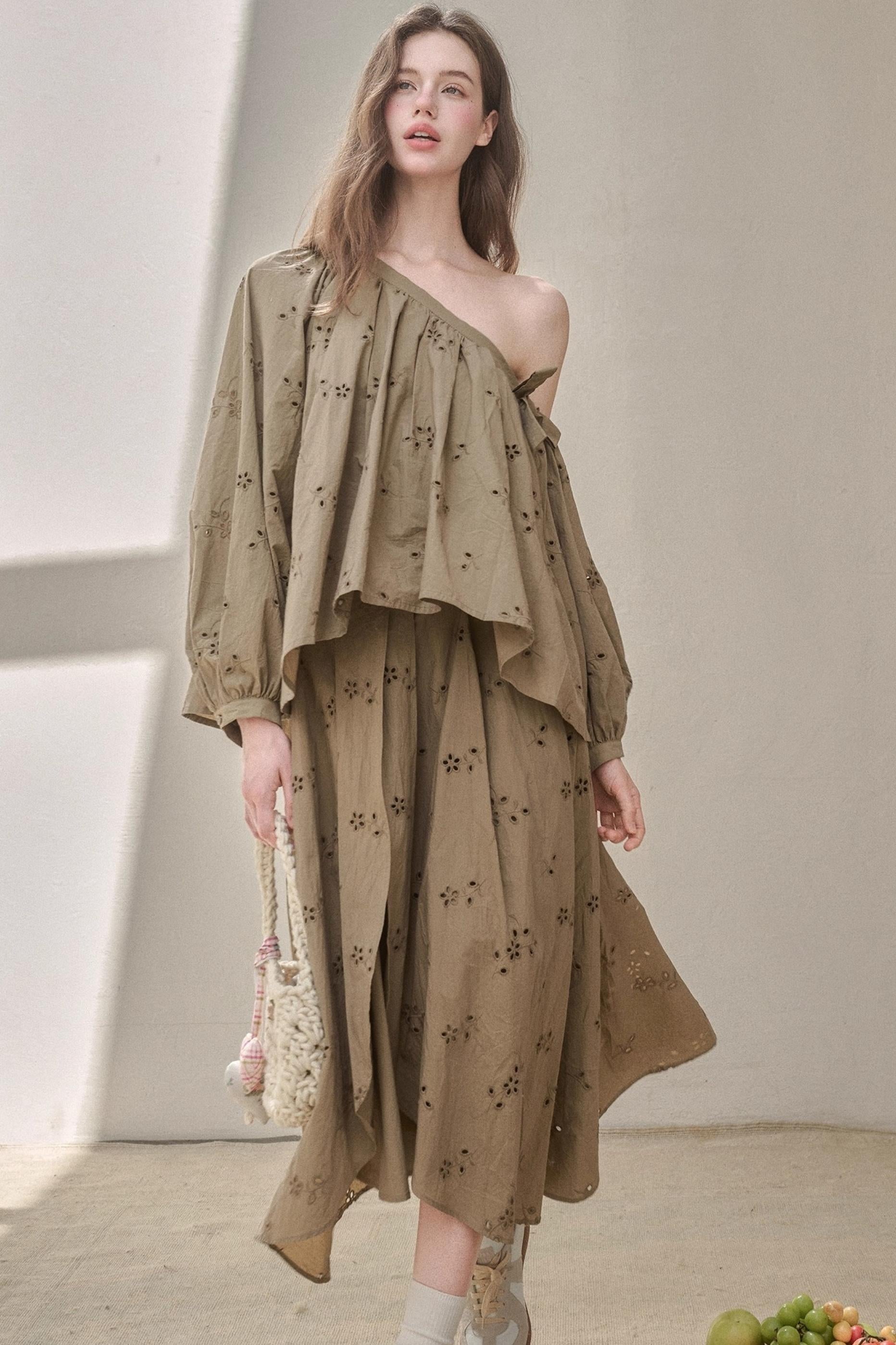 Embroidery Elegant Slanted Shoulder Skirt Set-Up
