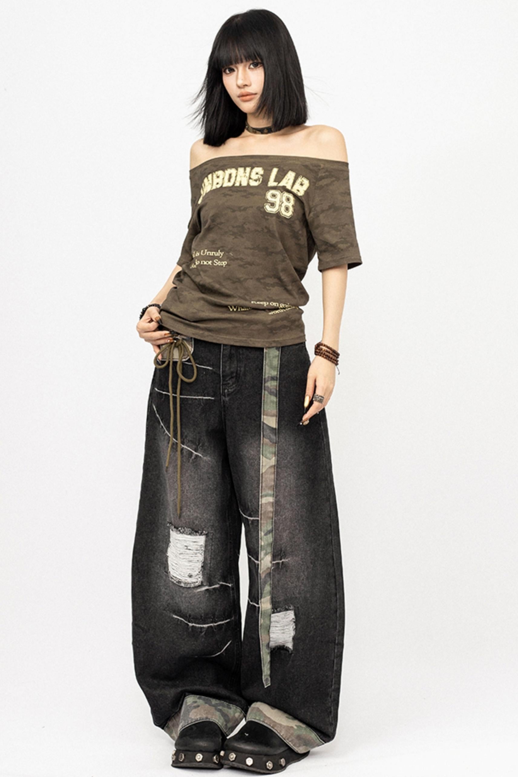 American Vintage Camouflage Ripped Loose Floor-Length Pants