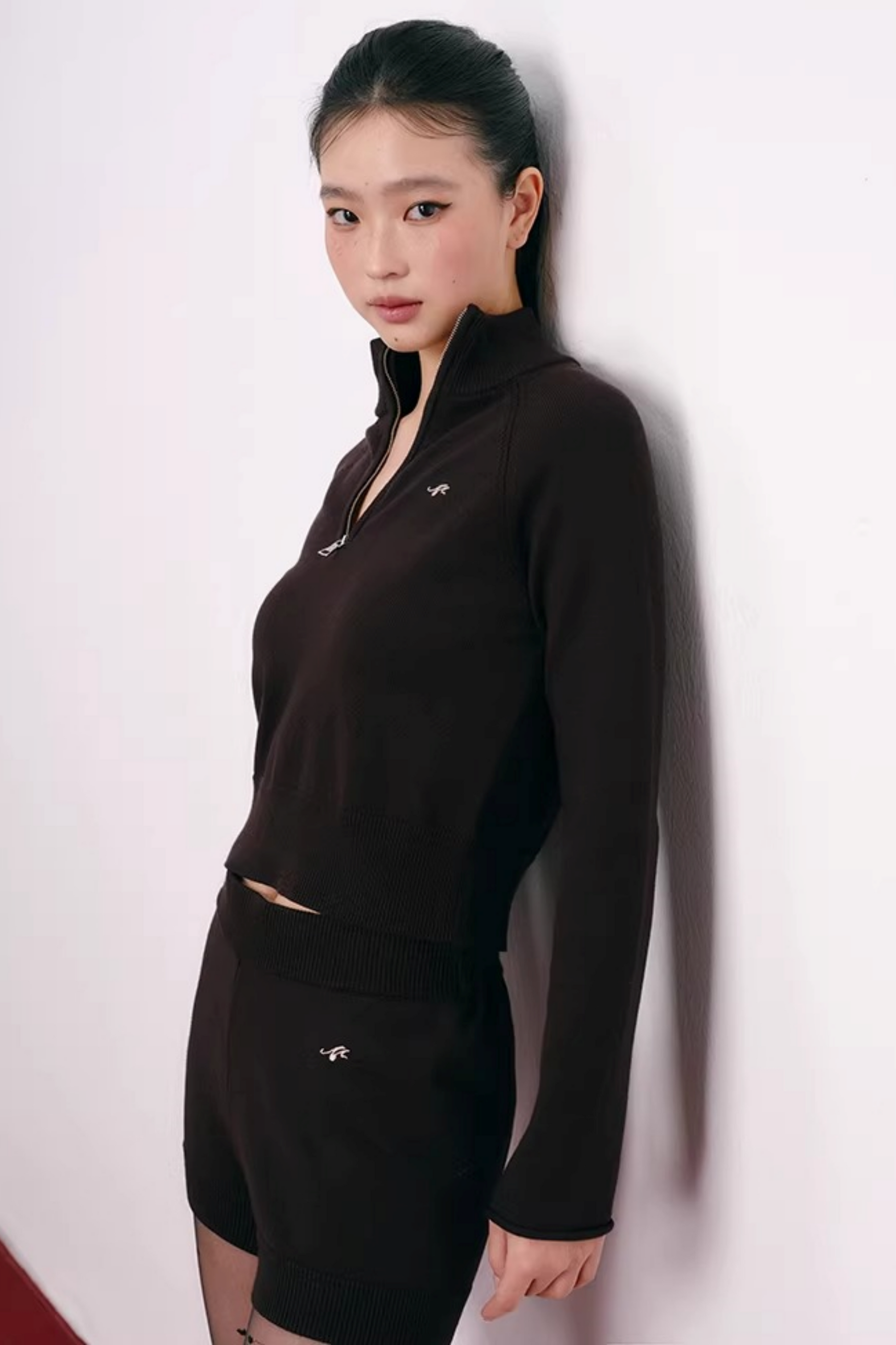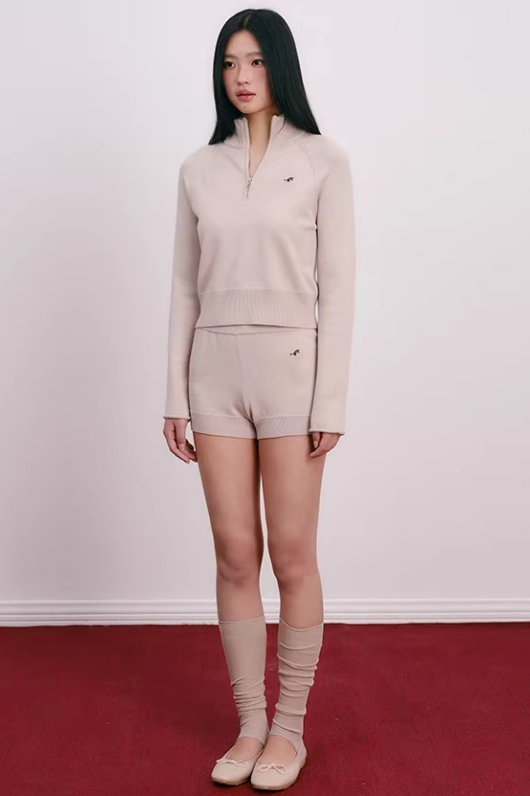 Cherry Embroidery Half-Zip Top Set