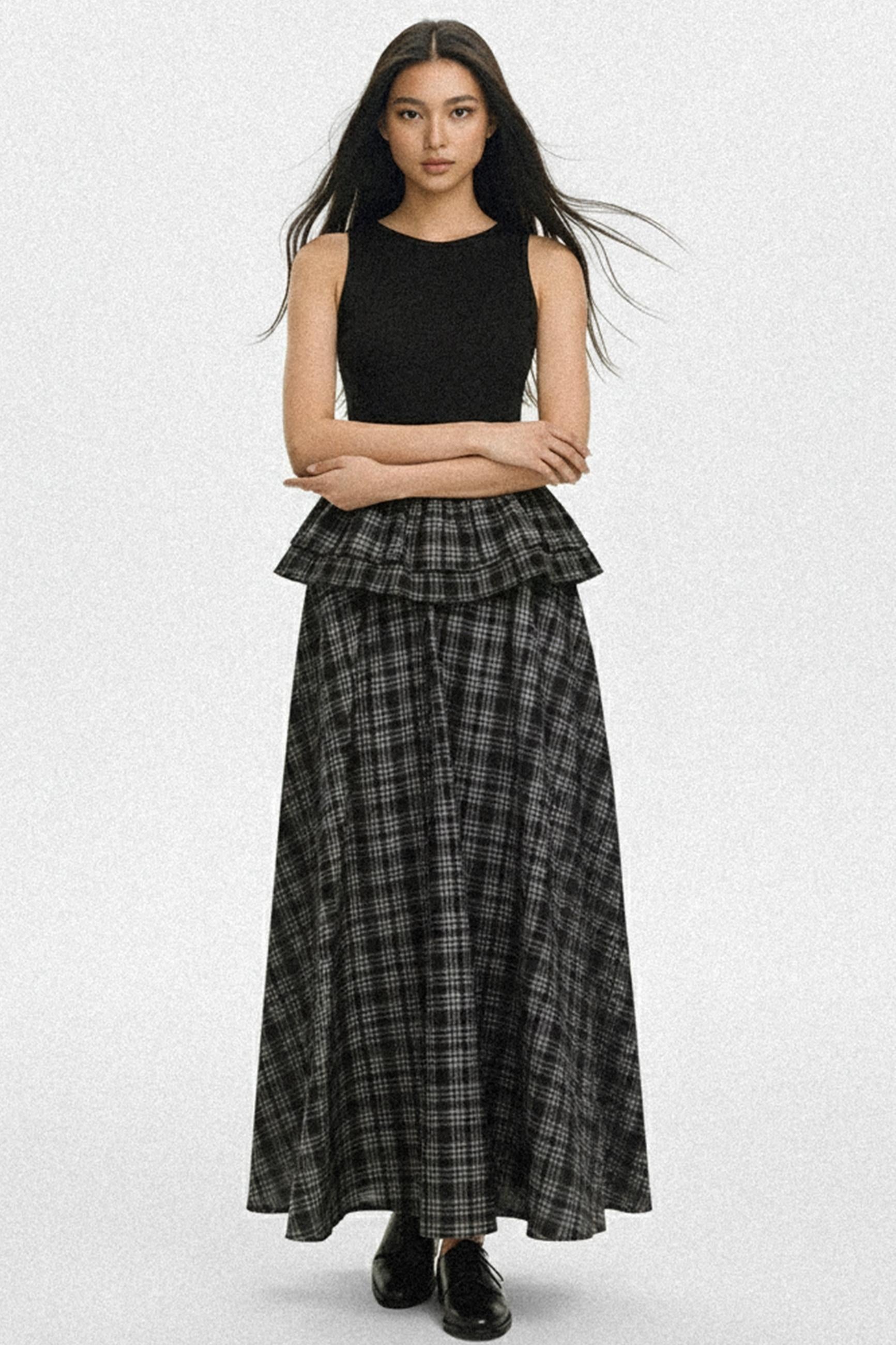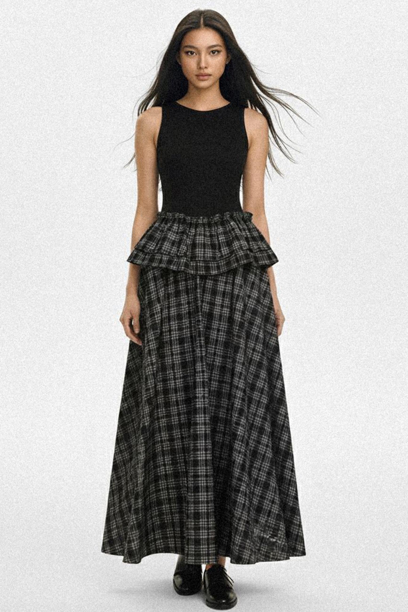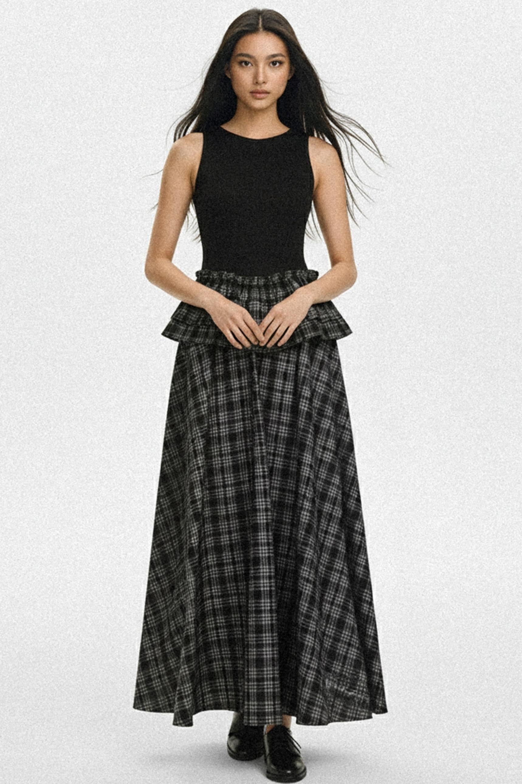 Knit Plaid V-Lace A-Line Maxi Dress