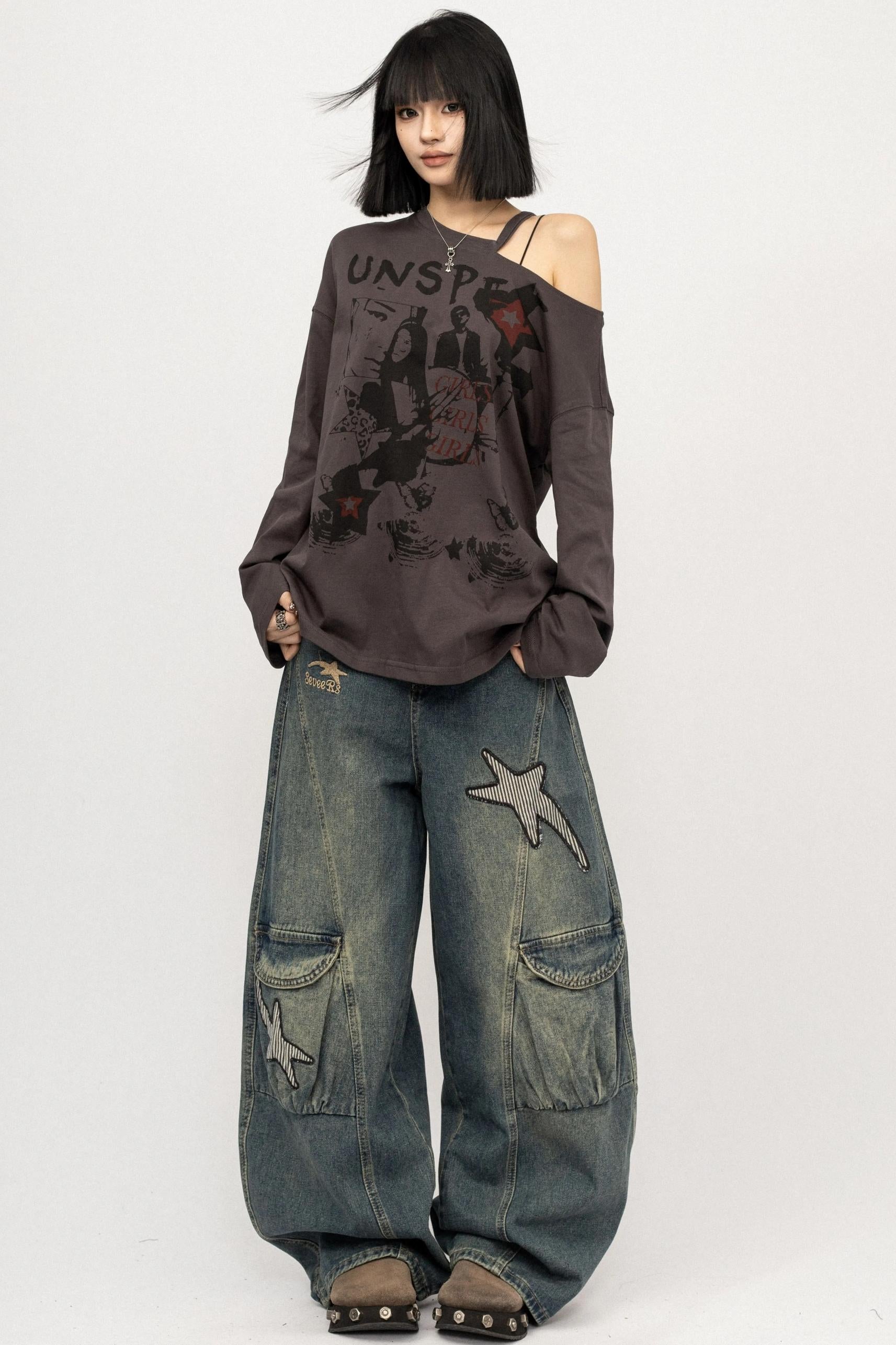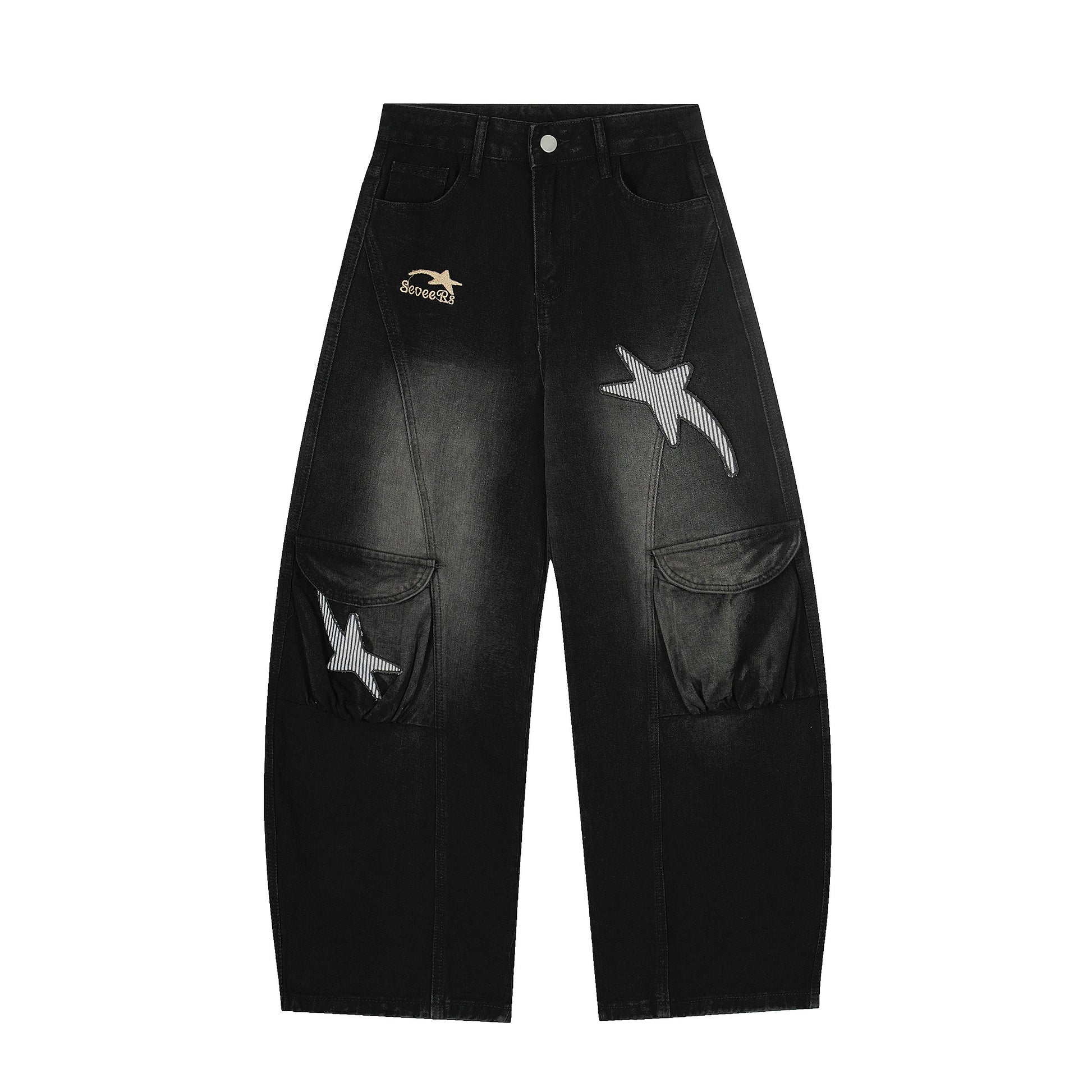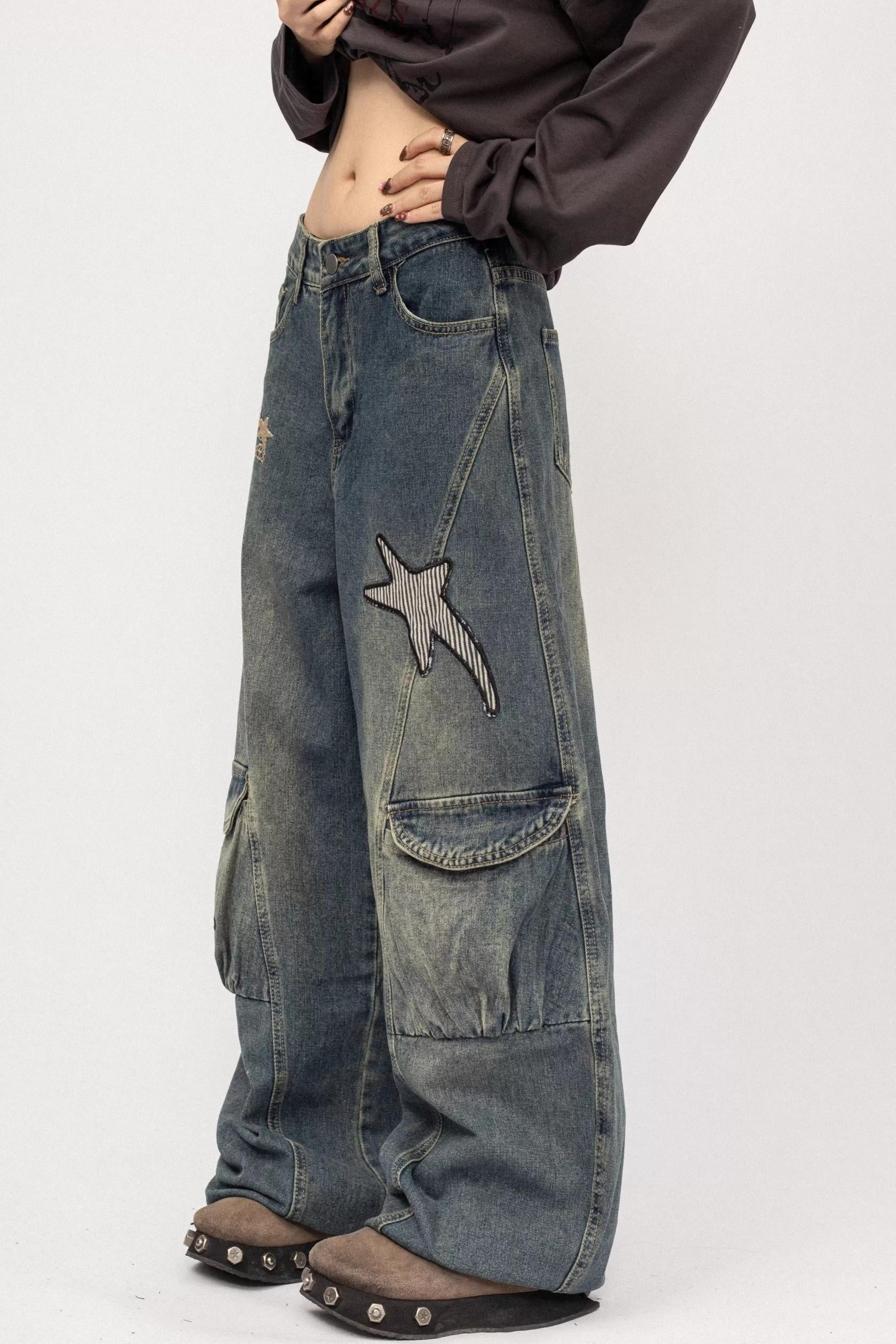 Vintage Distressed Star Embroidered Wide-Leg Cargo Pants