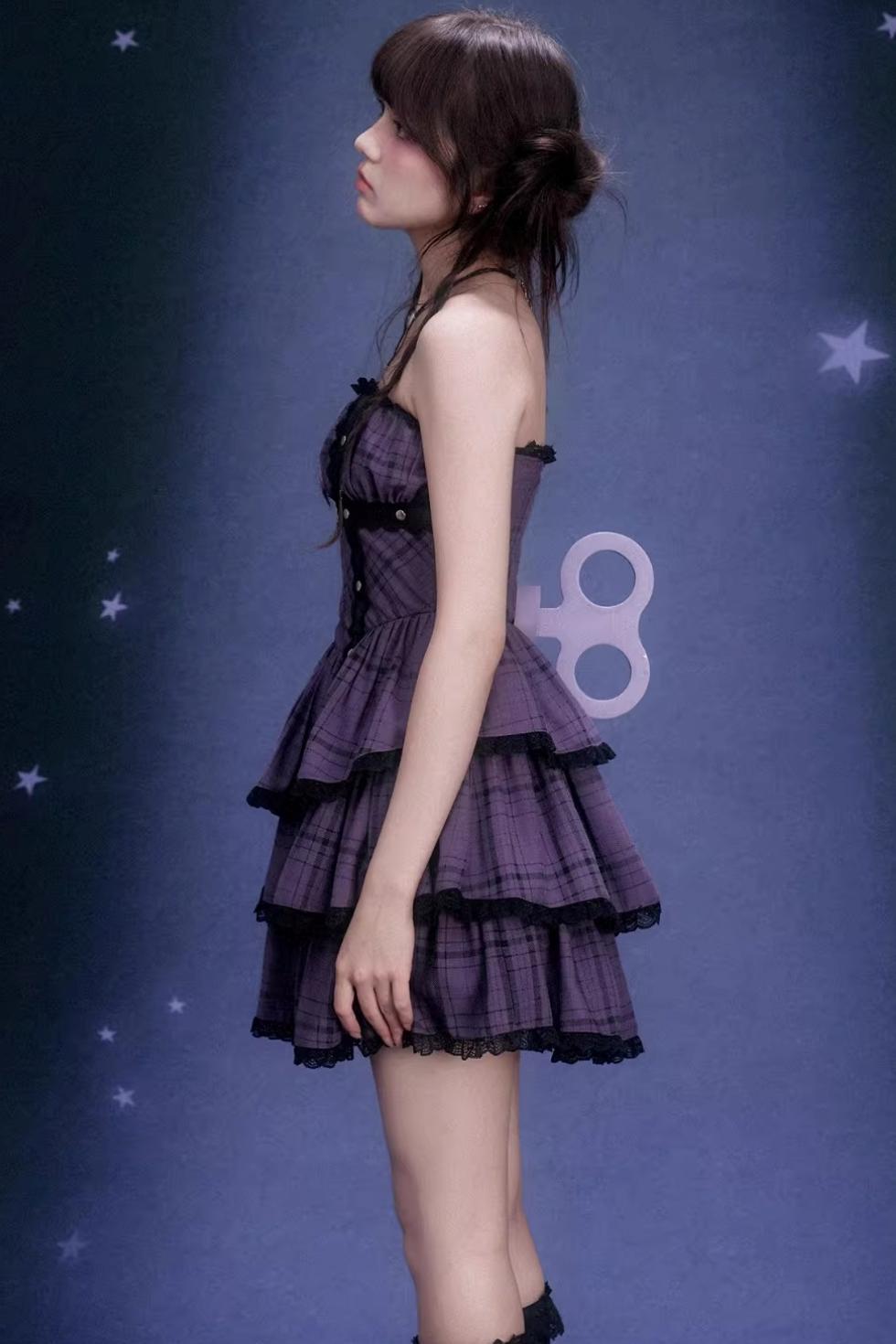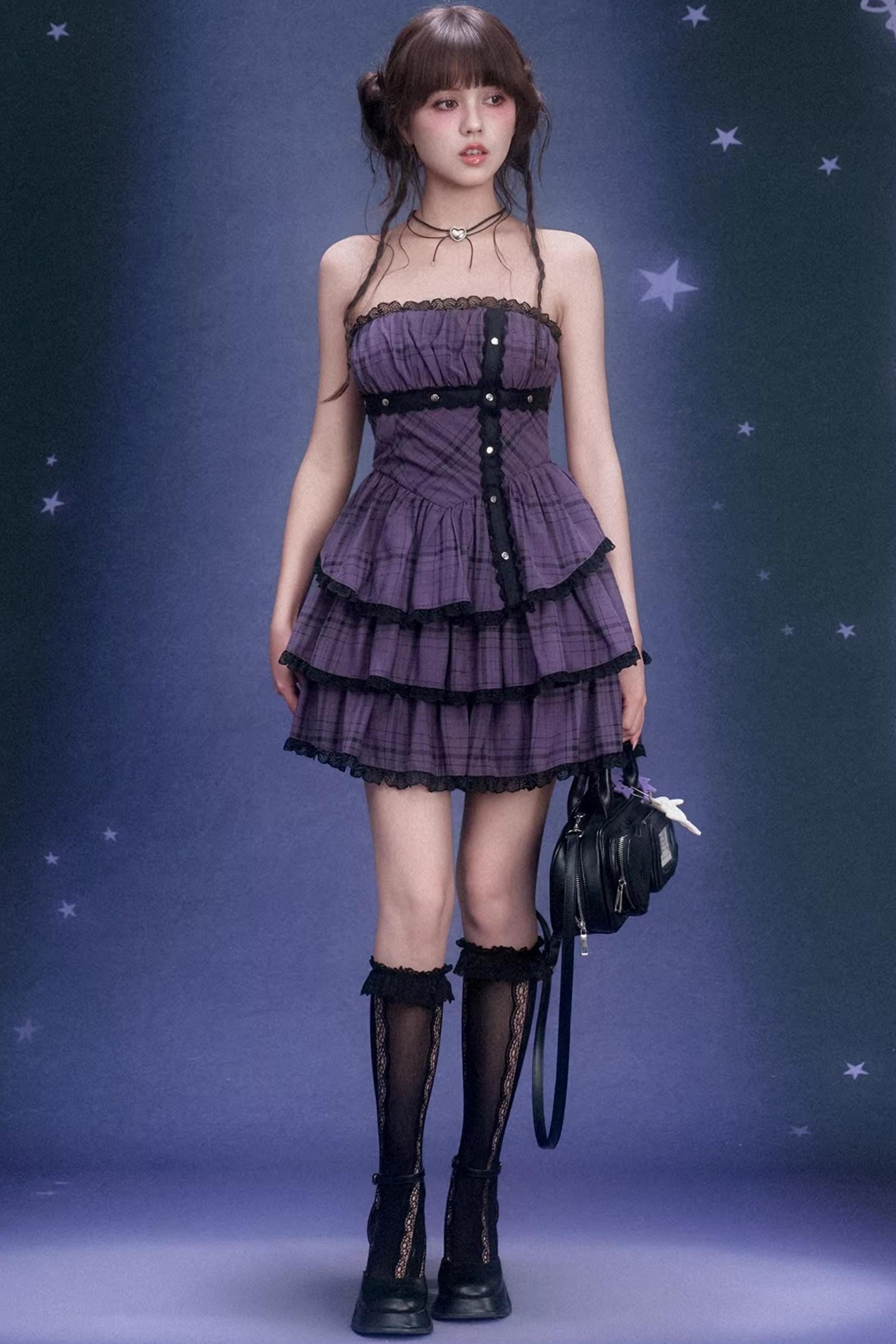 Grape Purple Plaid Strapless Dress Set