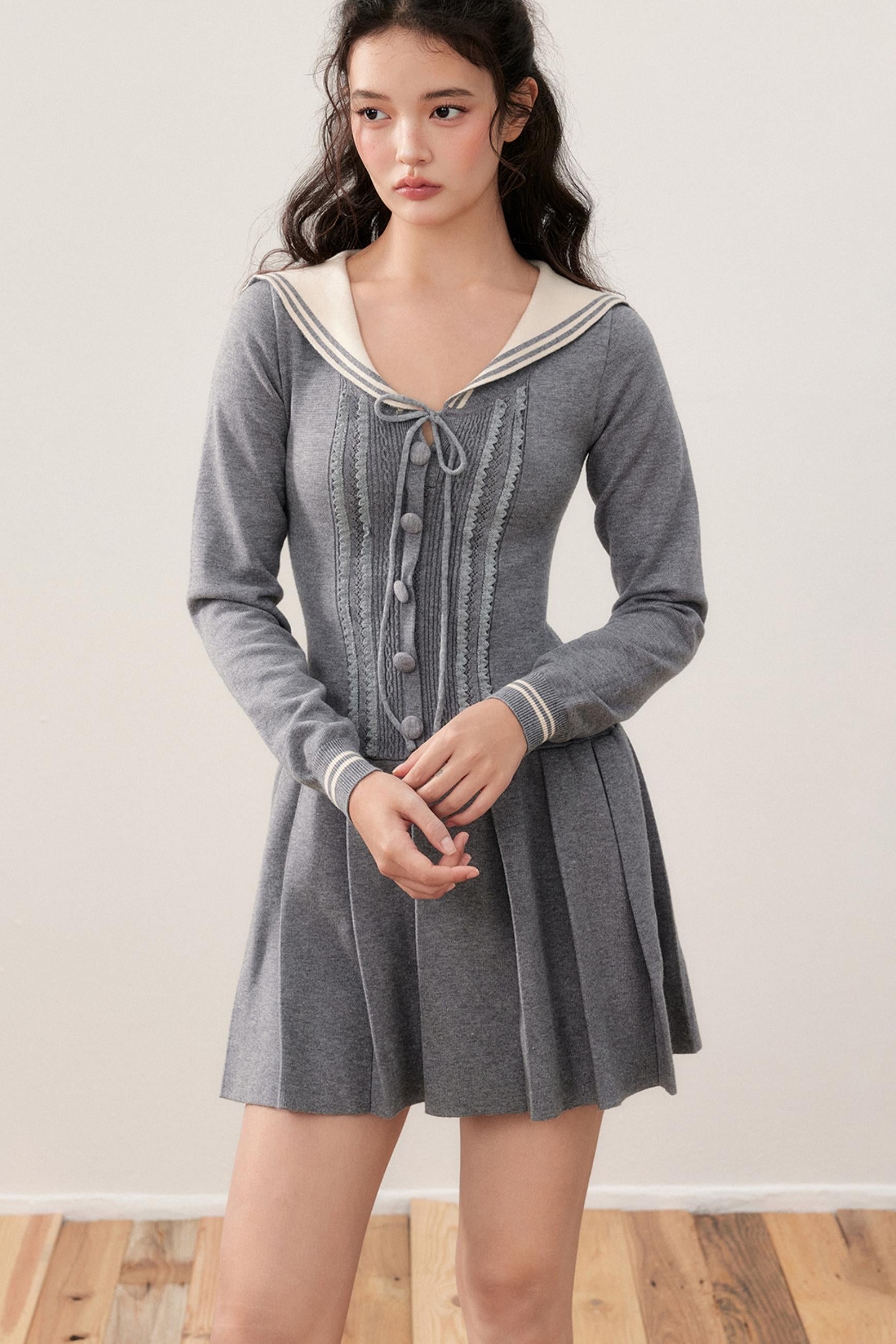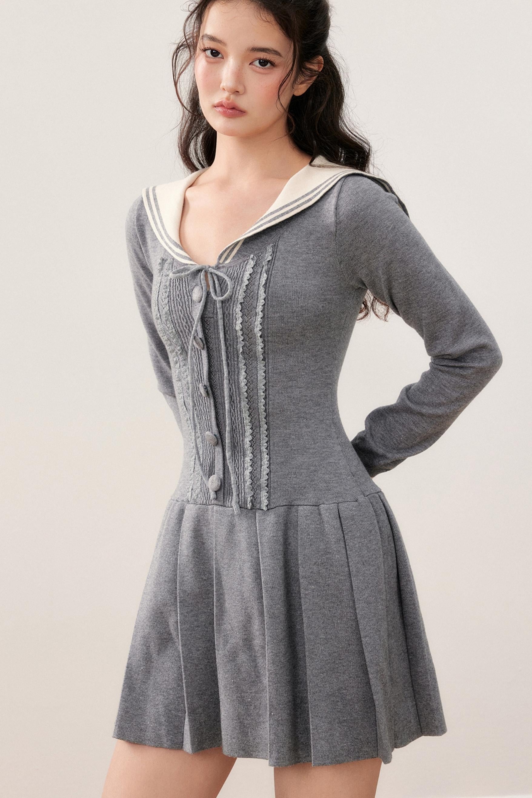 Navy Collar Sailor Sweet Lace Pleated Dress