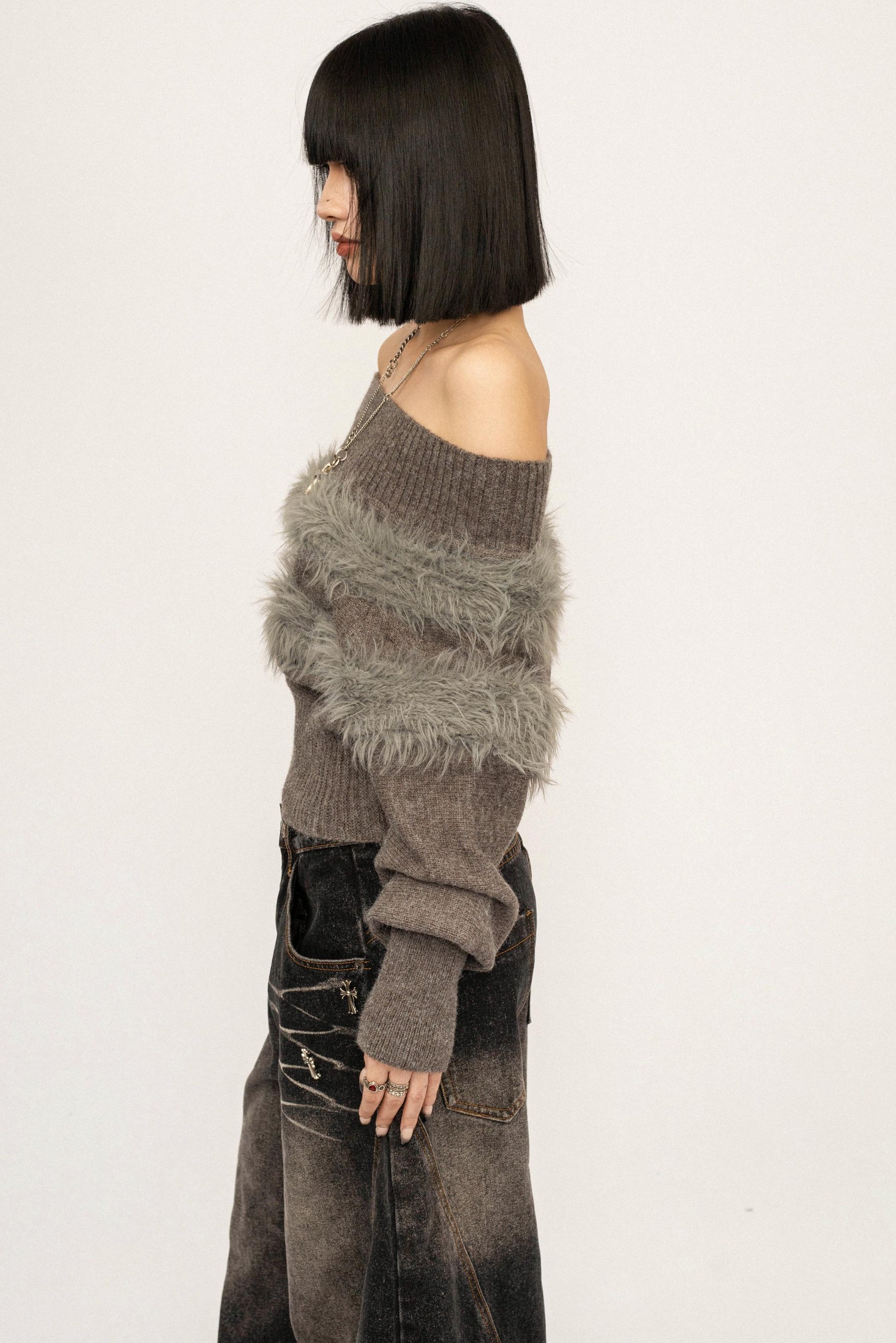 Off-Shoulder Fur Trim Sweater