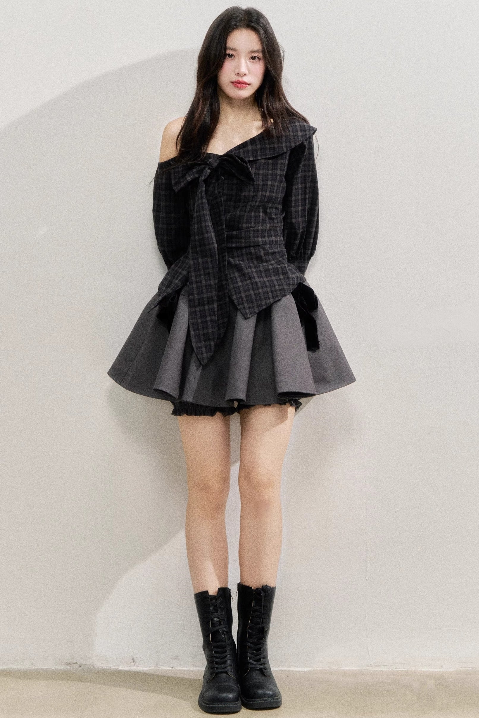 Plaid Bow One-Shoulder Waist Shirt