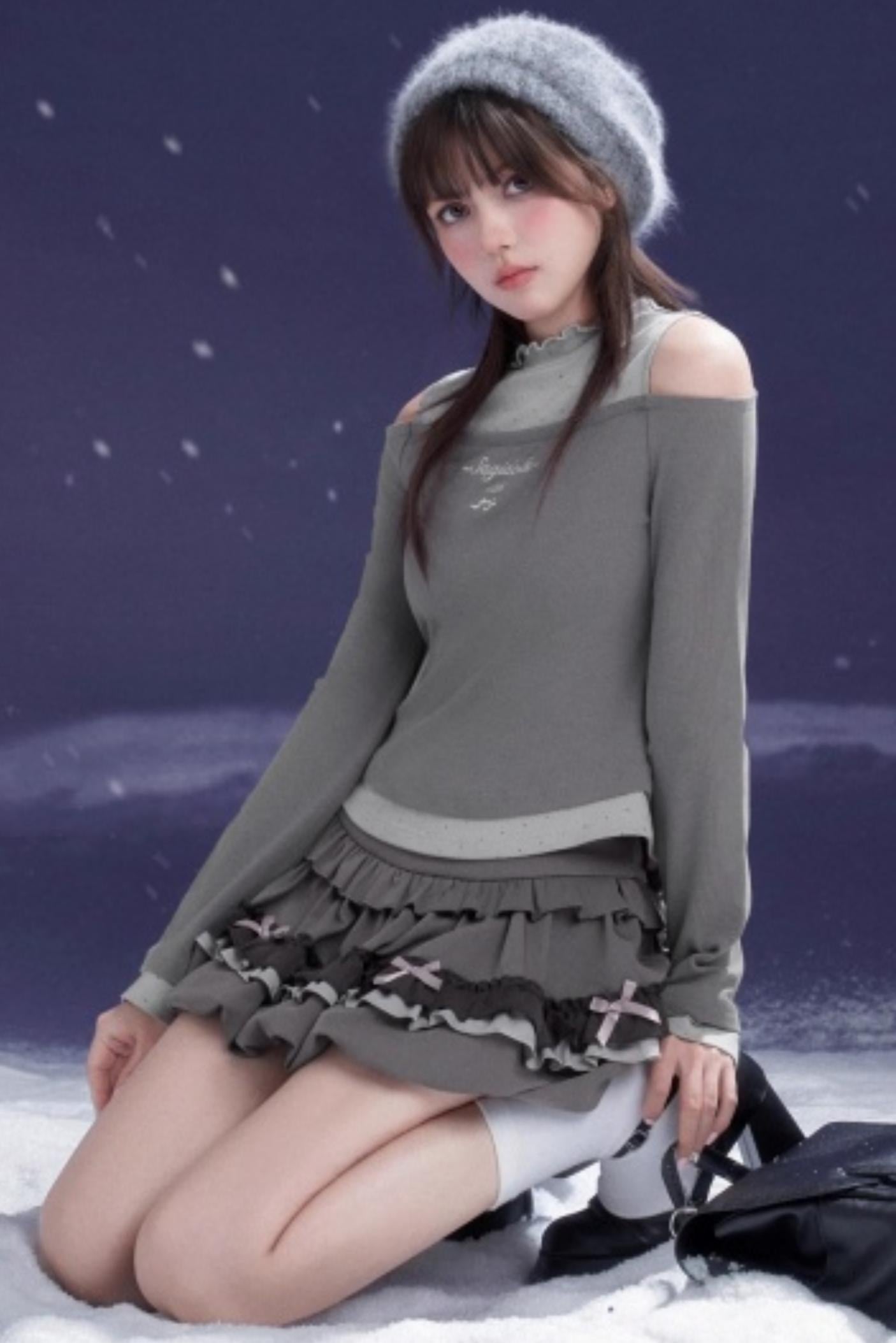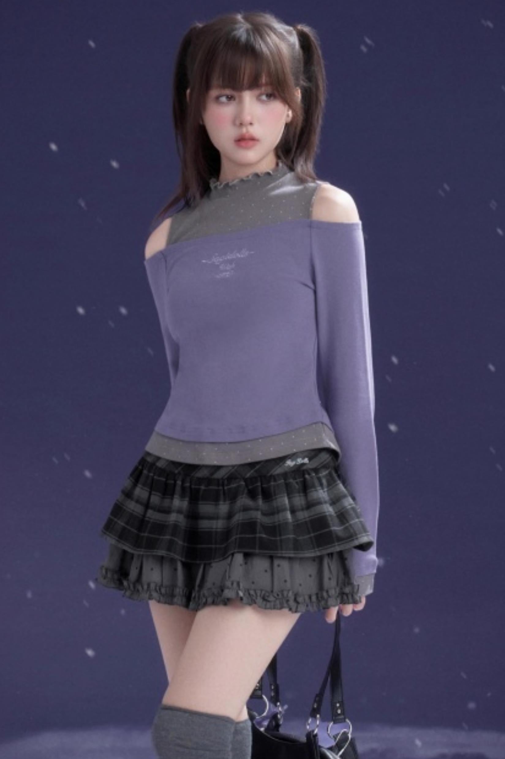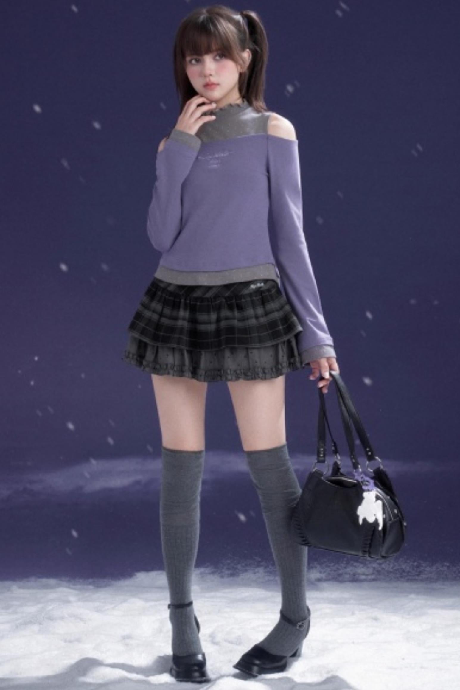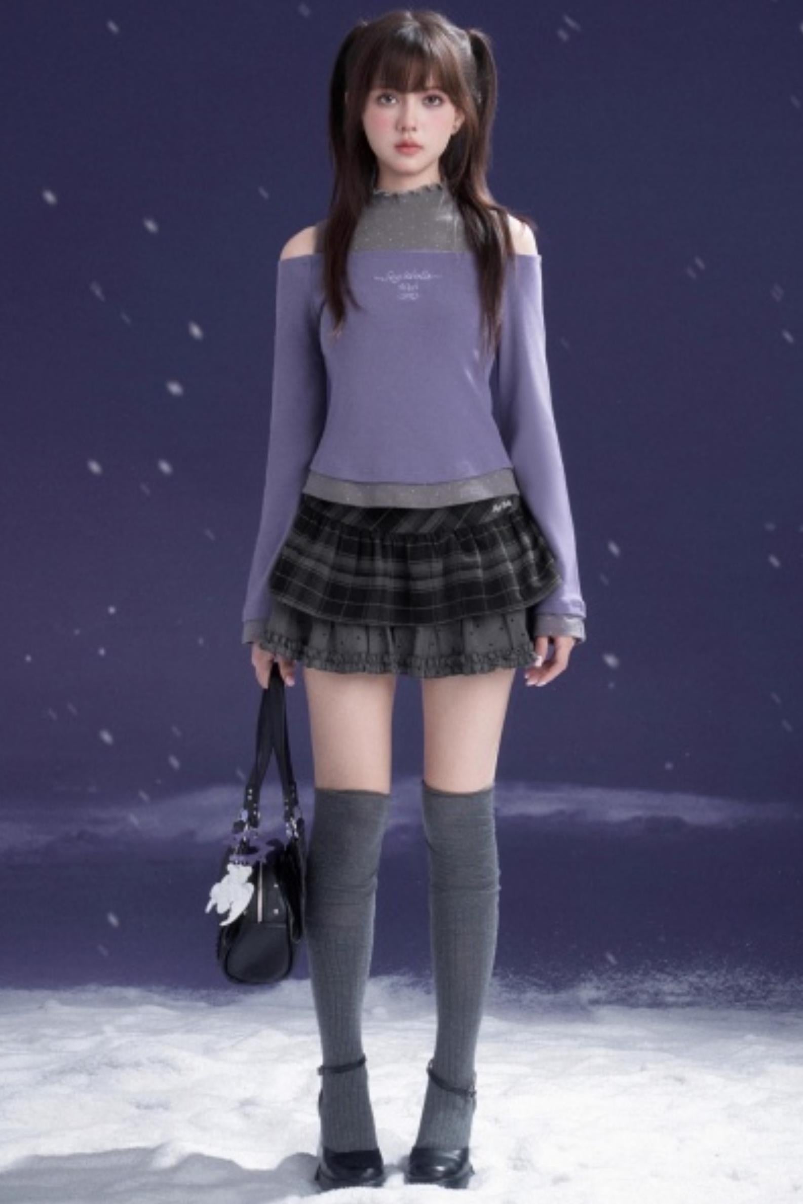Gray-Purple Bowknot Off-Shoulder Top