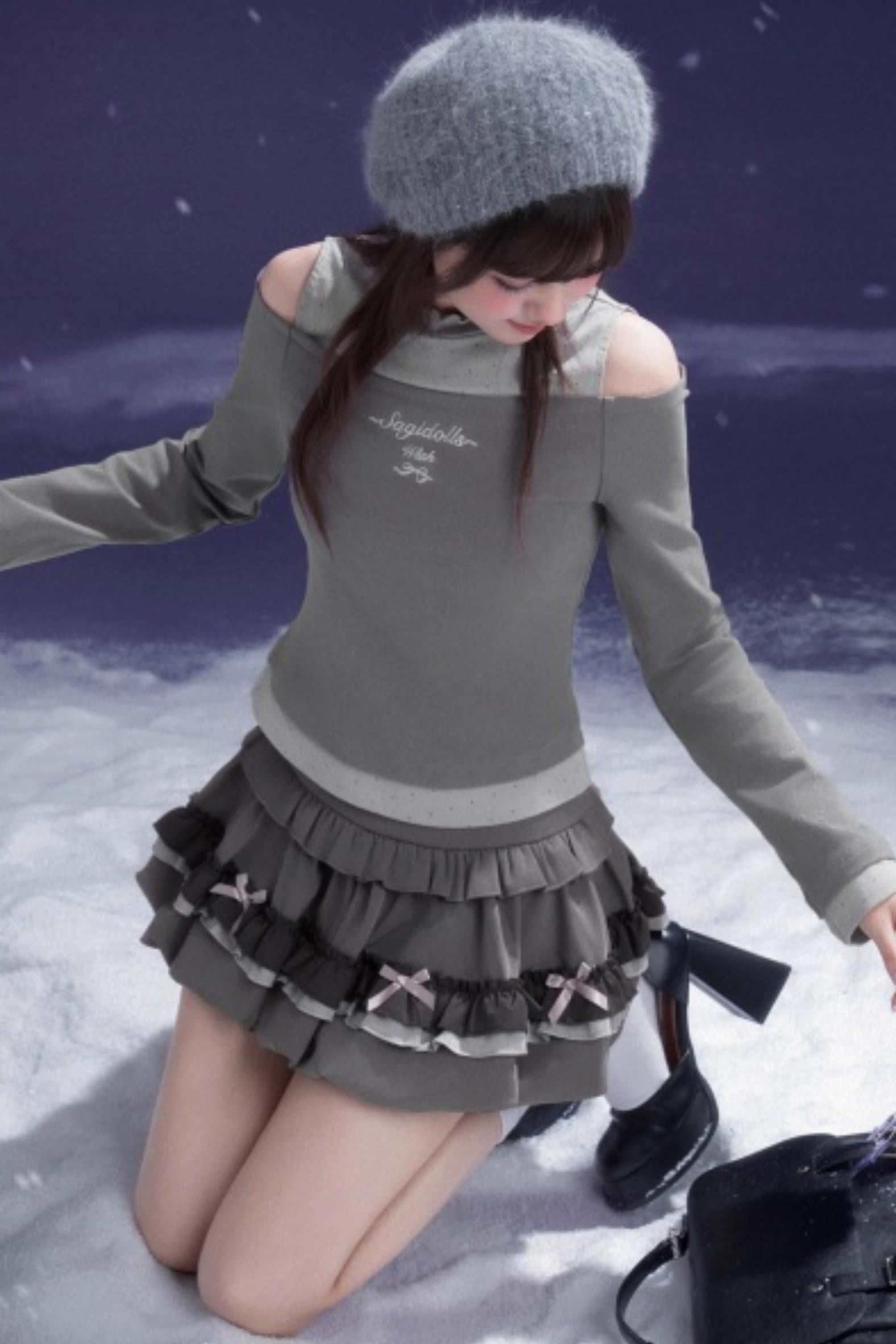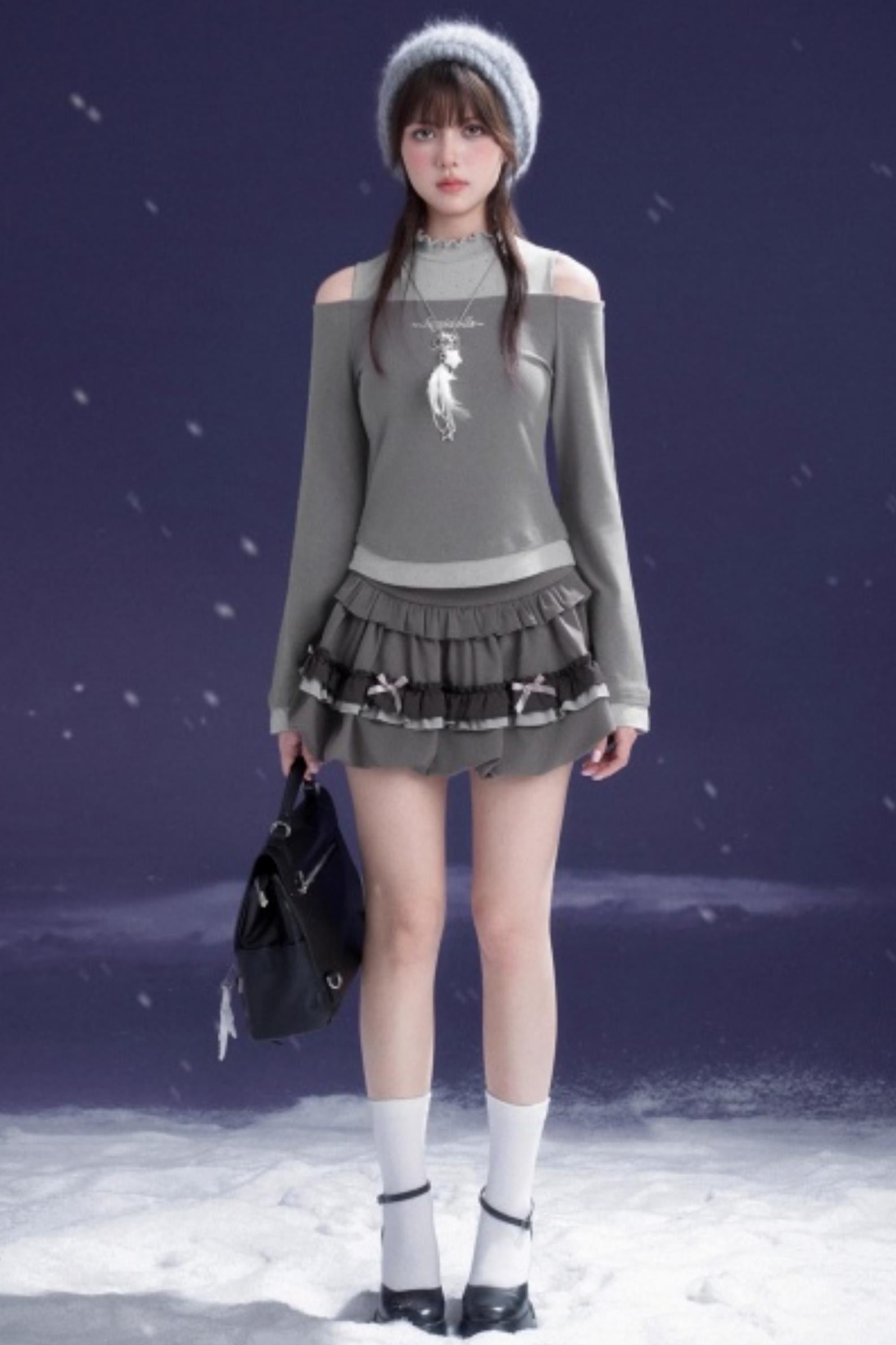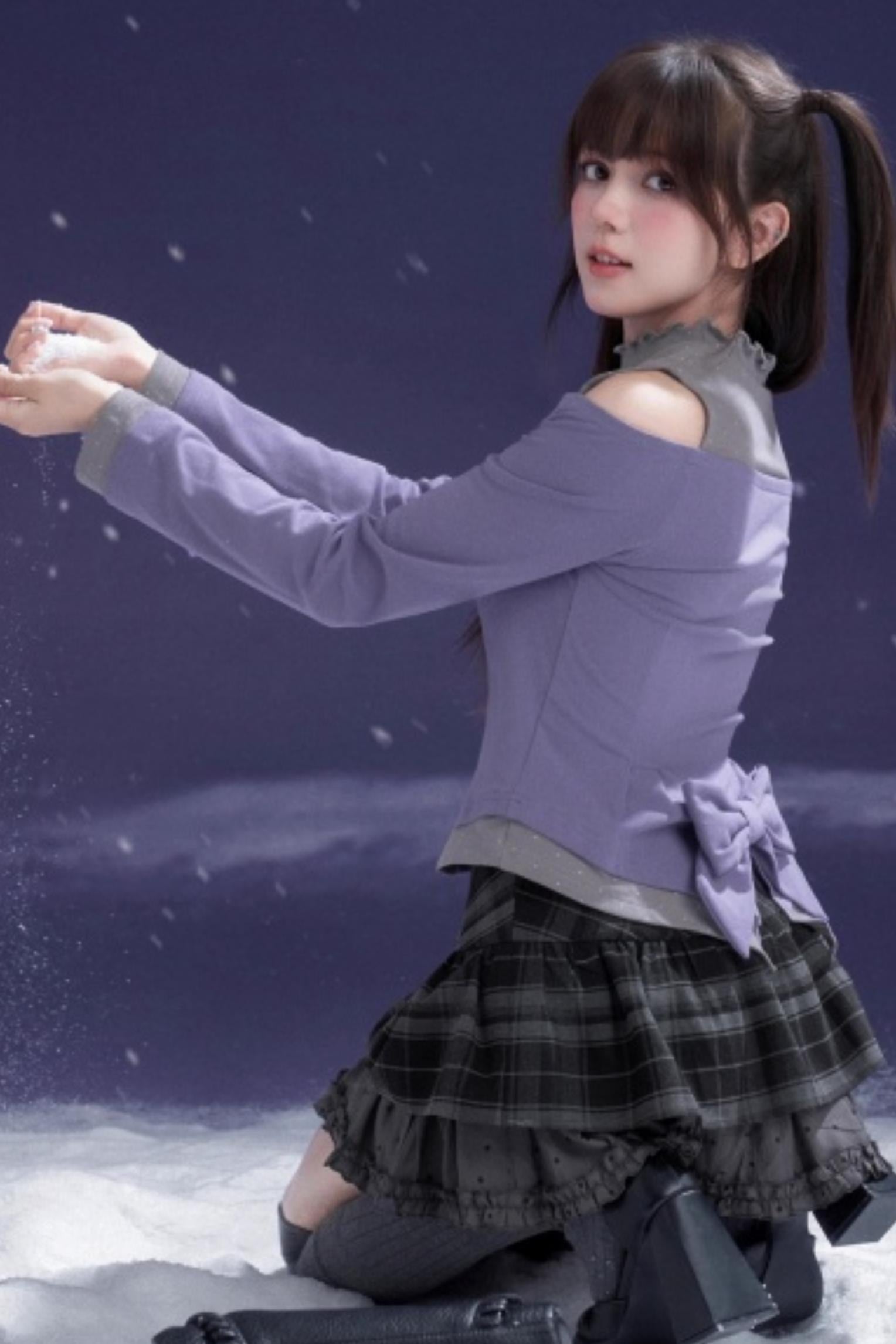 Gray-Purple Bowknot Off-Shoulder Top