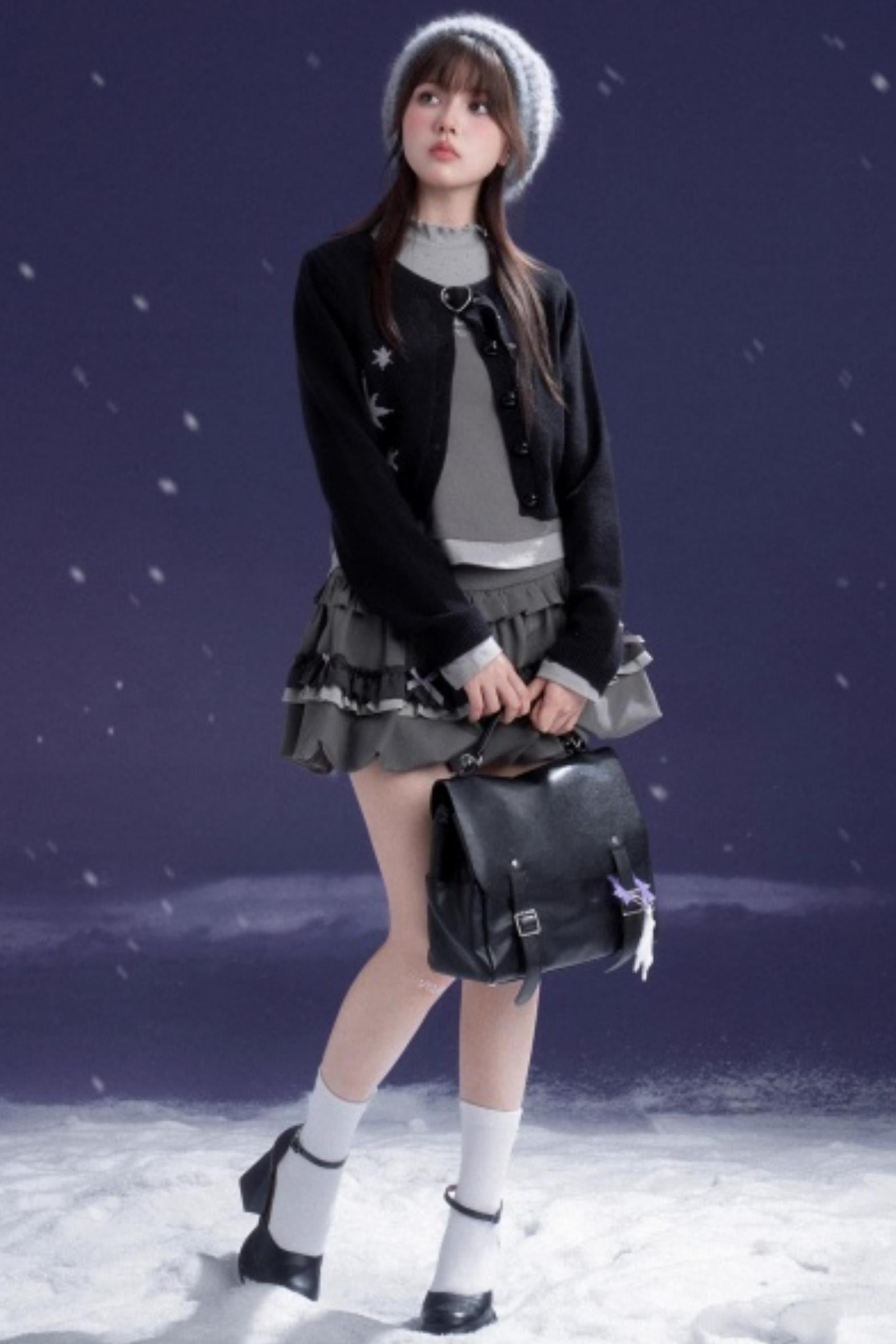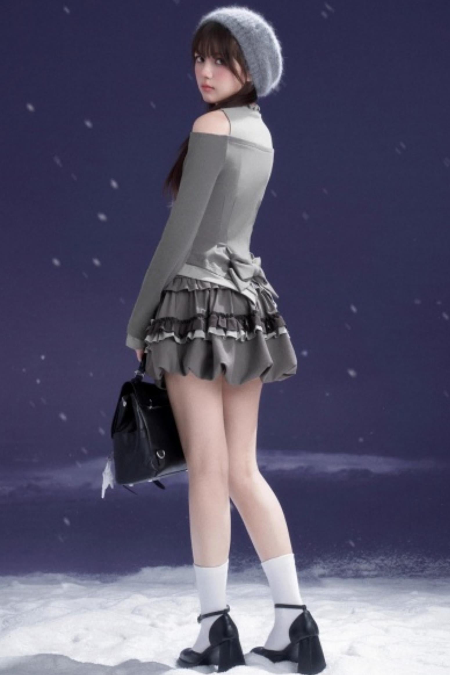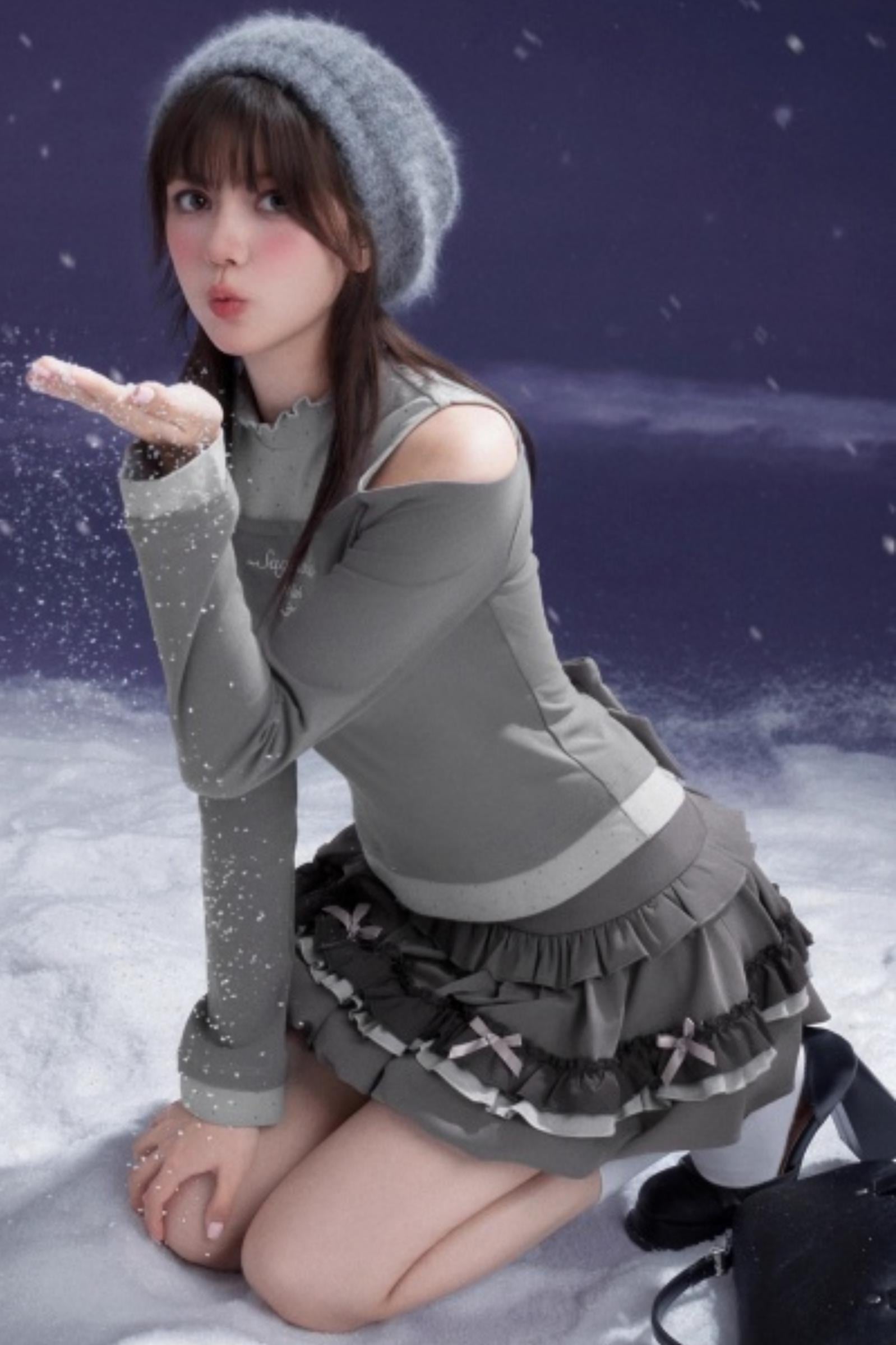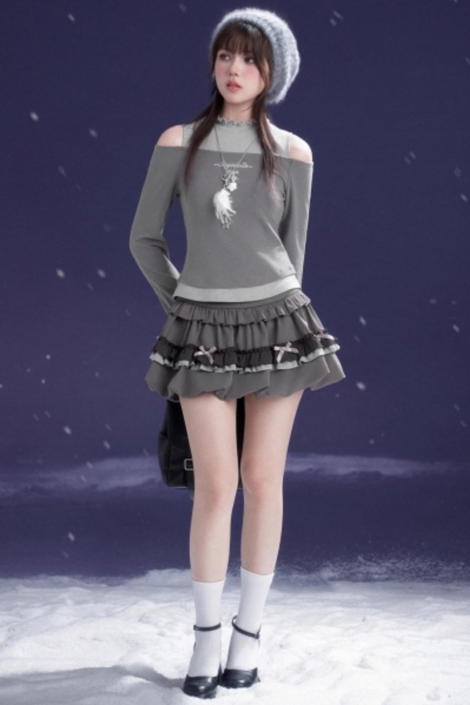 Gray-Purple Bowknot Off-Shoulder Top