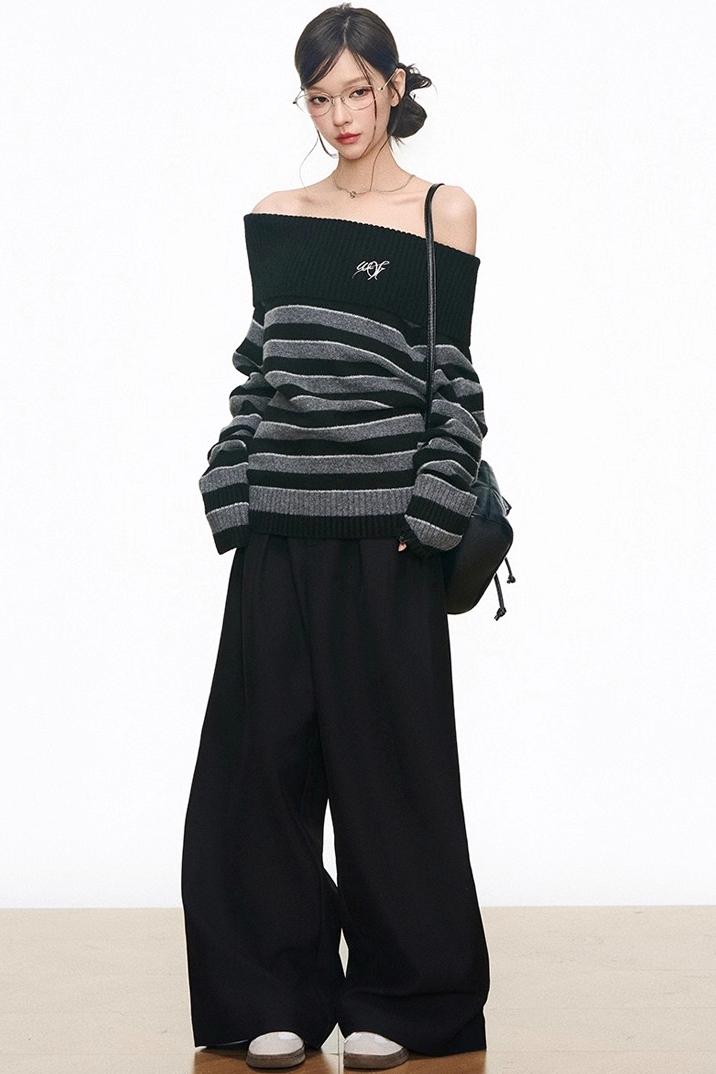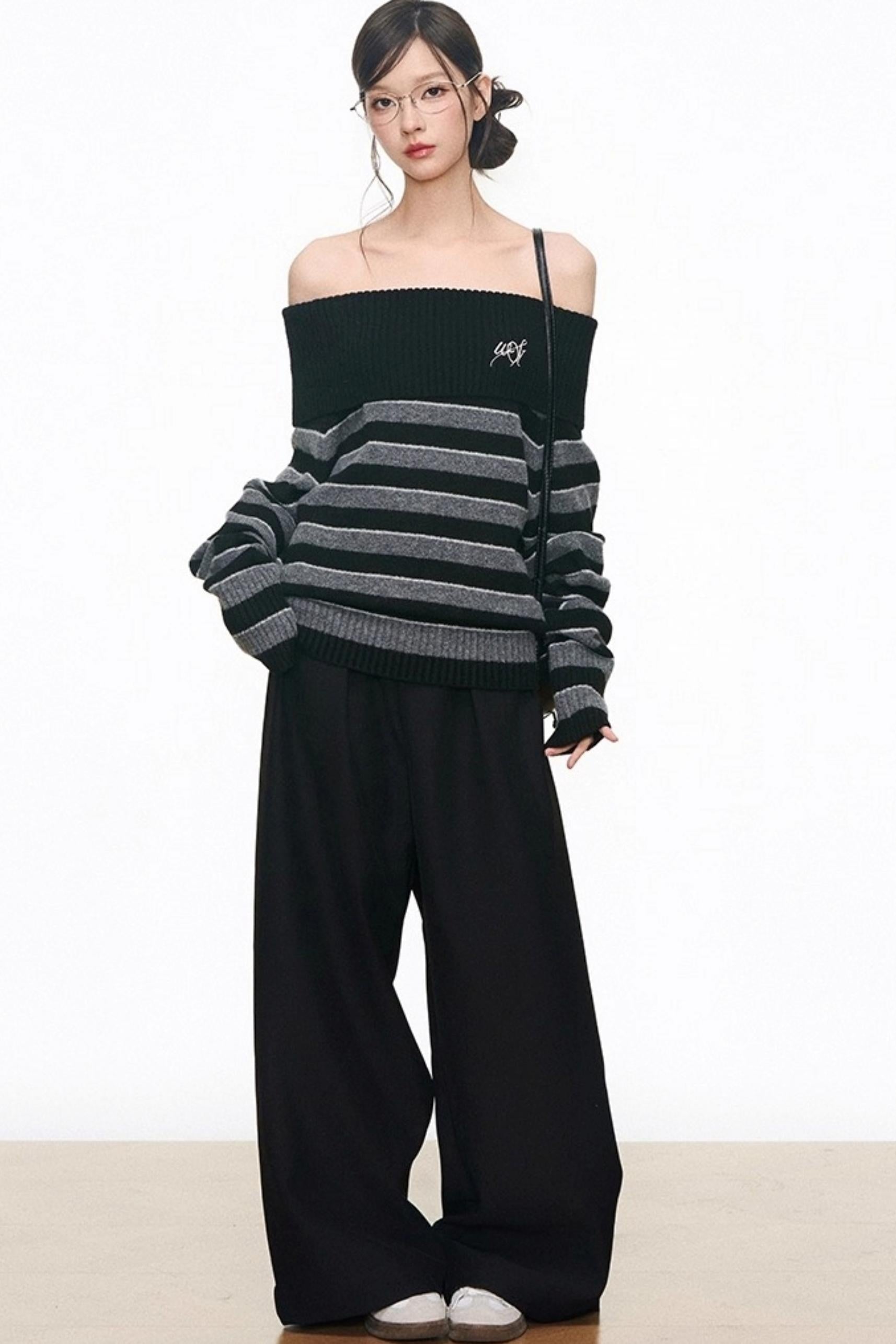 Lazy Striped One-Shoulder Sweater & Wide-Leg Pants Set-Up