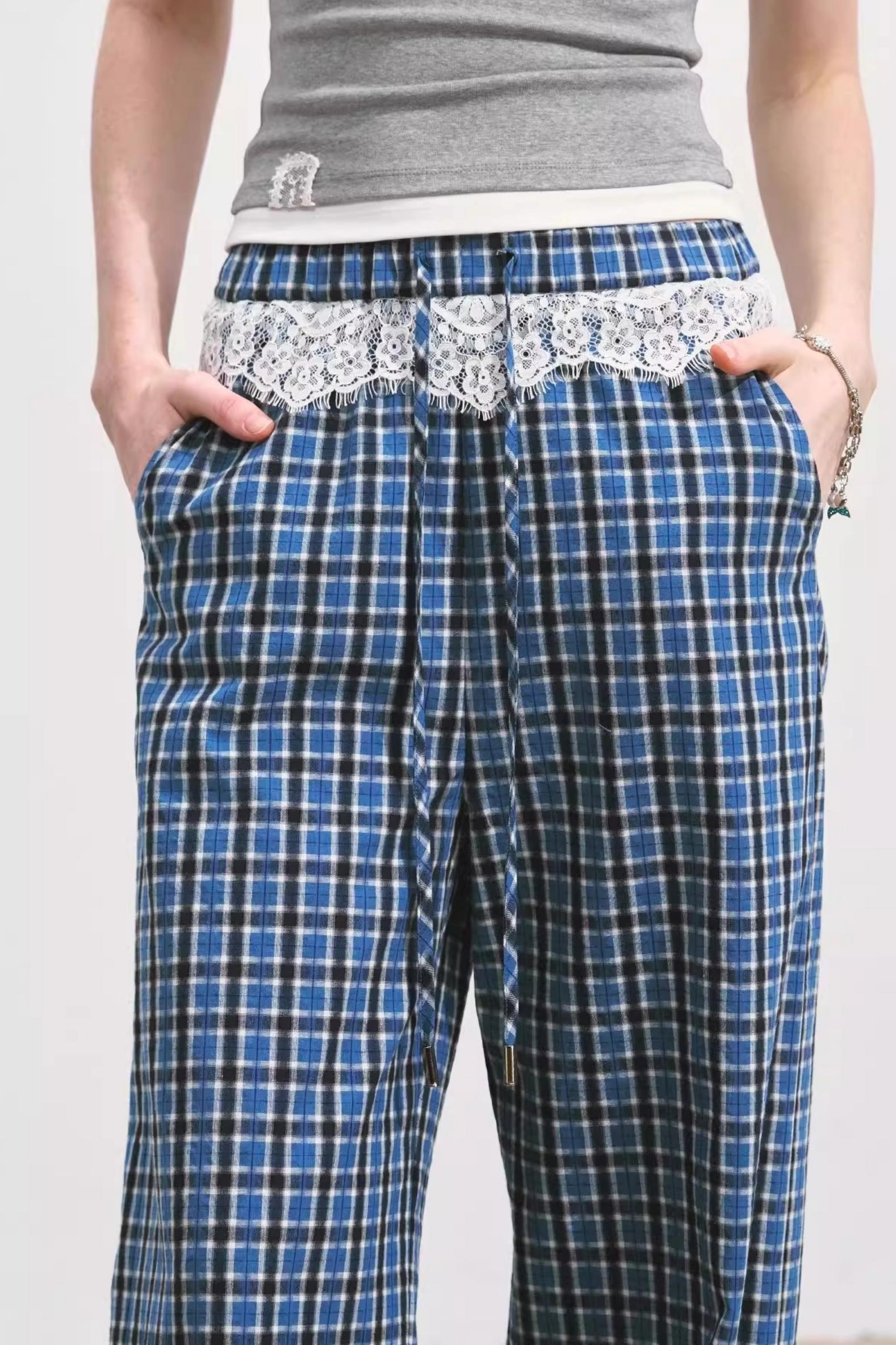 Blue Lace-Trimmed Plaid Wide-Leg Pants