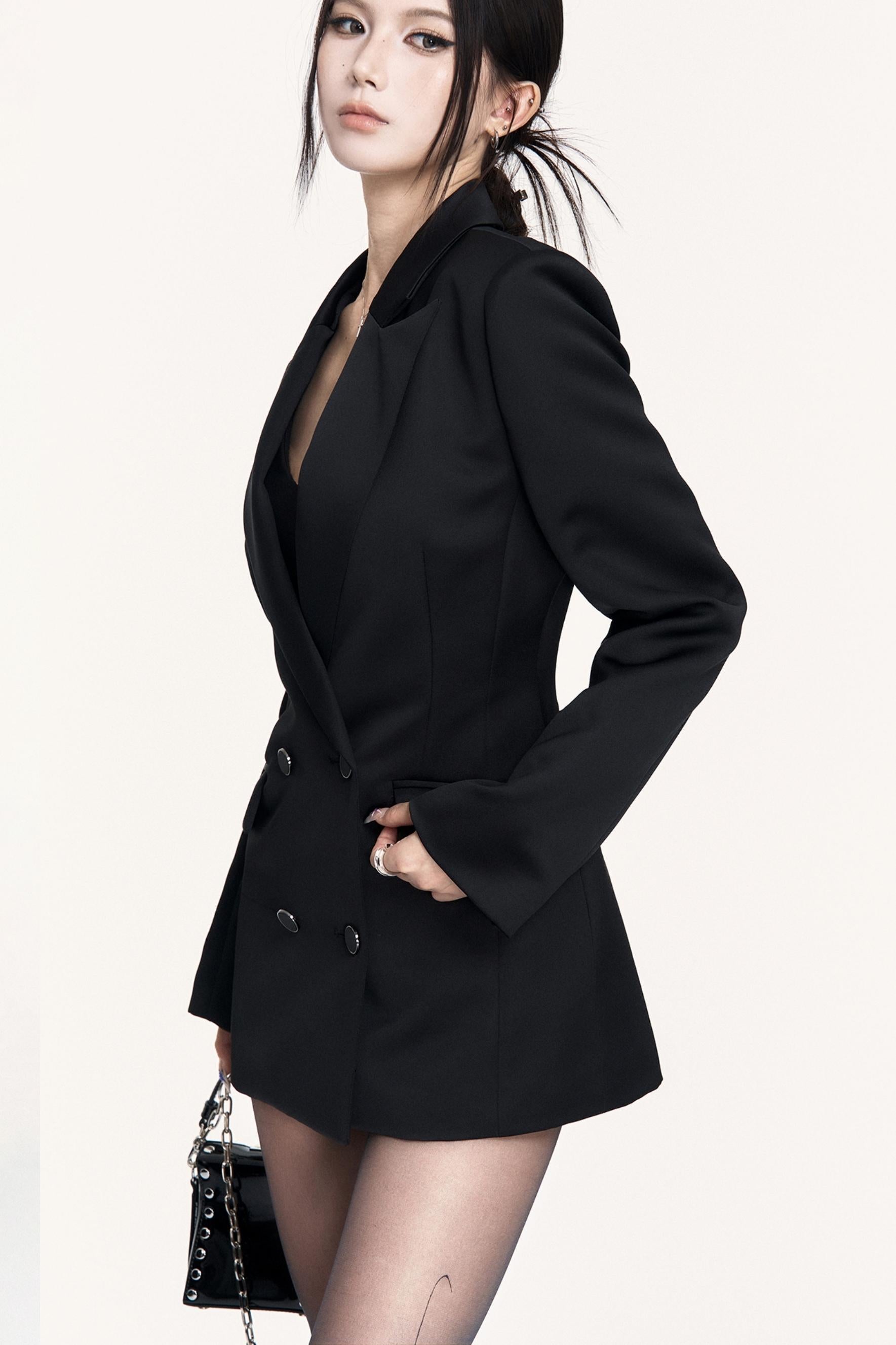 Fashionable Hourglass Slim Waist Black Satin Blazer