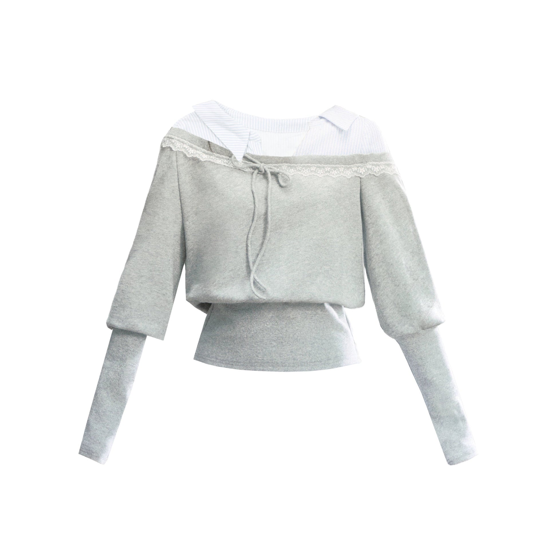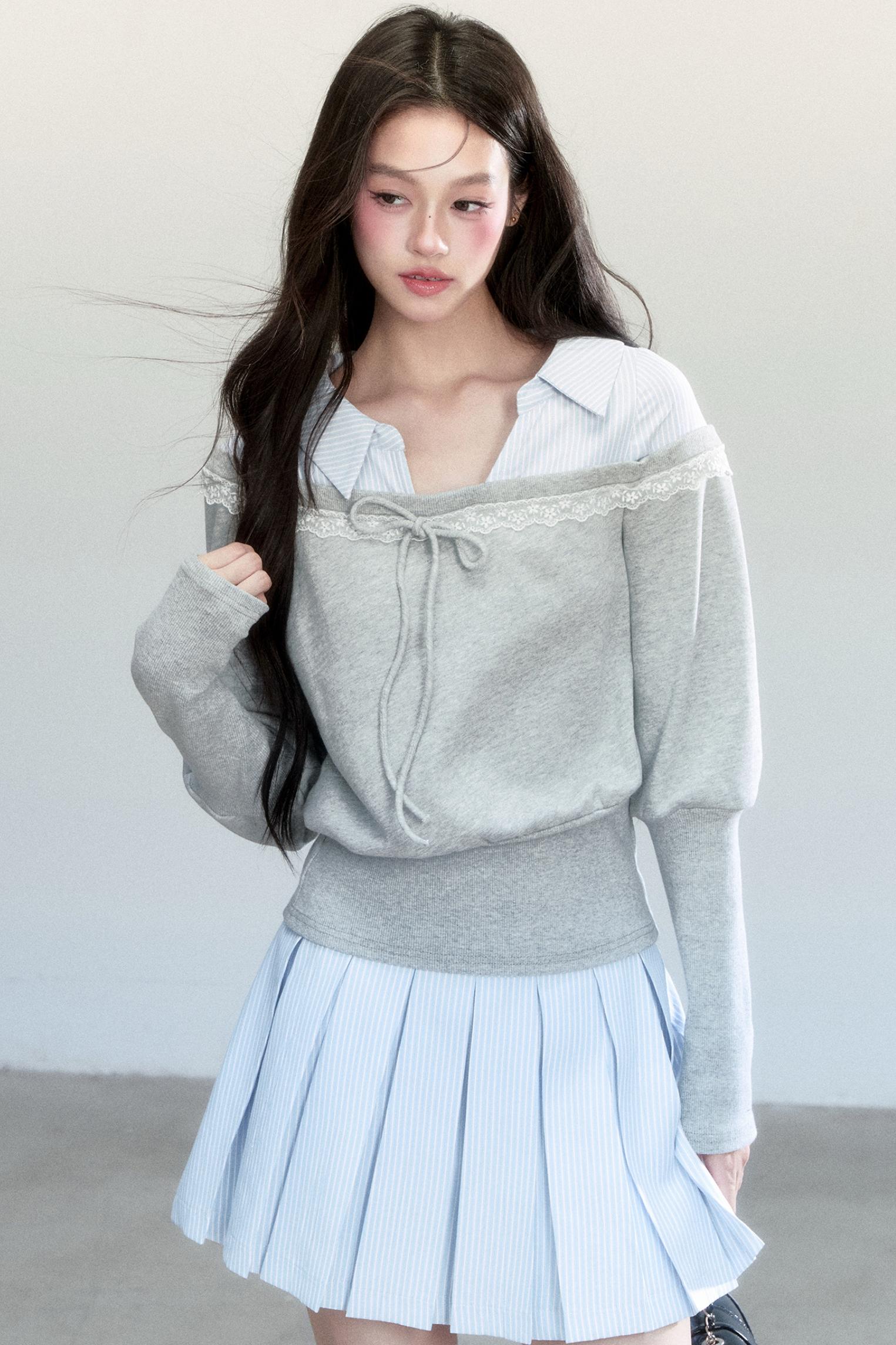 Korean Patchwork Striped Pleated Skirt Set-Up