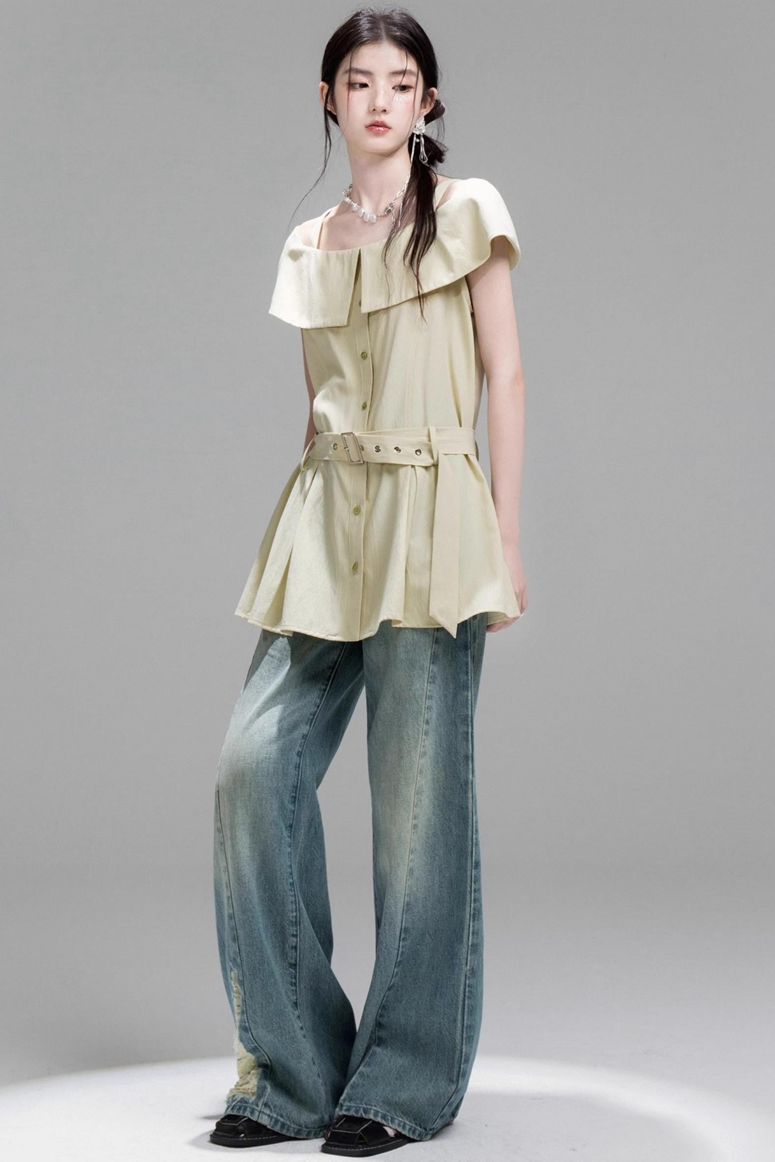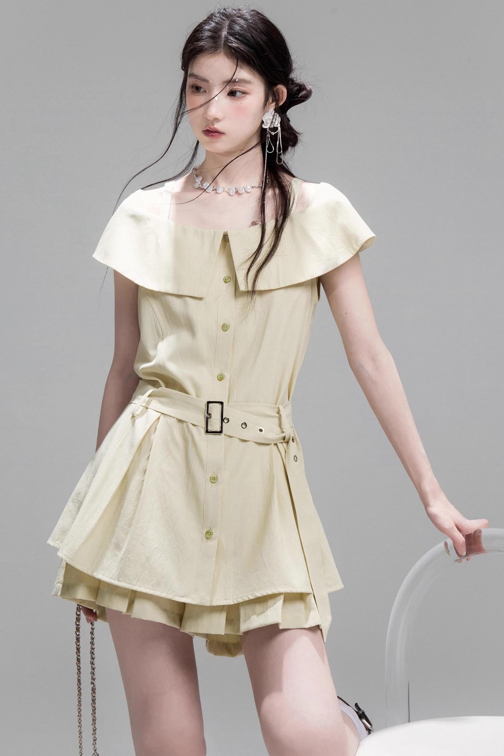 Layered Lime Green Belted Shirt & Pleated Shorts Set