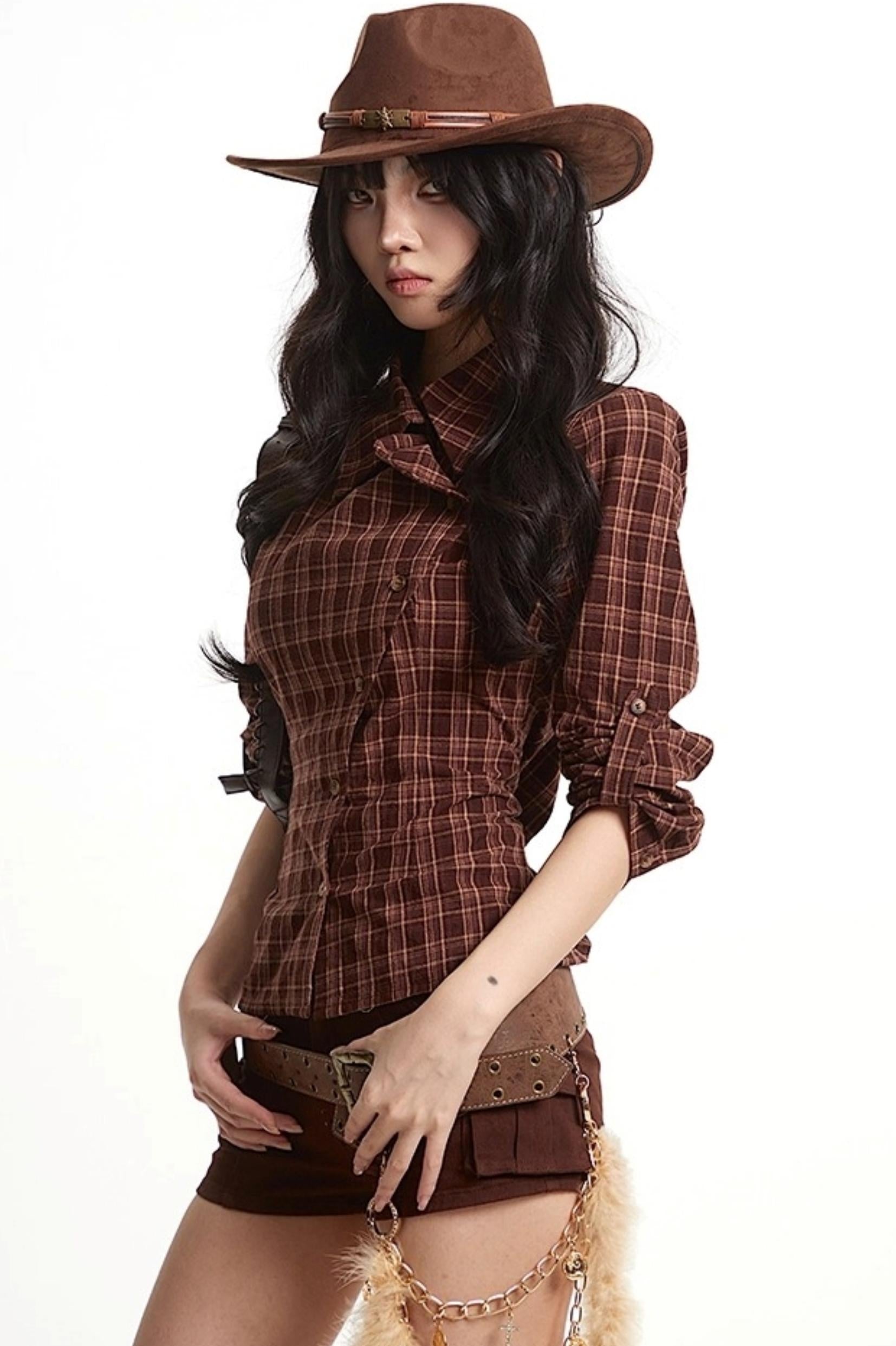 Loose Fit Waist-Tightening Plaid Shirt