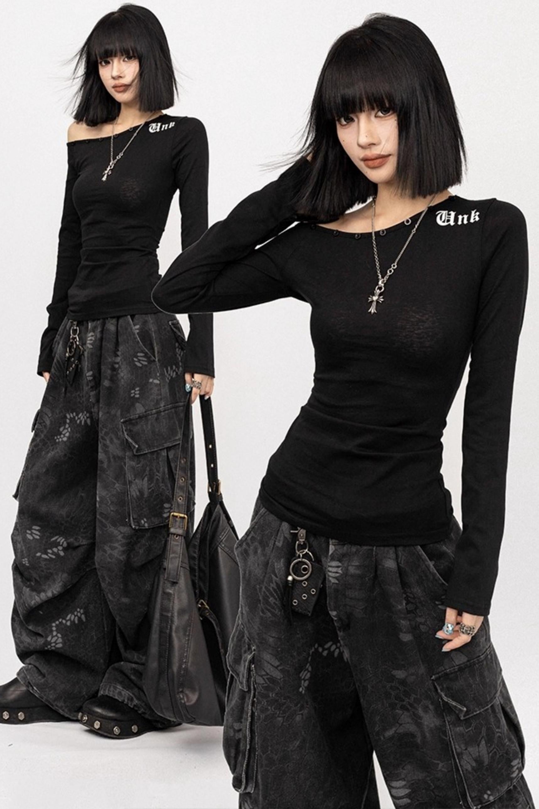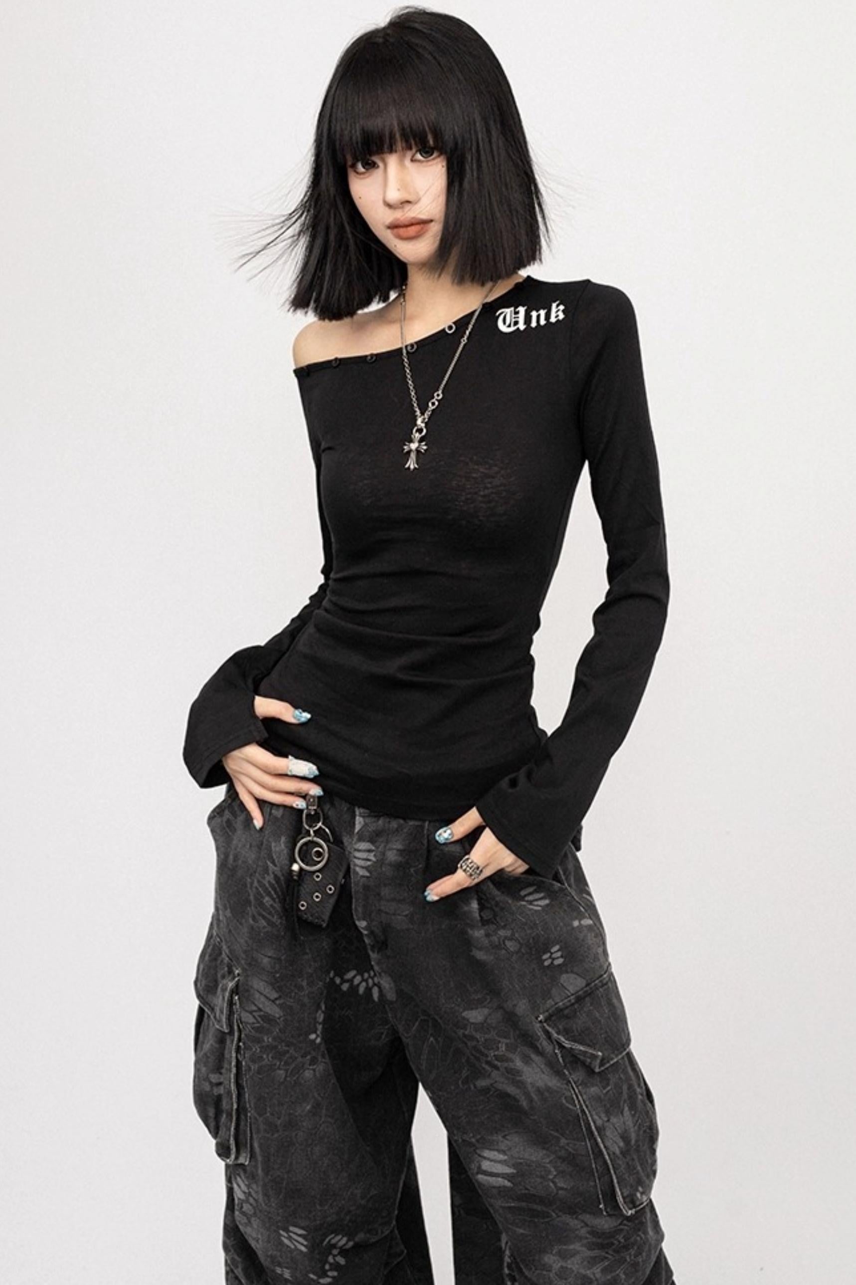 Autumn Retro Black Slanted Shoulder Long Sleeve Slim Top