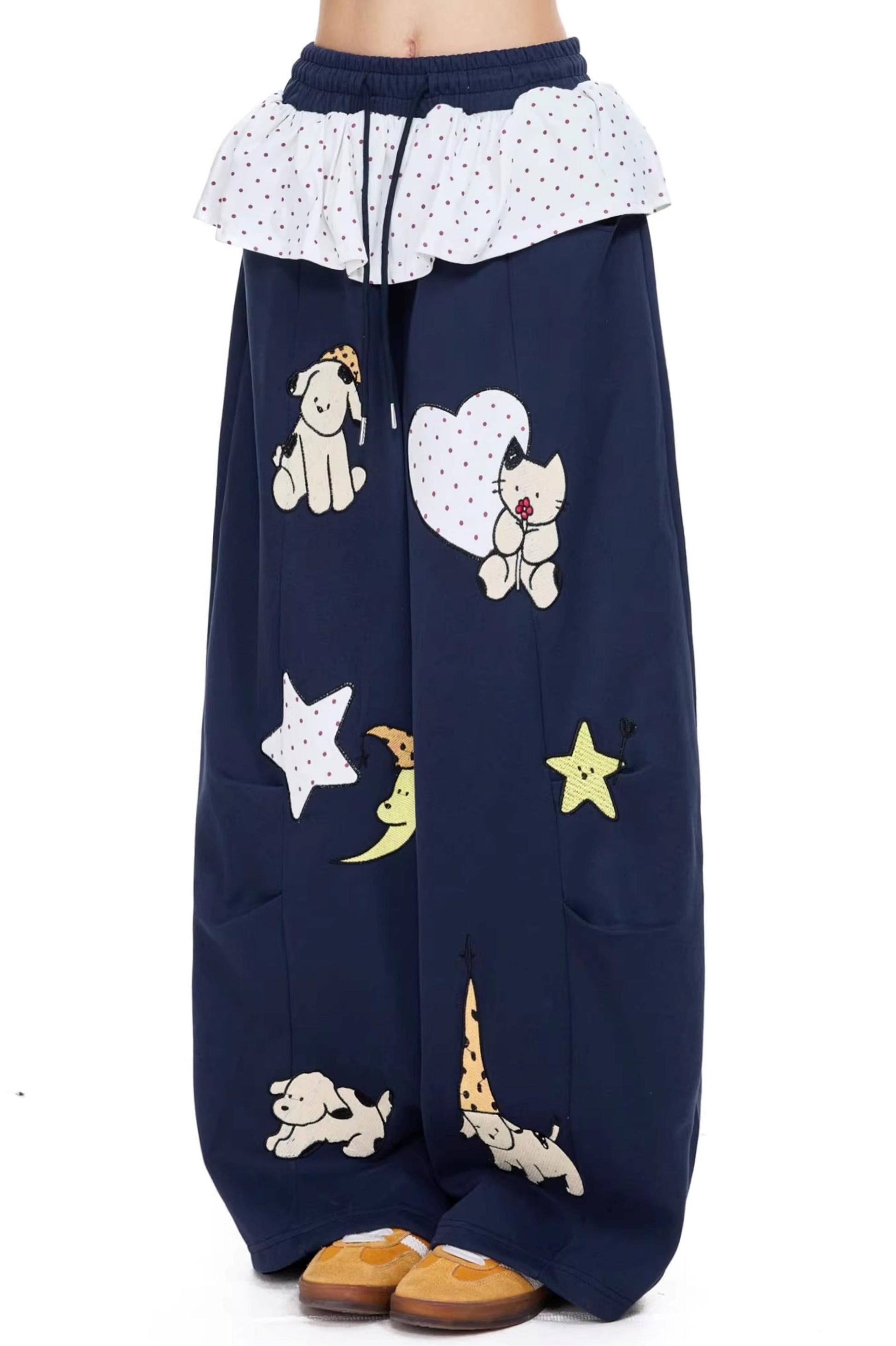 만화 자수 와이드 레그 팬츠