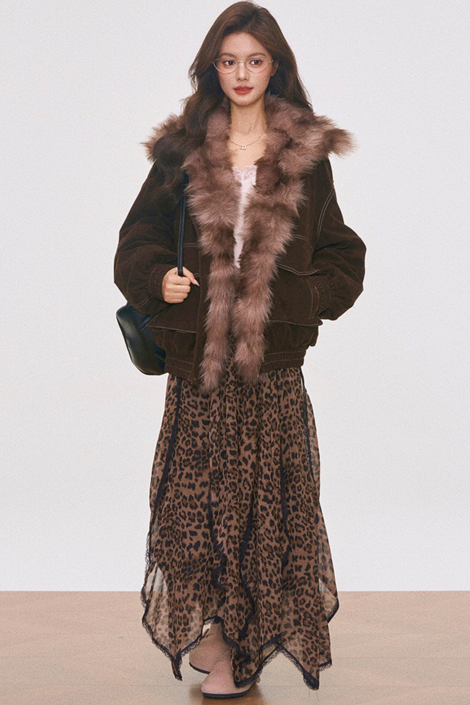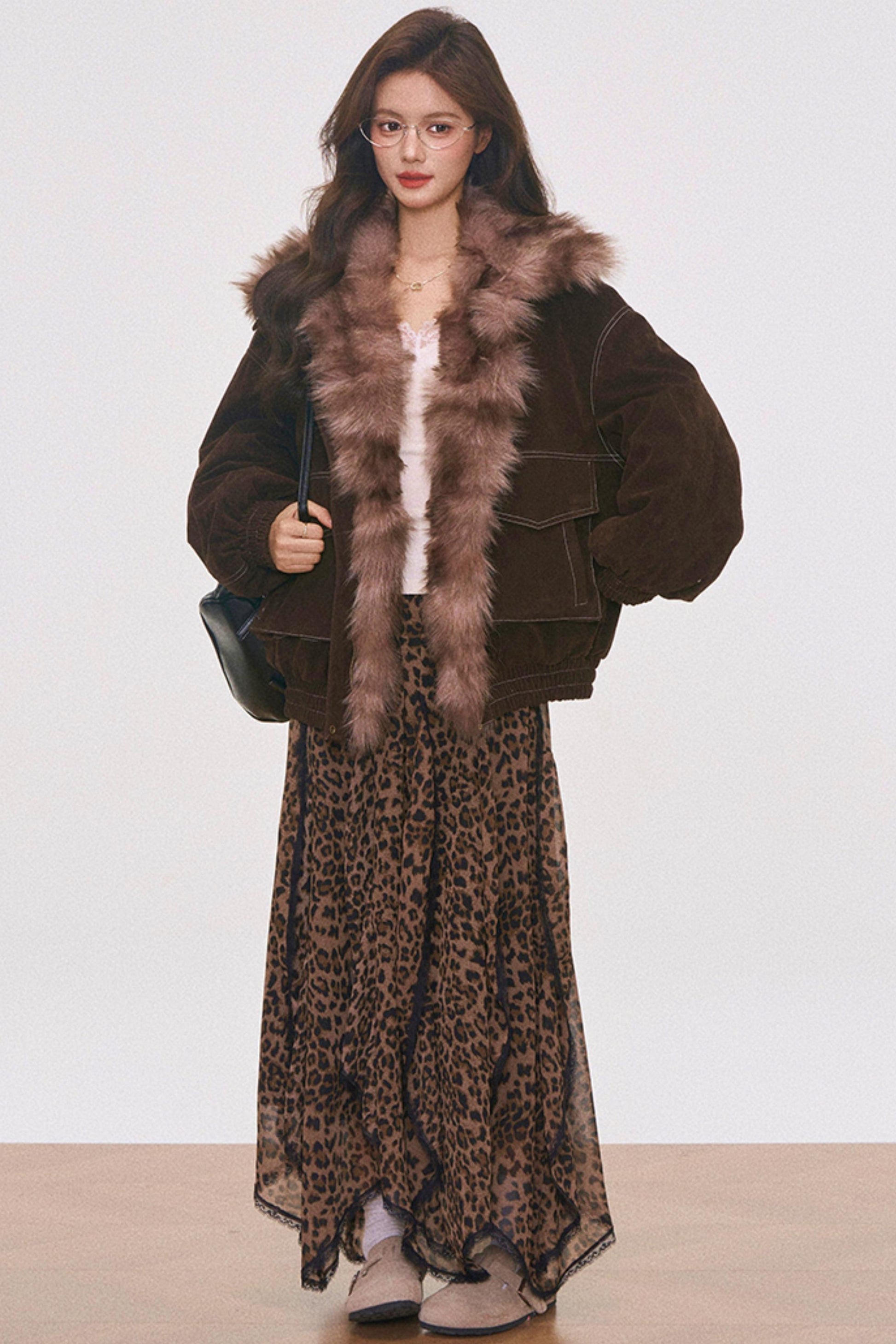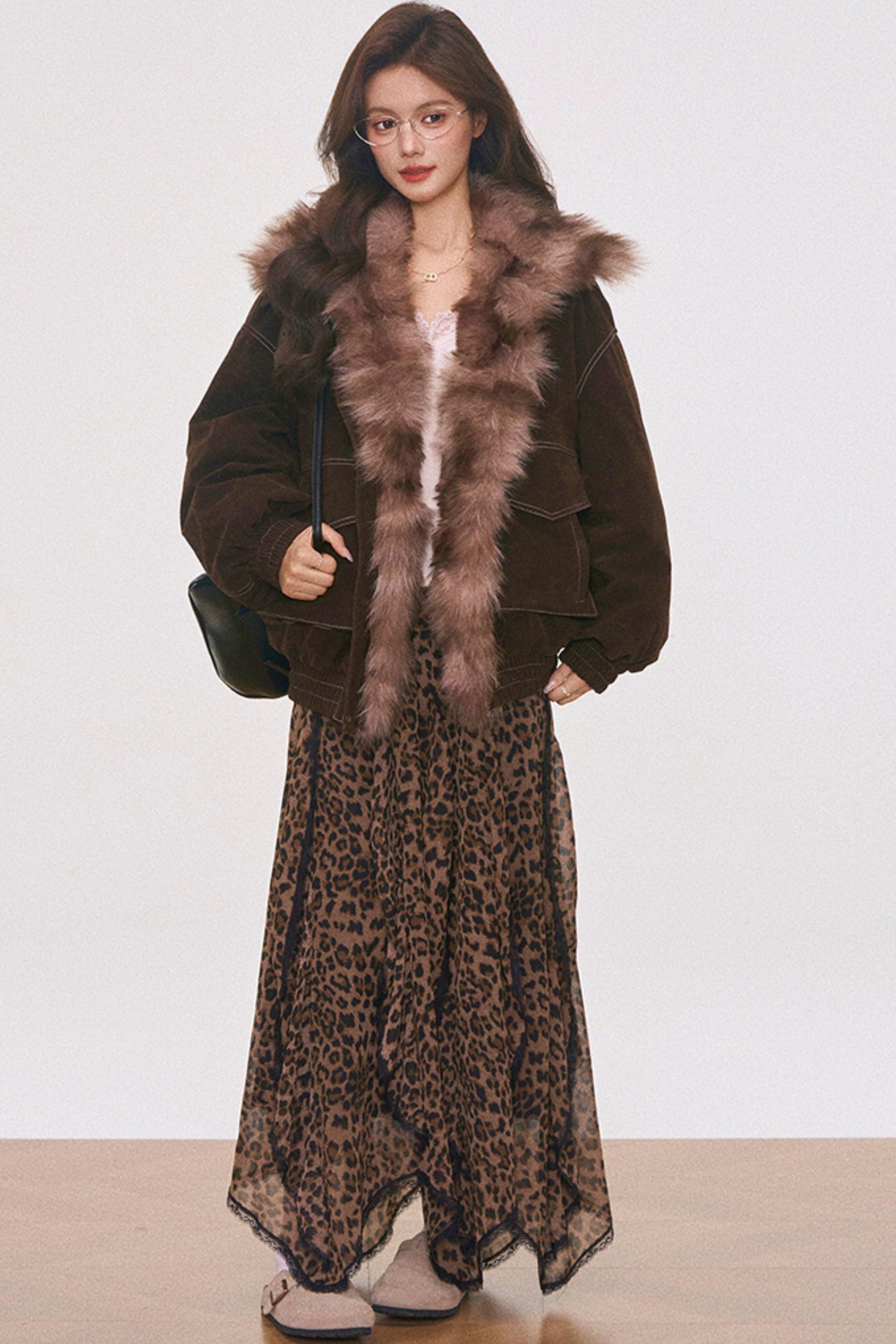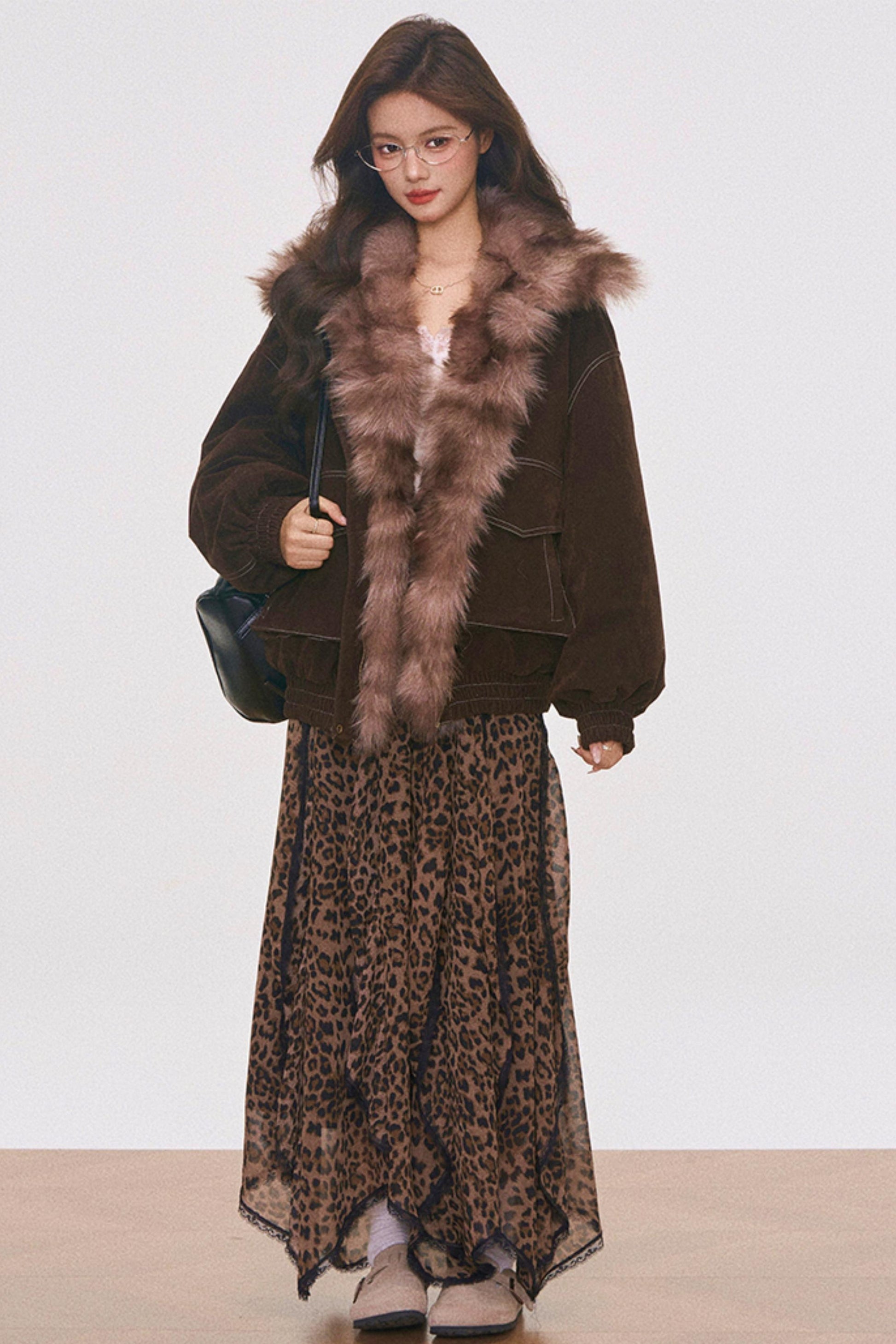 Brown Suede Fur Jacket and Leopard Skirt Set-Up