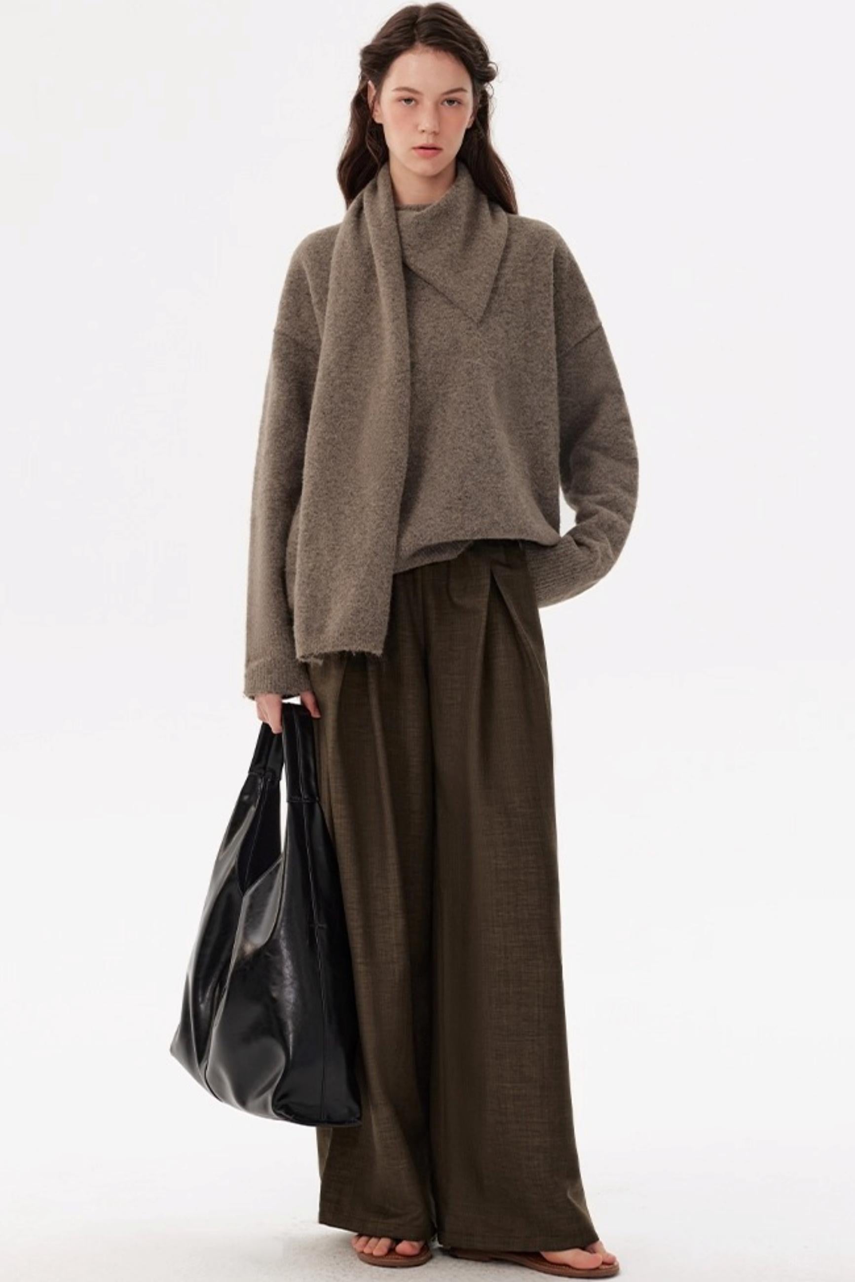 Coffee Elastic Waist Pleats Wide-Leg Suit Pants
