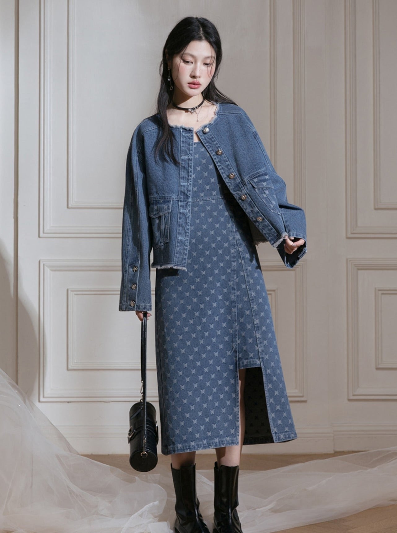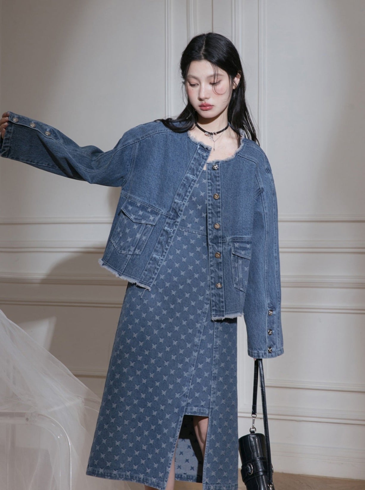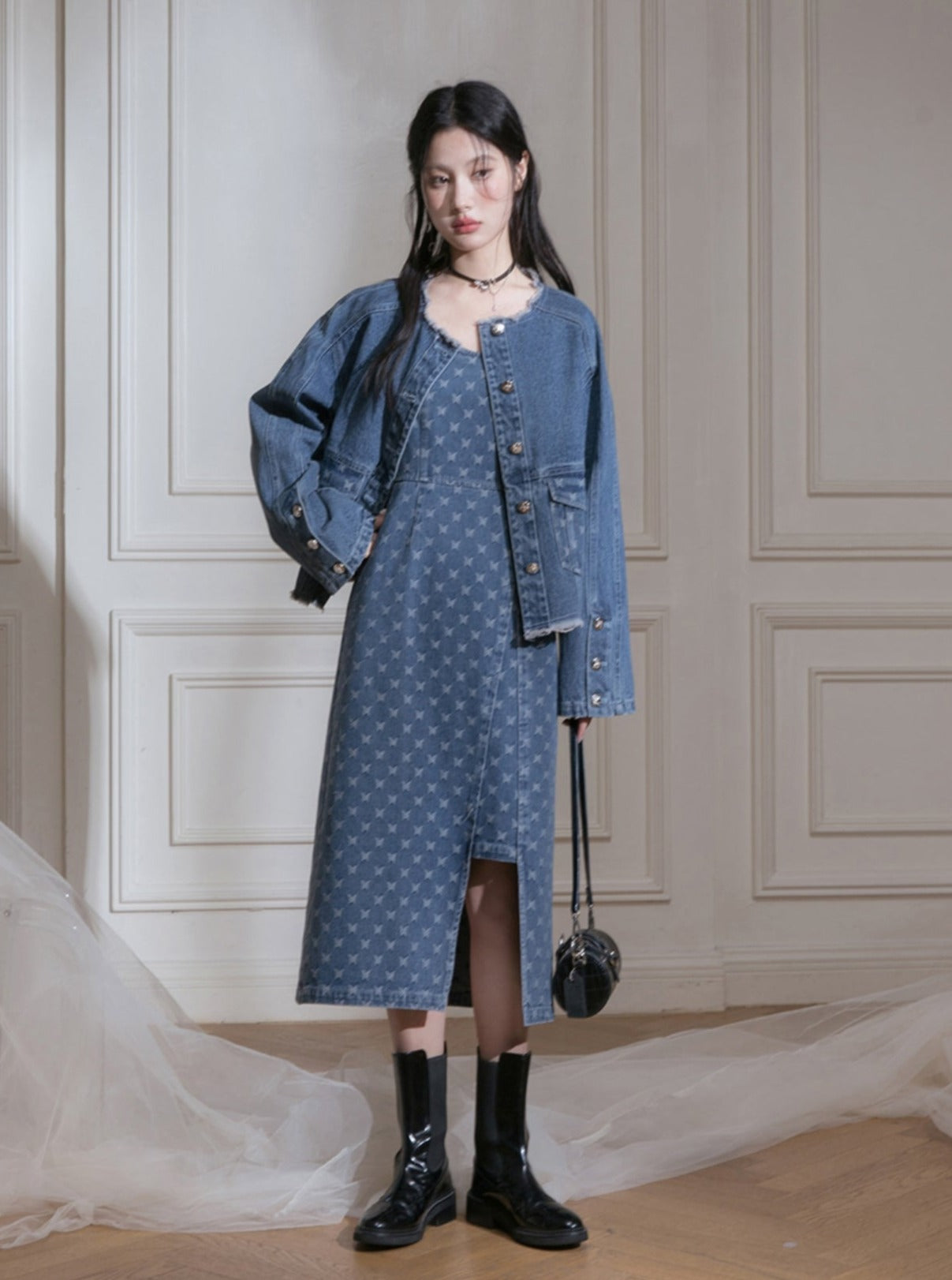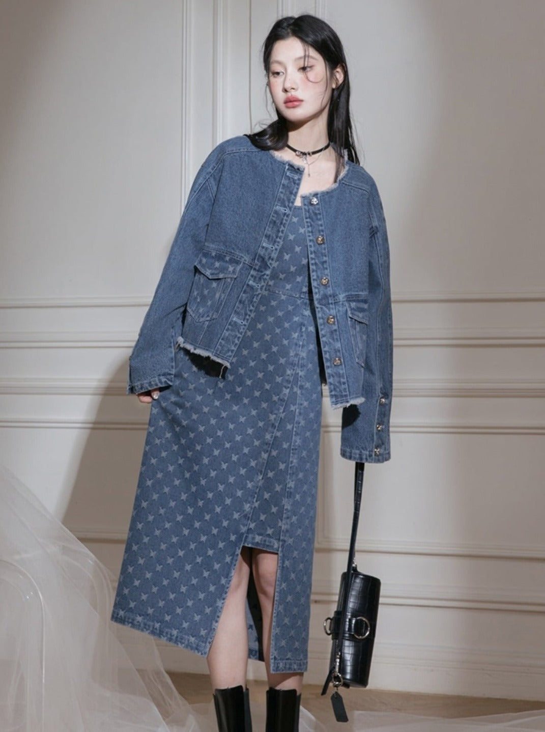 Edged Jacquard Denim Jacket Sundress Set