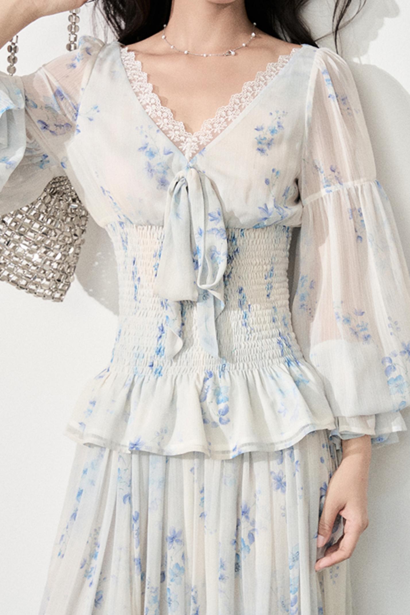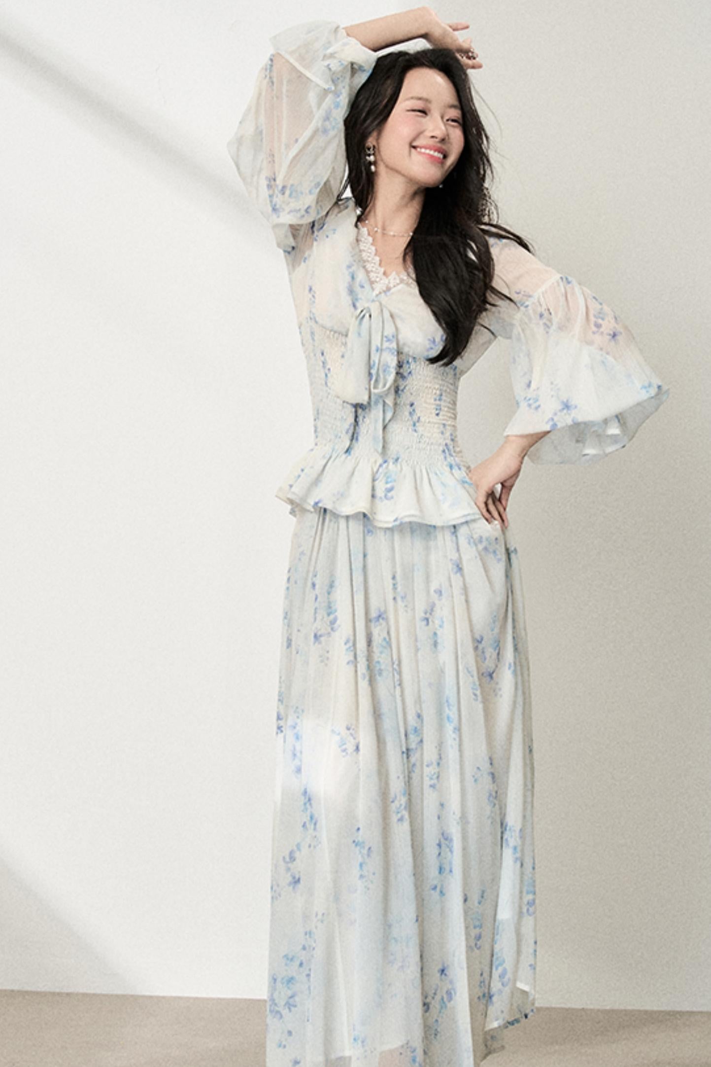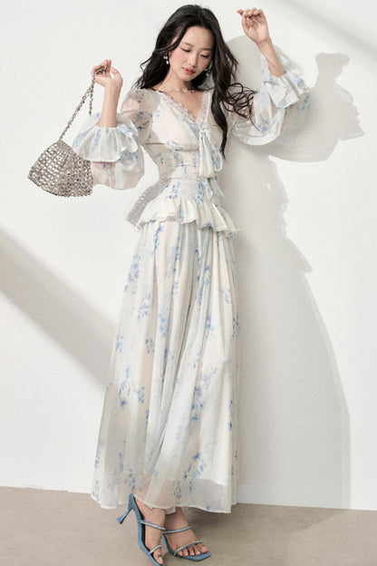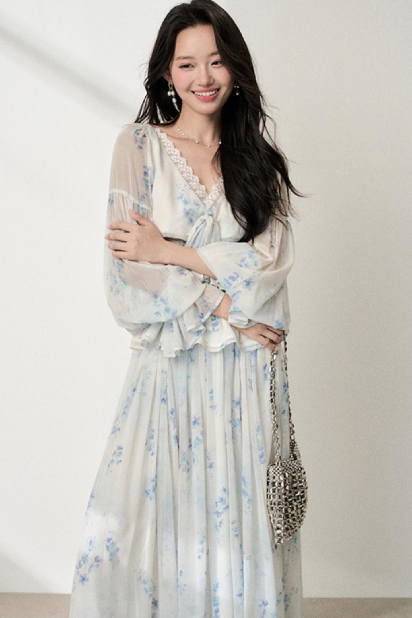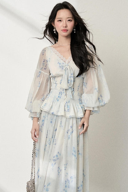 Floral V-Neck Shirt Skirt Set-Up
