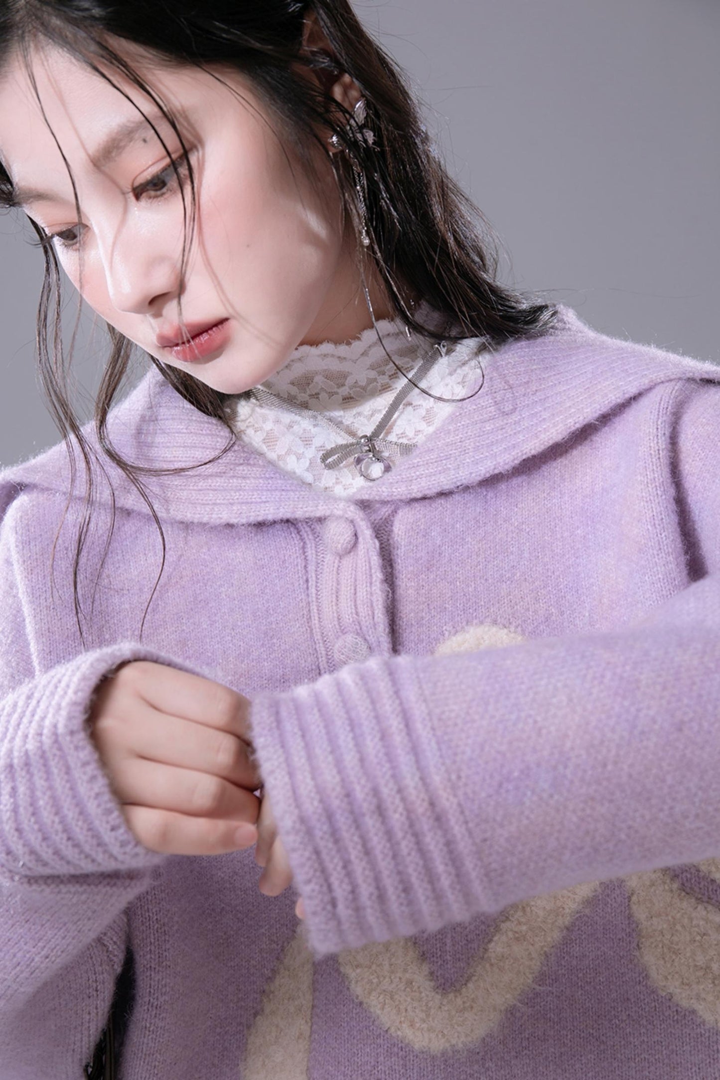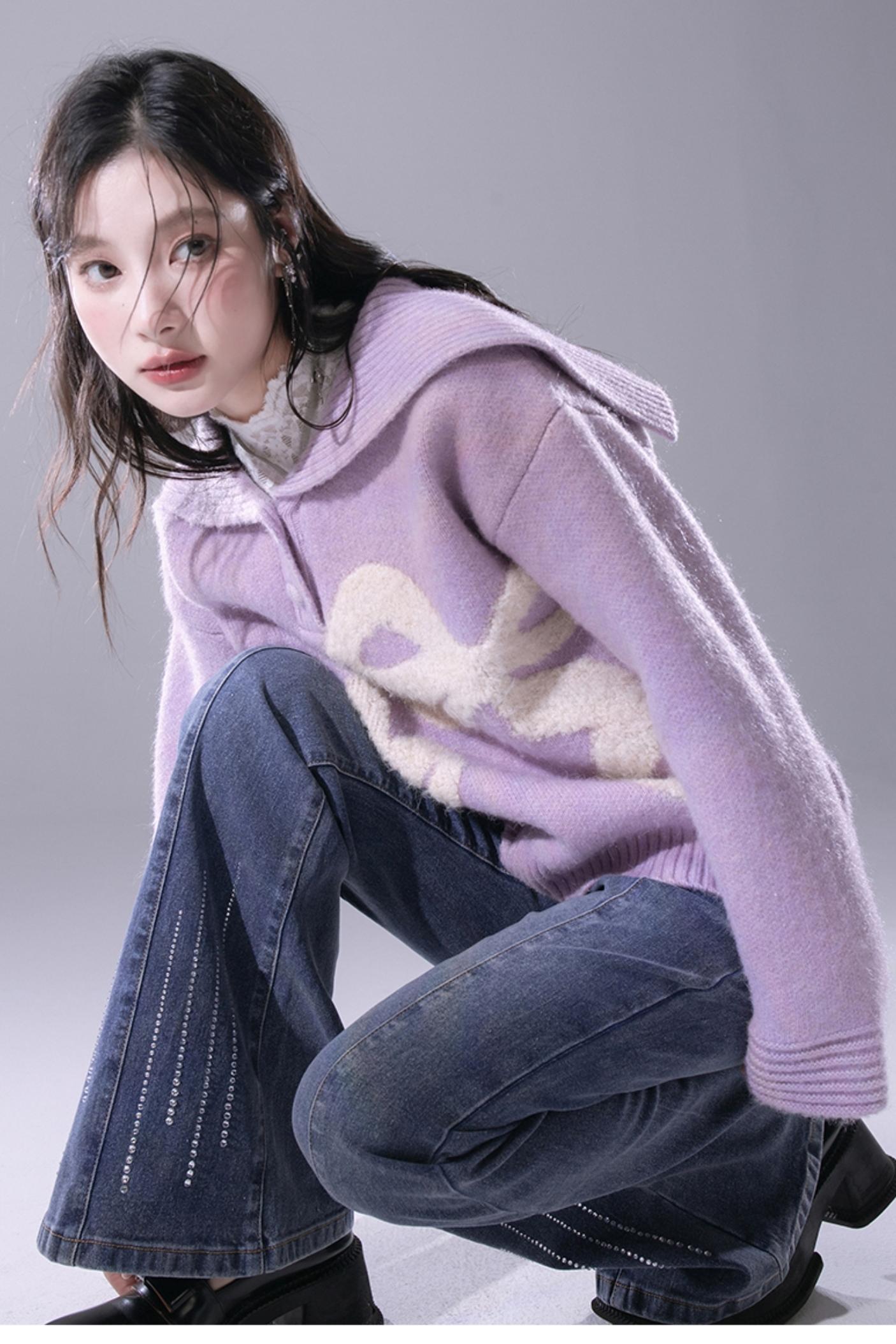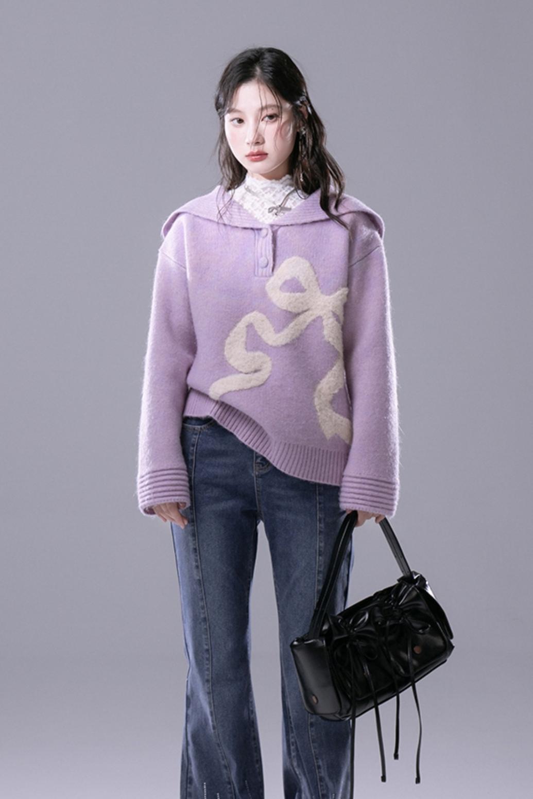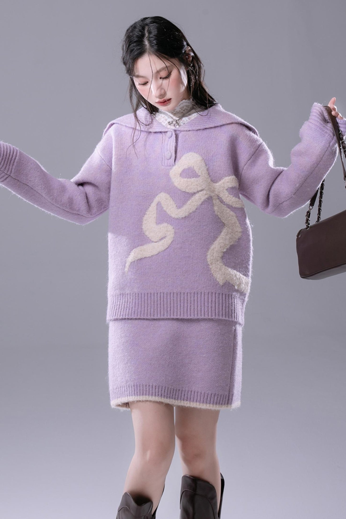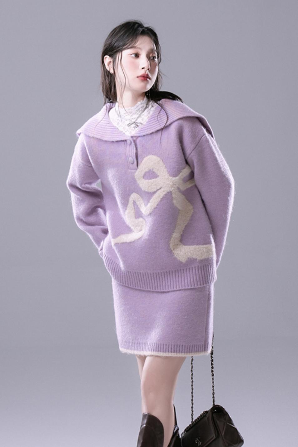 Grape Purple Bow Jacquard Sweater Set