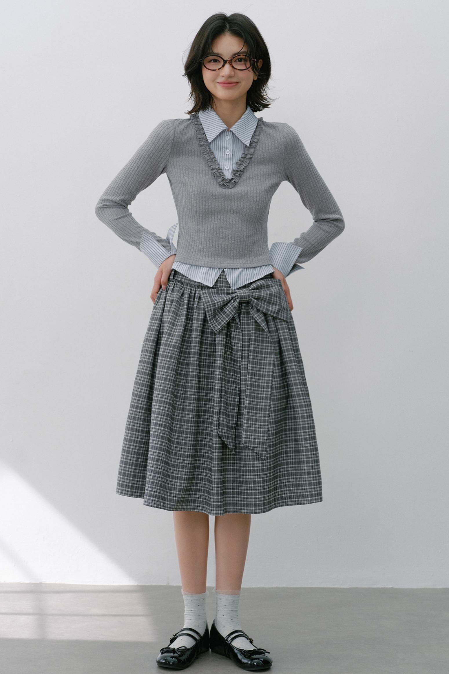 Gray Knit Patchwork Vertical Striped Fungus Edge Top