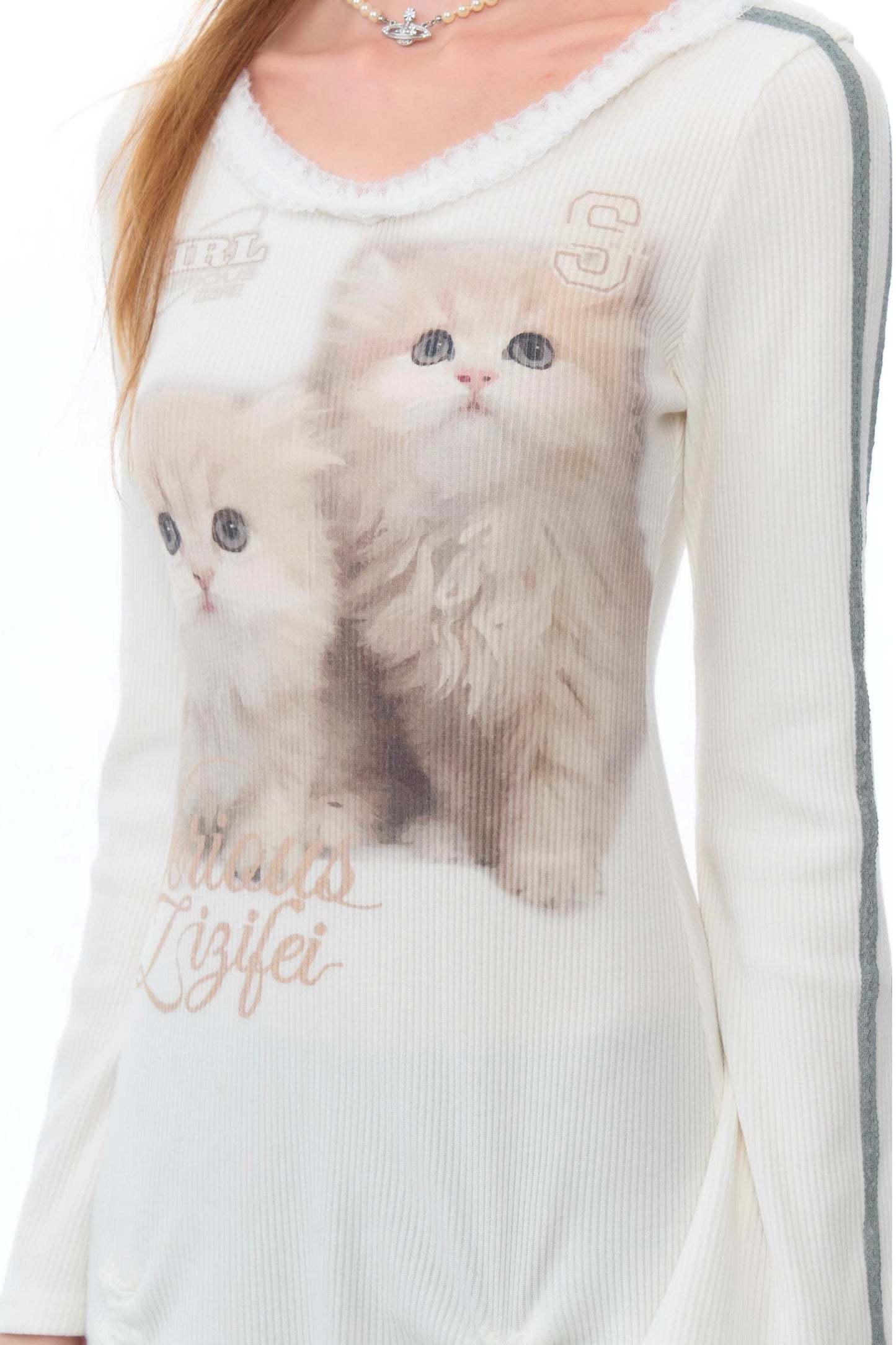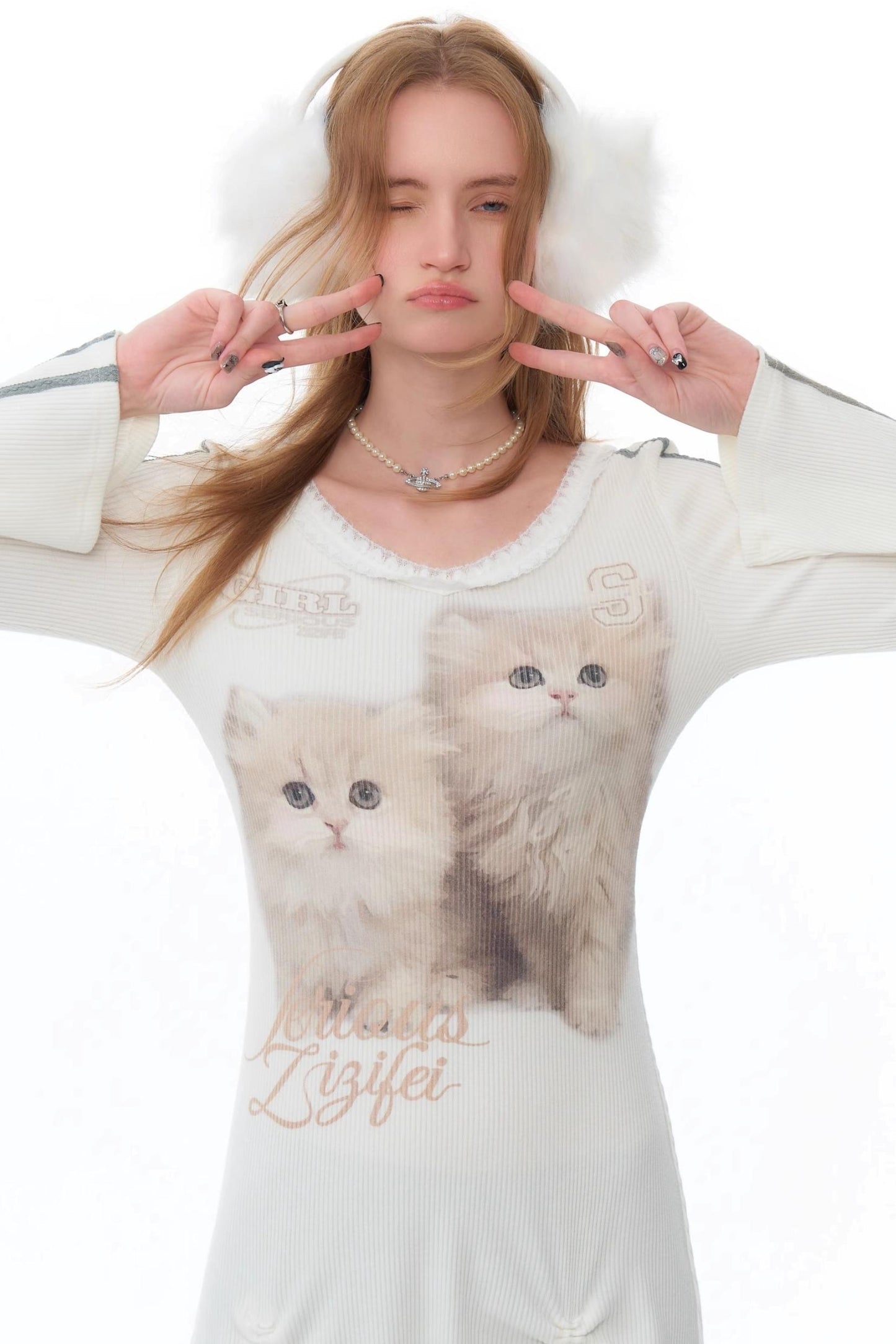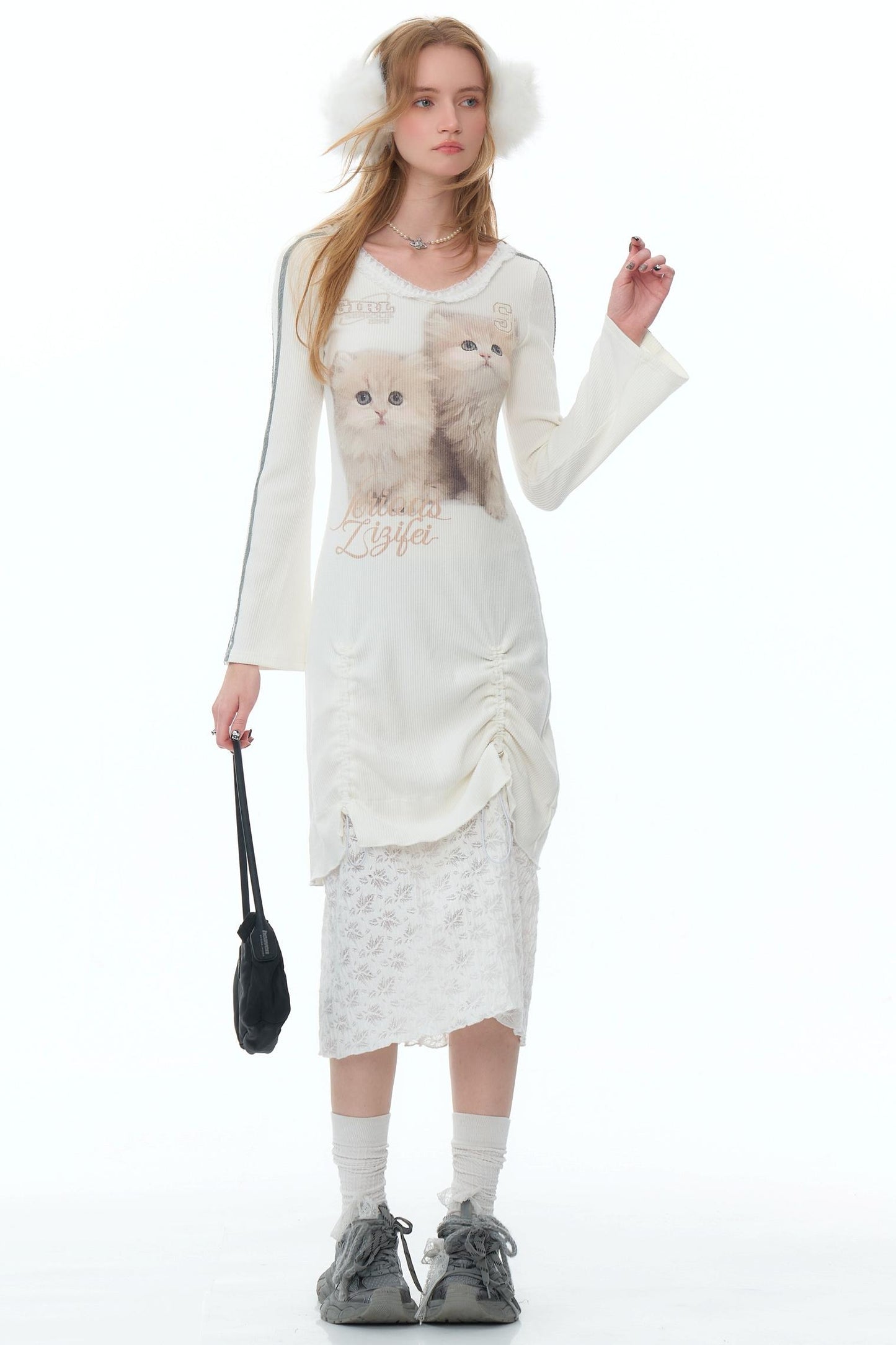 Lace Splicing Cat V-Neck Knitted Dress