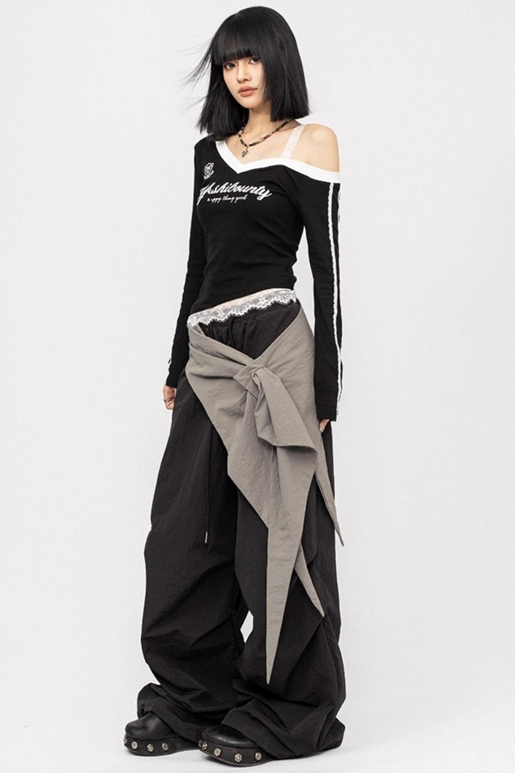 Lace Stitching Off-the-Shoulder Long Sleeve Top