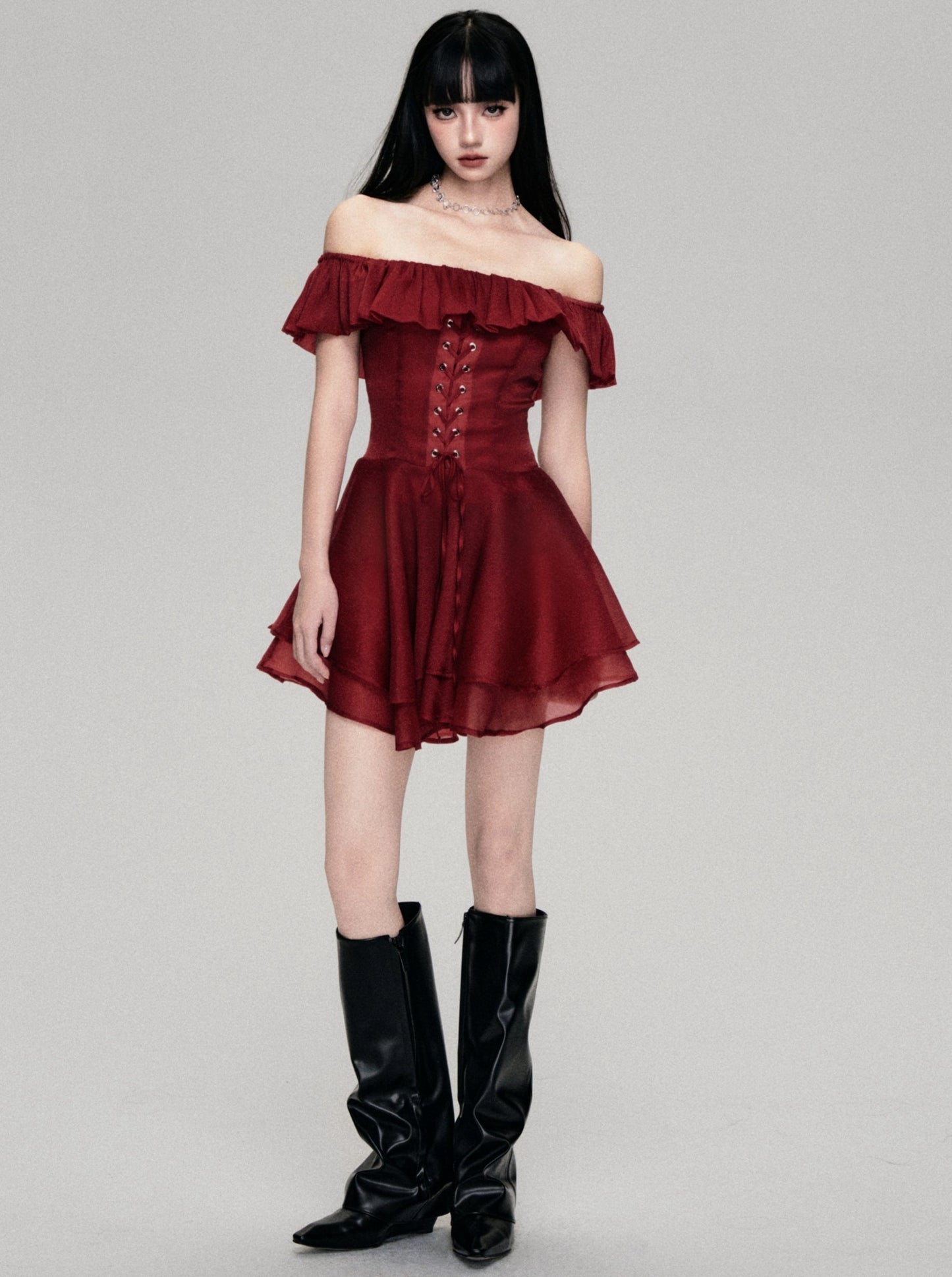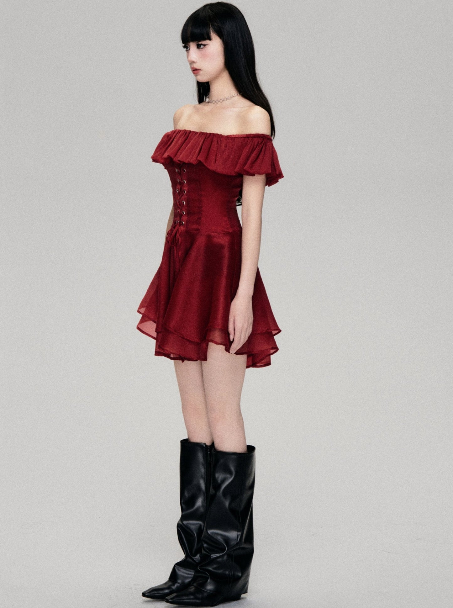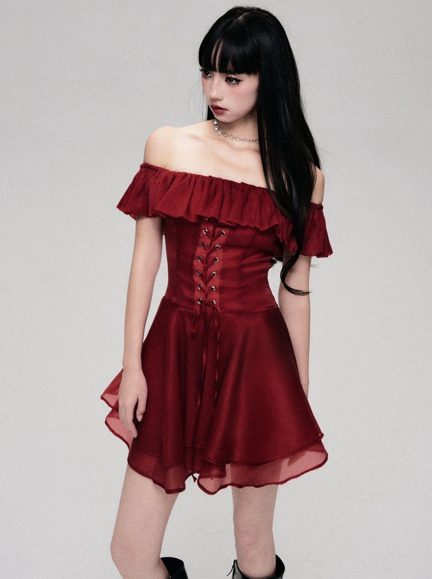 Red Rose Lace-up One-Shoulder Dress