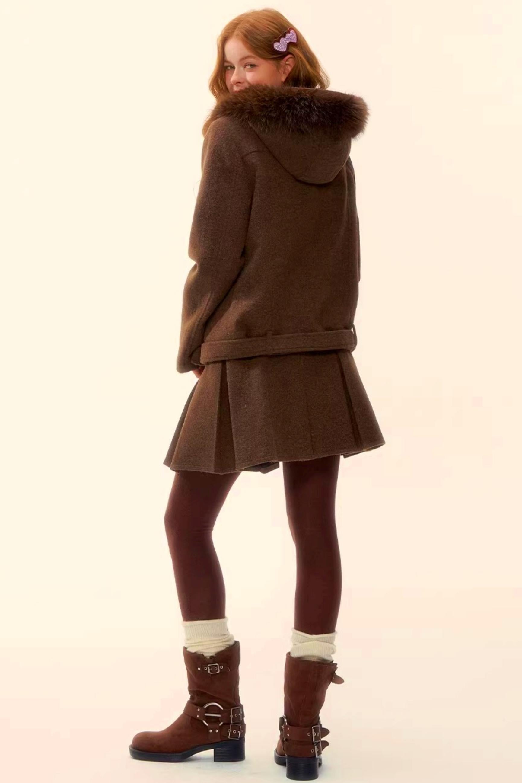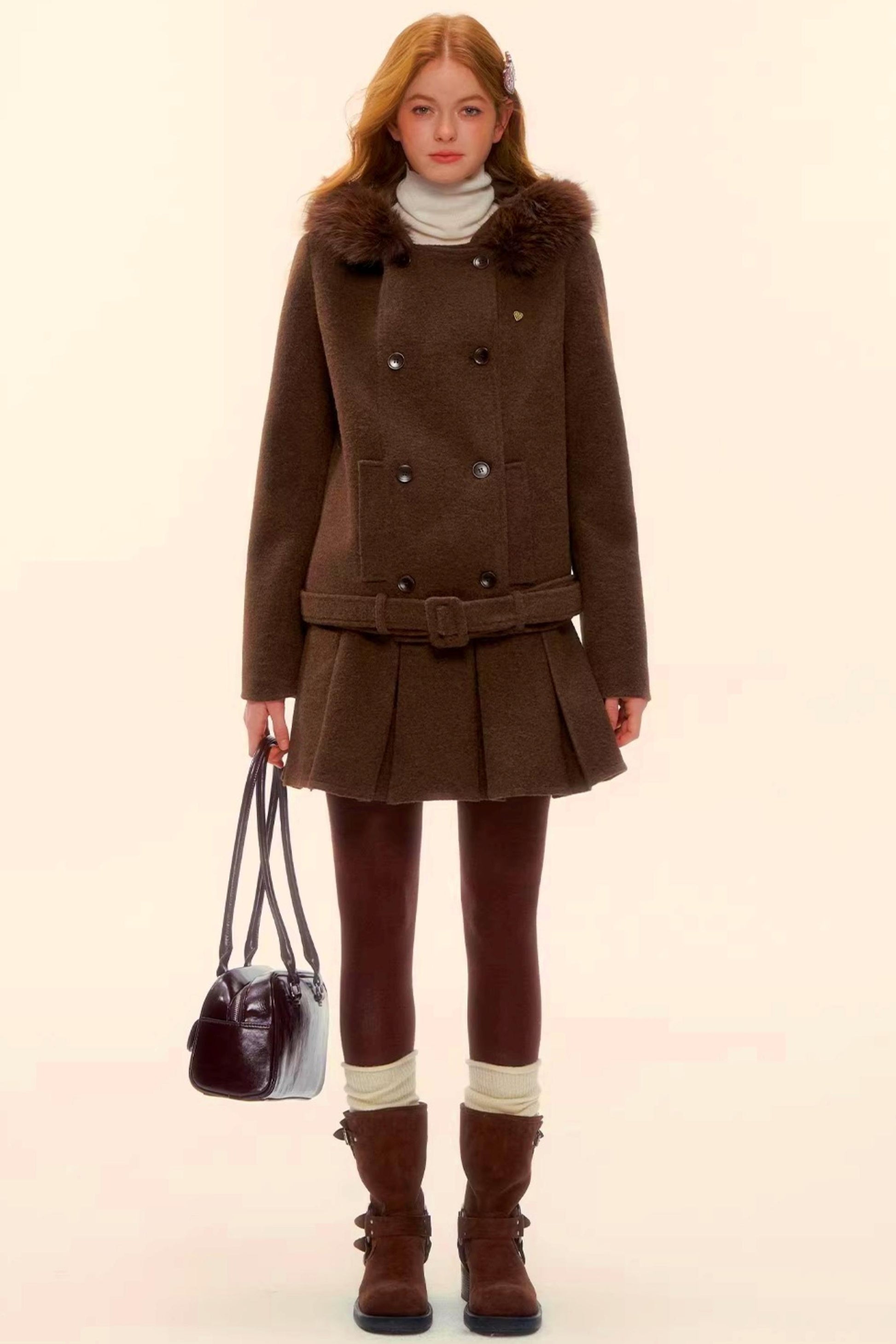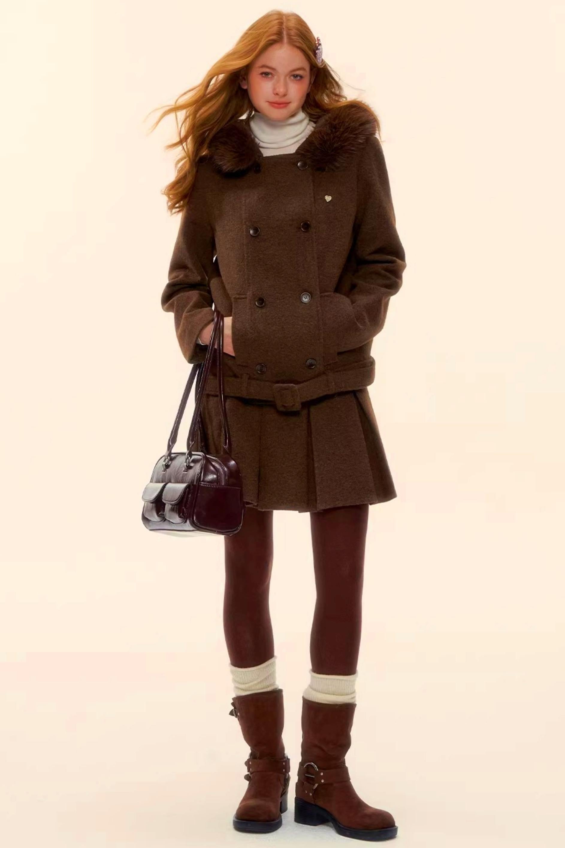 Retro Coffee Woolen Coat Skirt Set-Up
