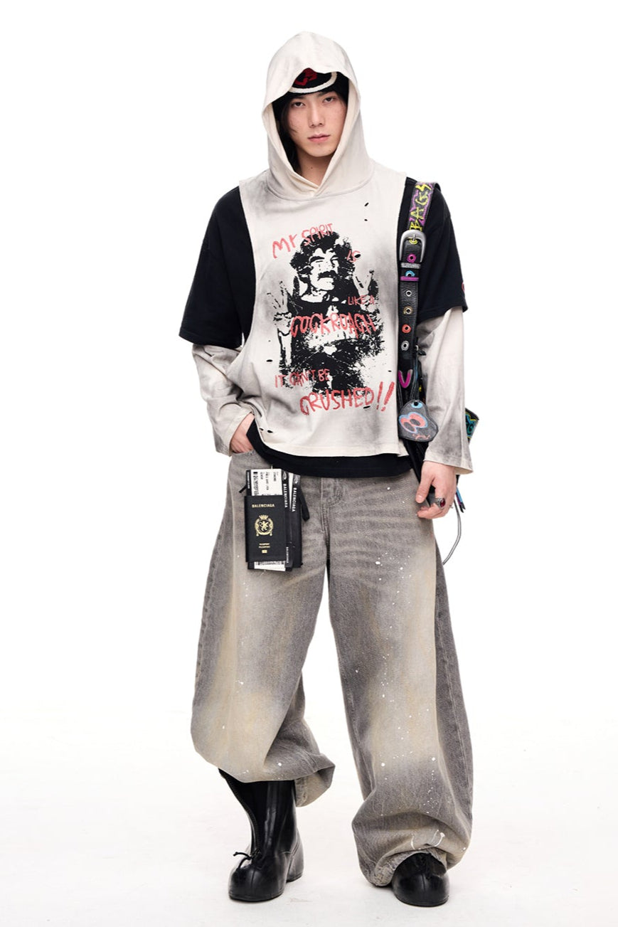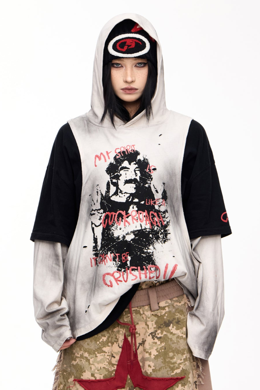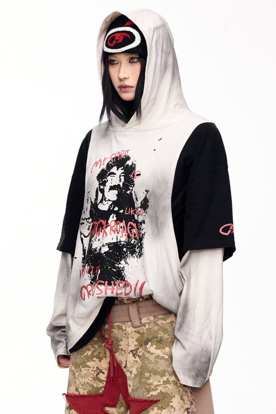 Rubbed Print Patchwork Long Sleeve Hoodie